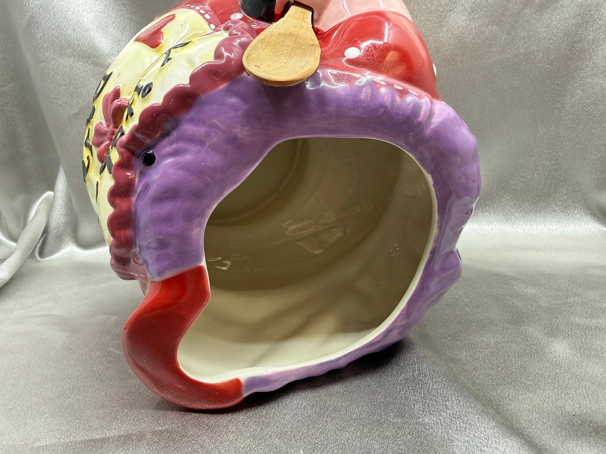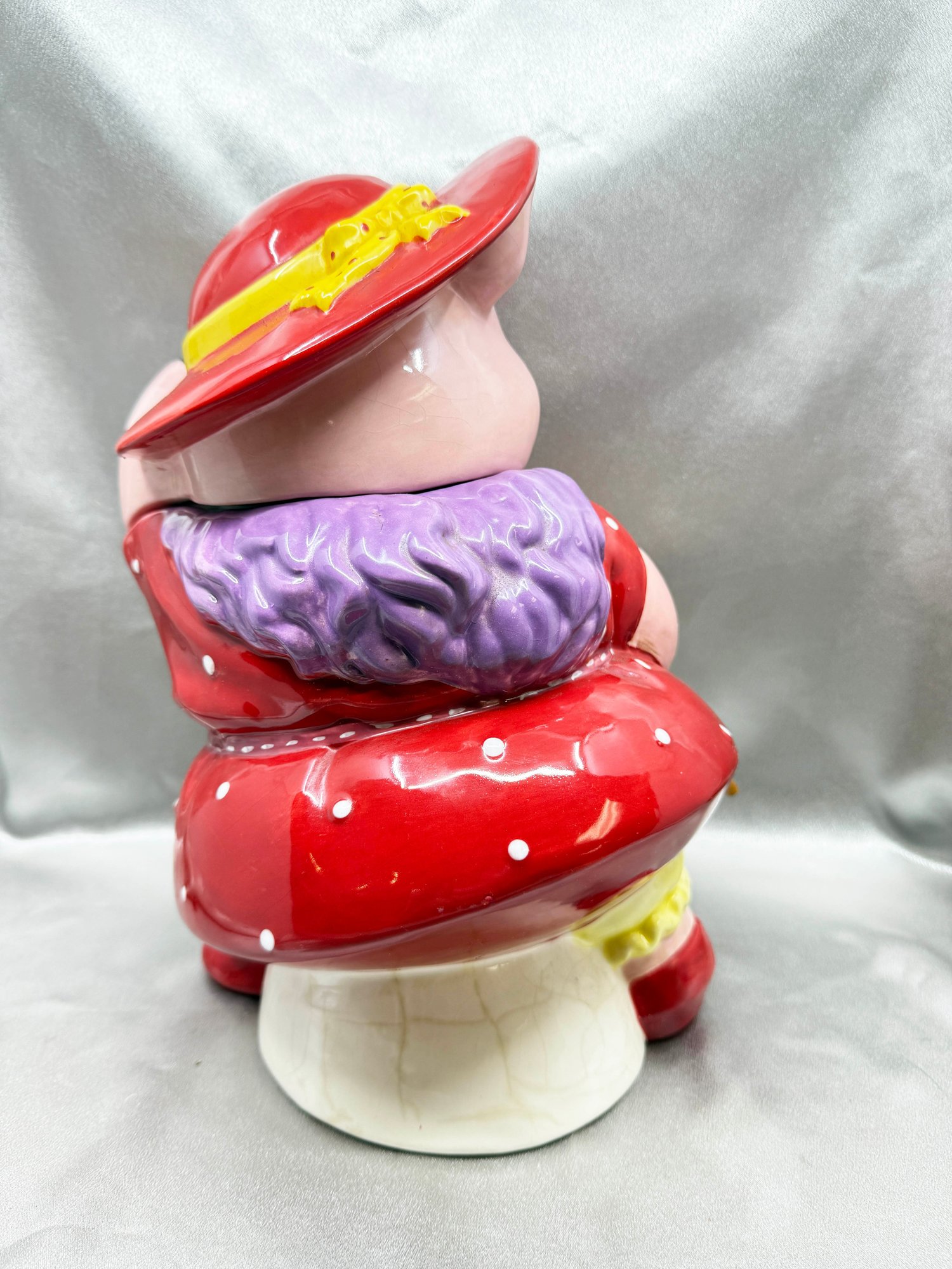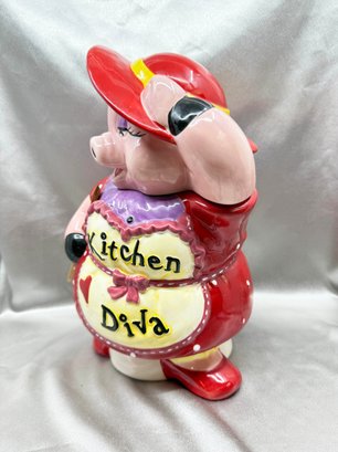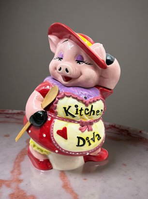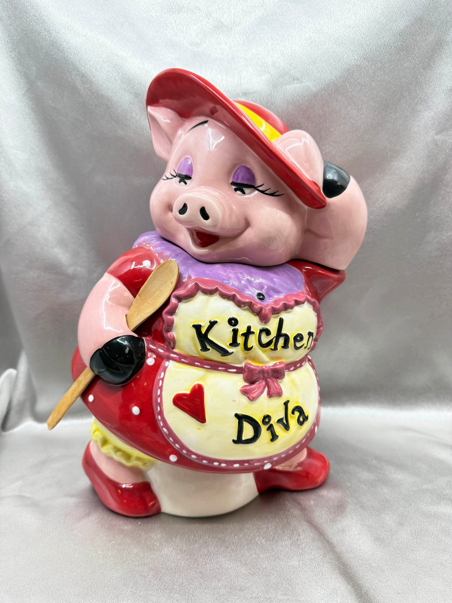 (A-23) VINTAGE CERAMIC HAND PAINTED "KITCHEN DIVA" PIG THEMED COOKIE JAR W/WOODEN SPOON-12 1/2" X 8"-MERCURIES