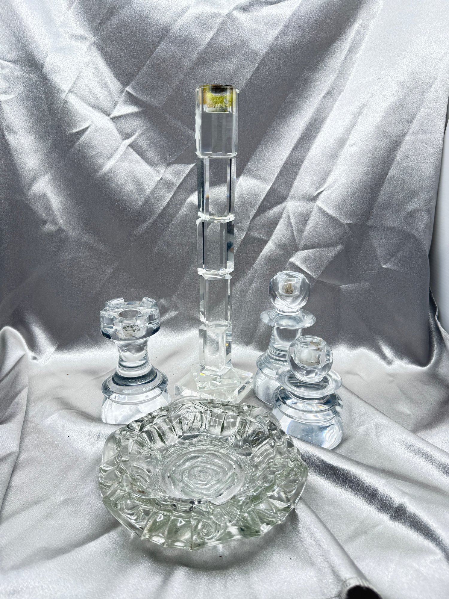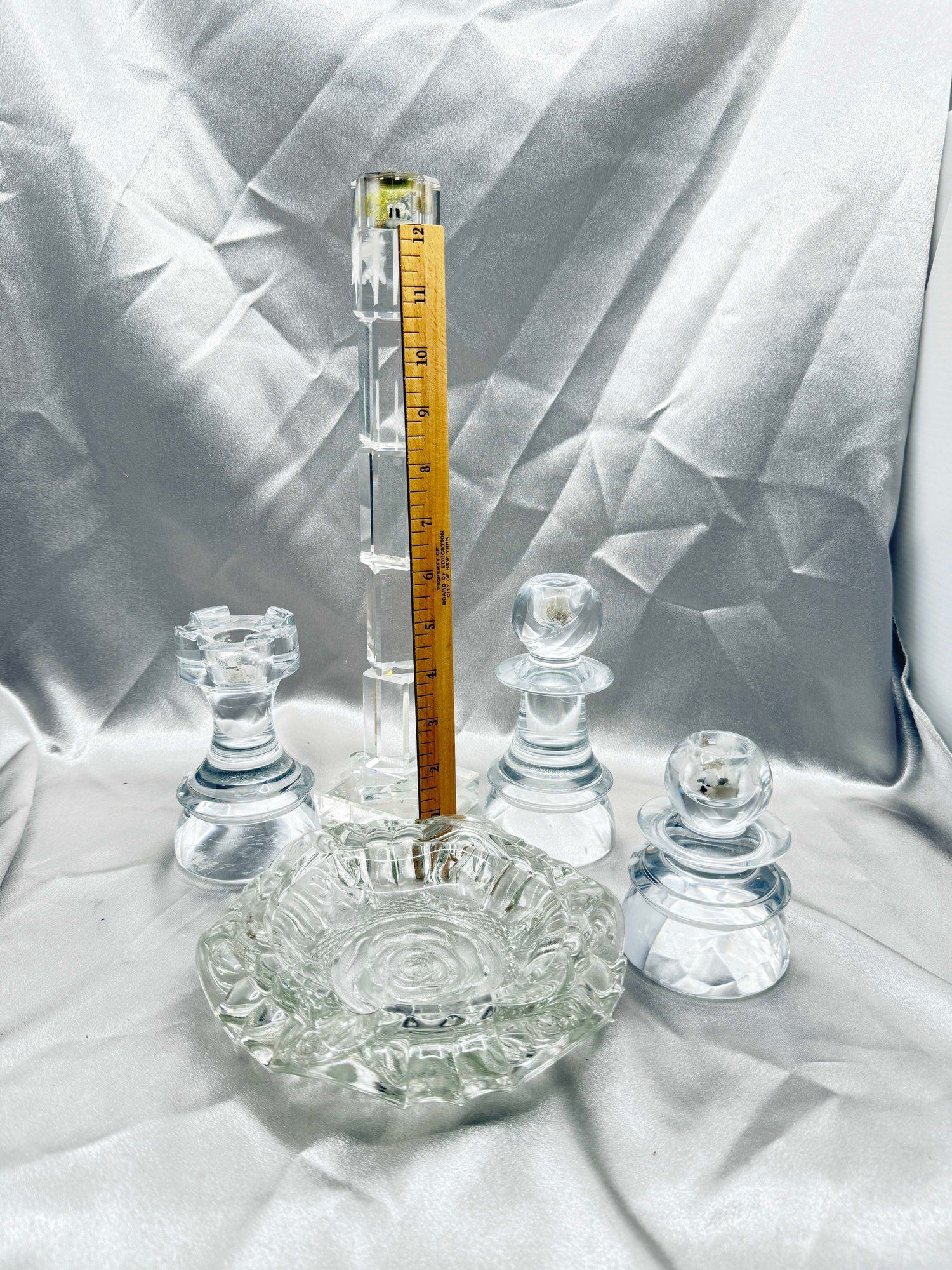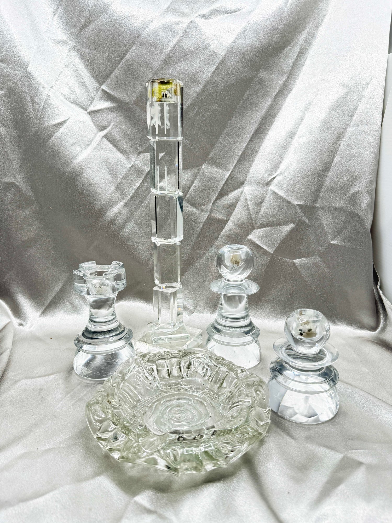 (A-23) VINTAGE SET OF 5 PIECES OF GLASS CRYSTAL-3 CANDLESTICK HOLDERS CHESS PIECES