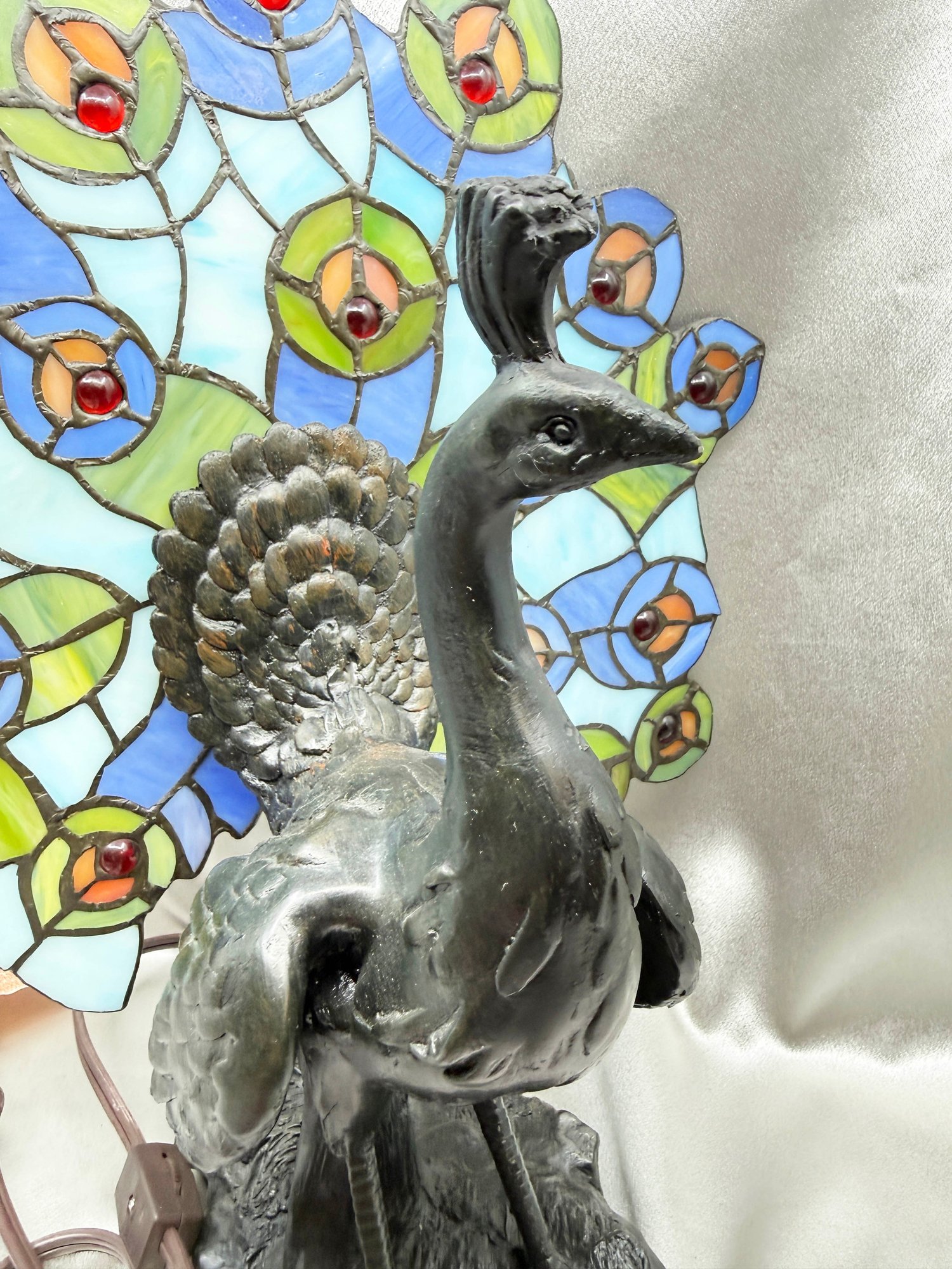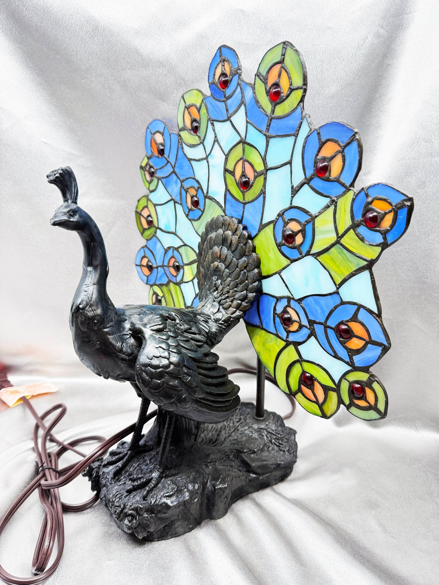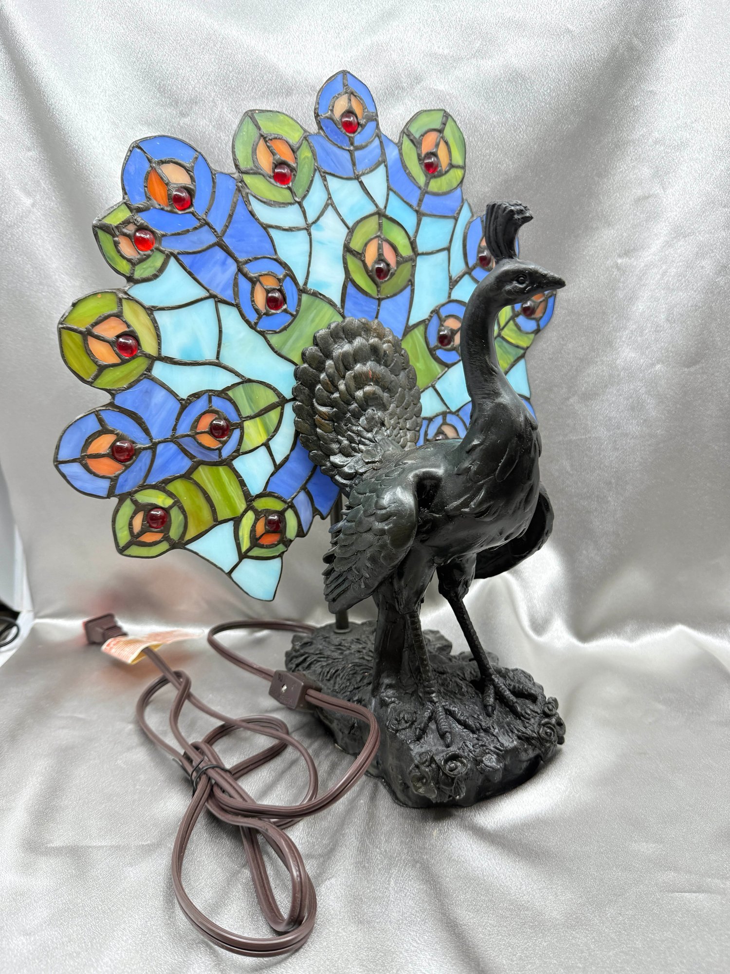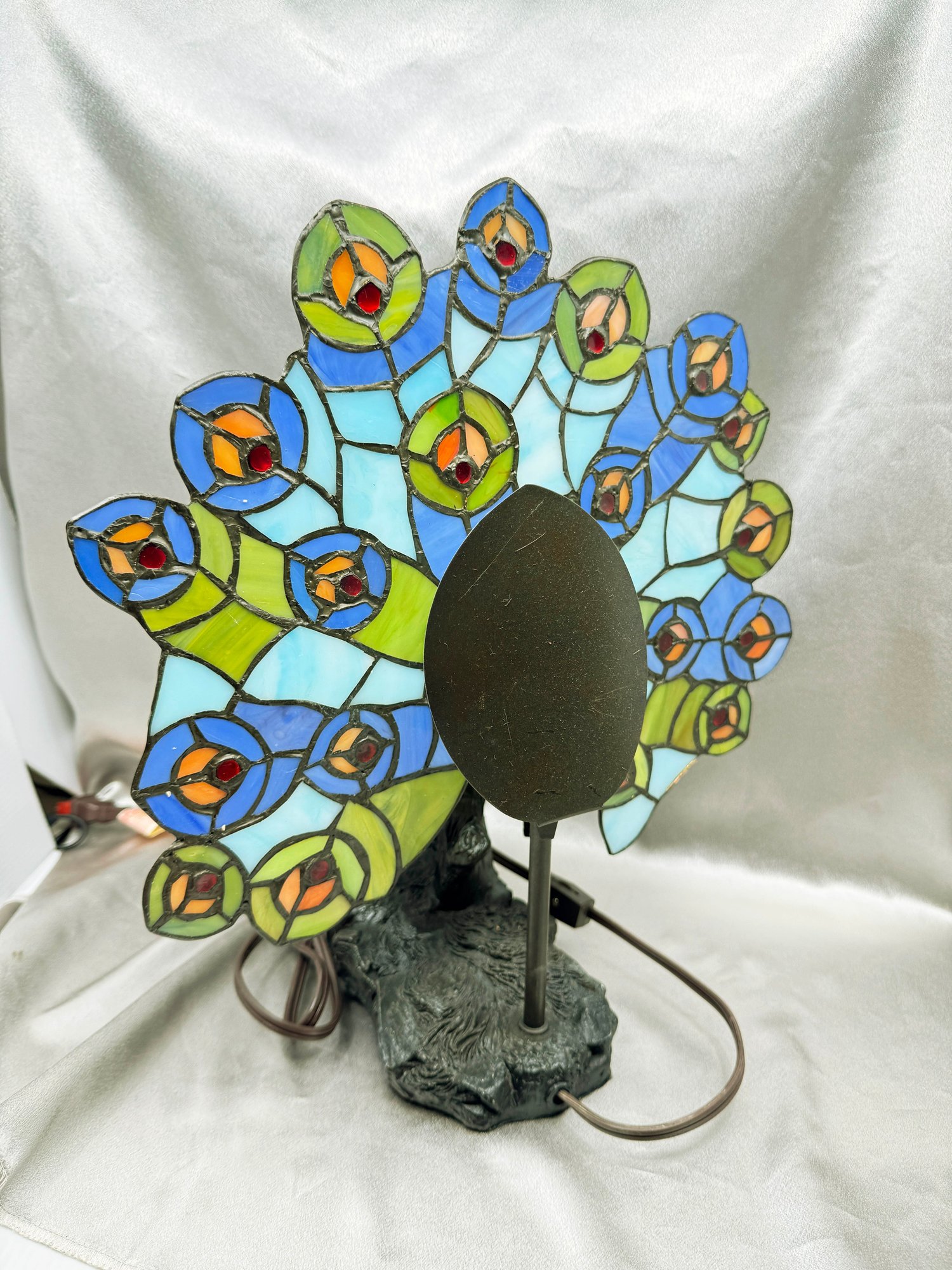 (A-24) PEACOCK TABLE LAMP WITH STAINED GLASS TAIL - TIFFANY STYLE - 15" TALL - WORKING