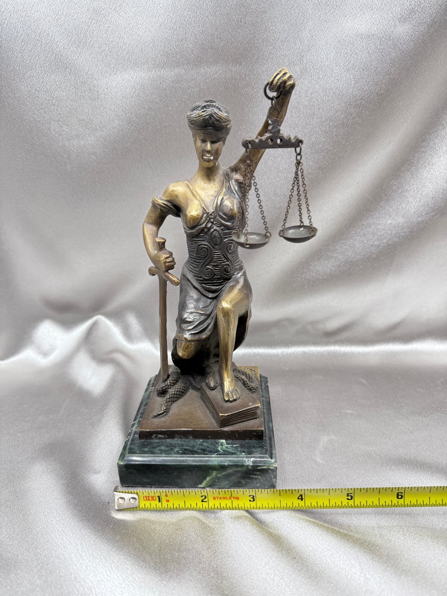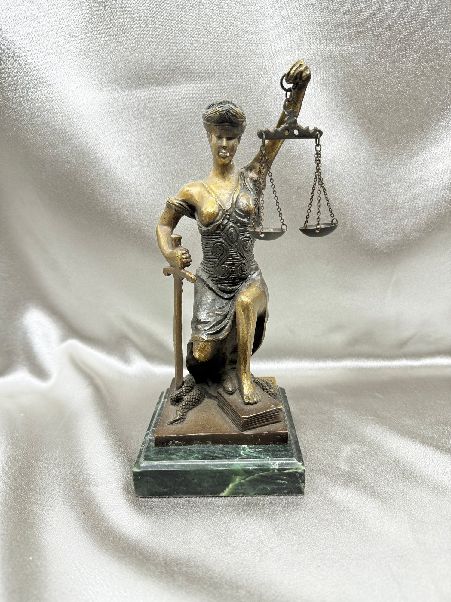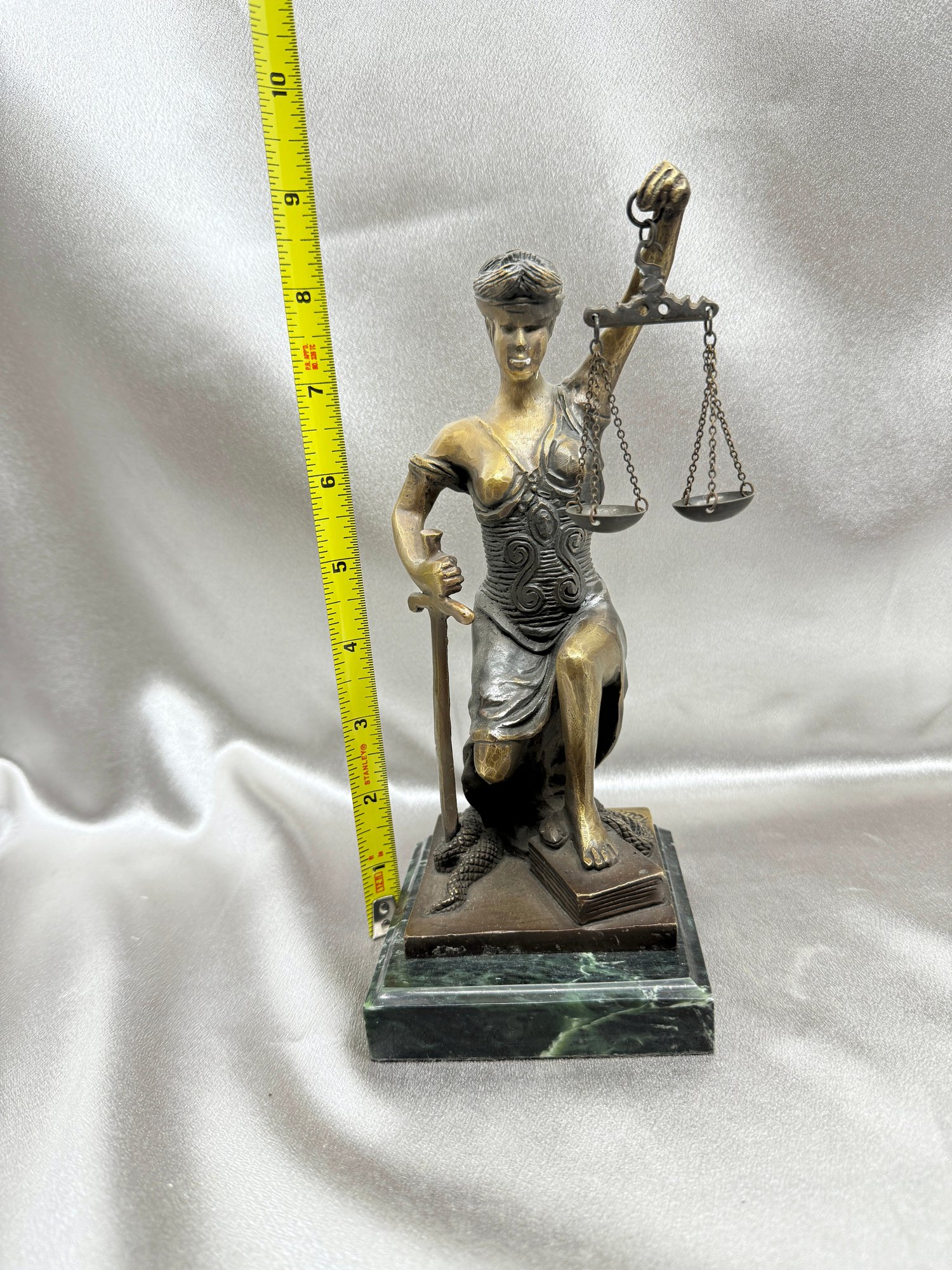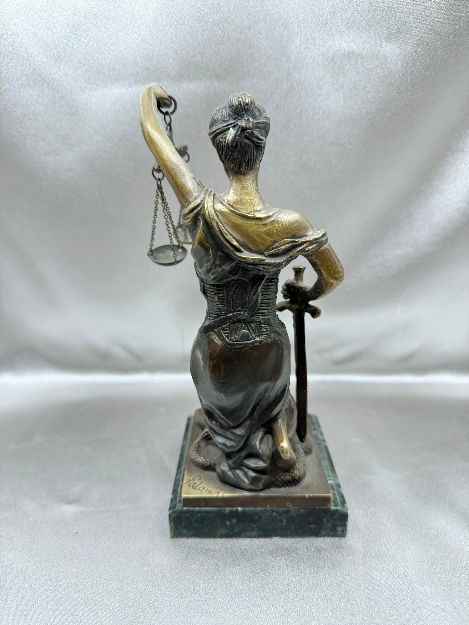 (A-26) VINTAGE BRONZE FINISH LADY JUSTICE" KNEELING HOLDING SCALES & SWORD-SIGNED