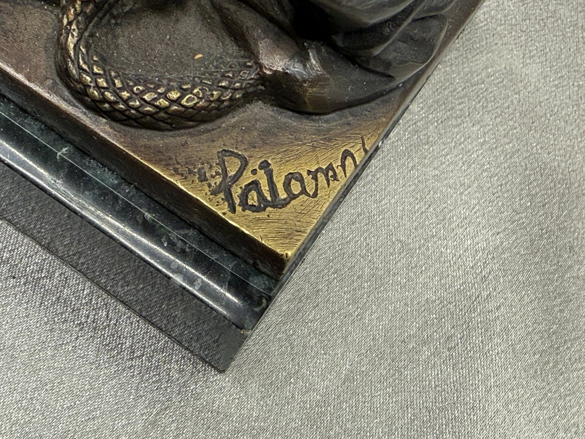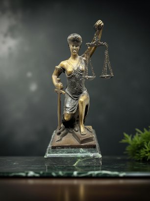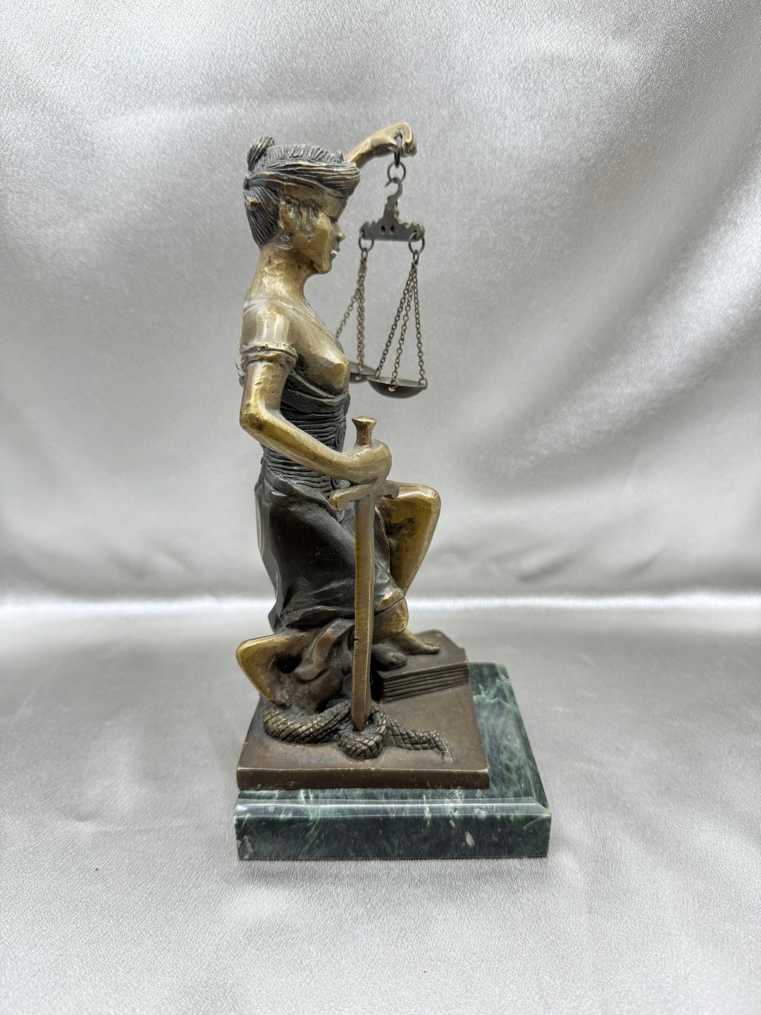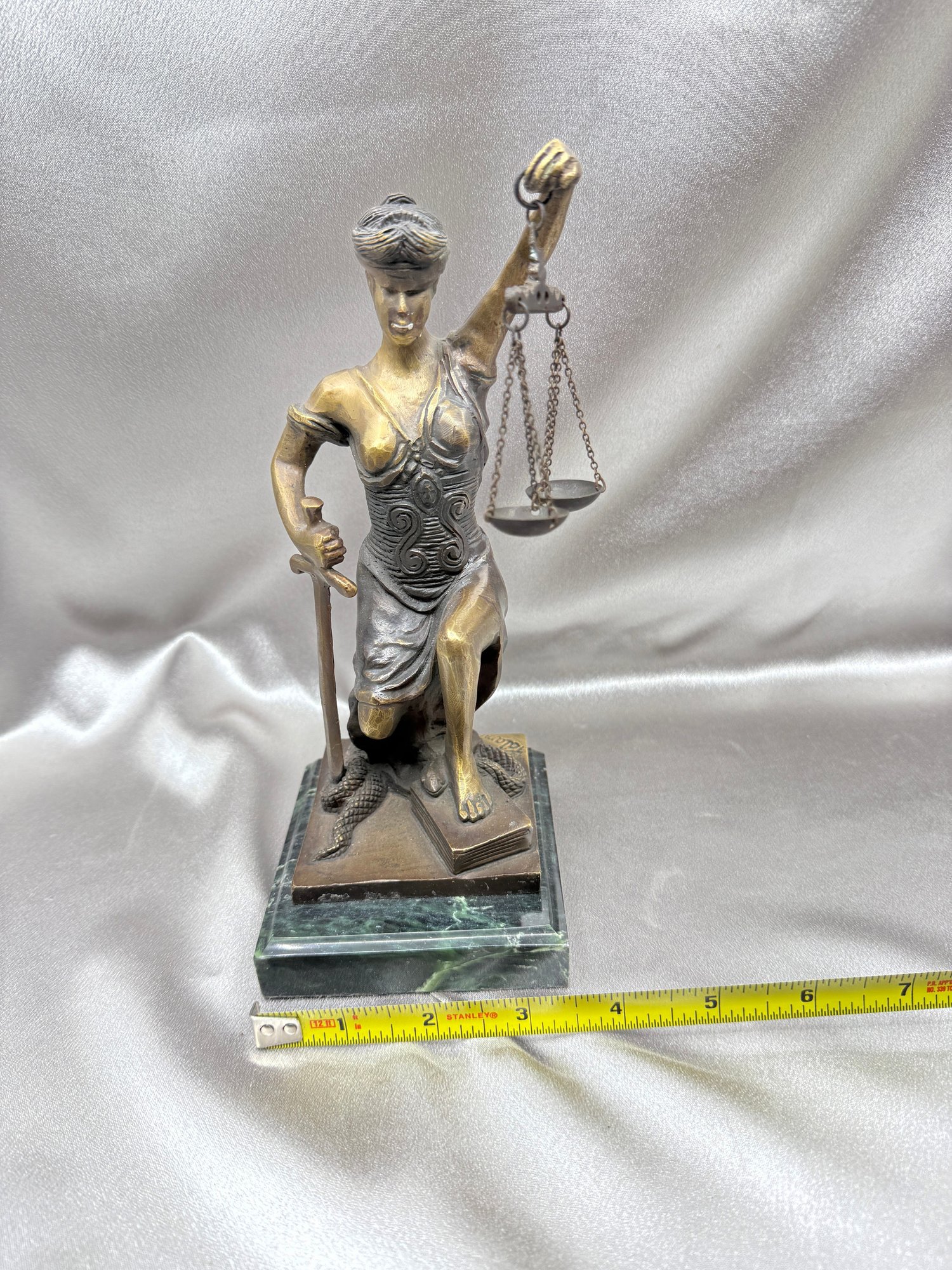 (A-26) VINTAGE BRONZE FINISH LADY JUSTICE" KNEELING HOLDING SCALES & SWORD-SIGNED