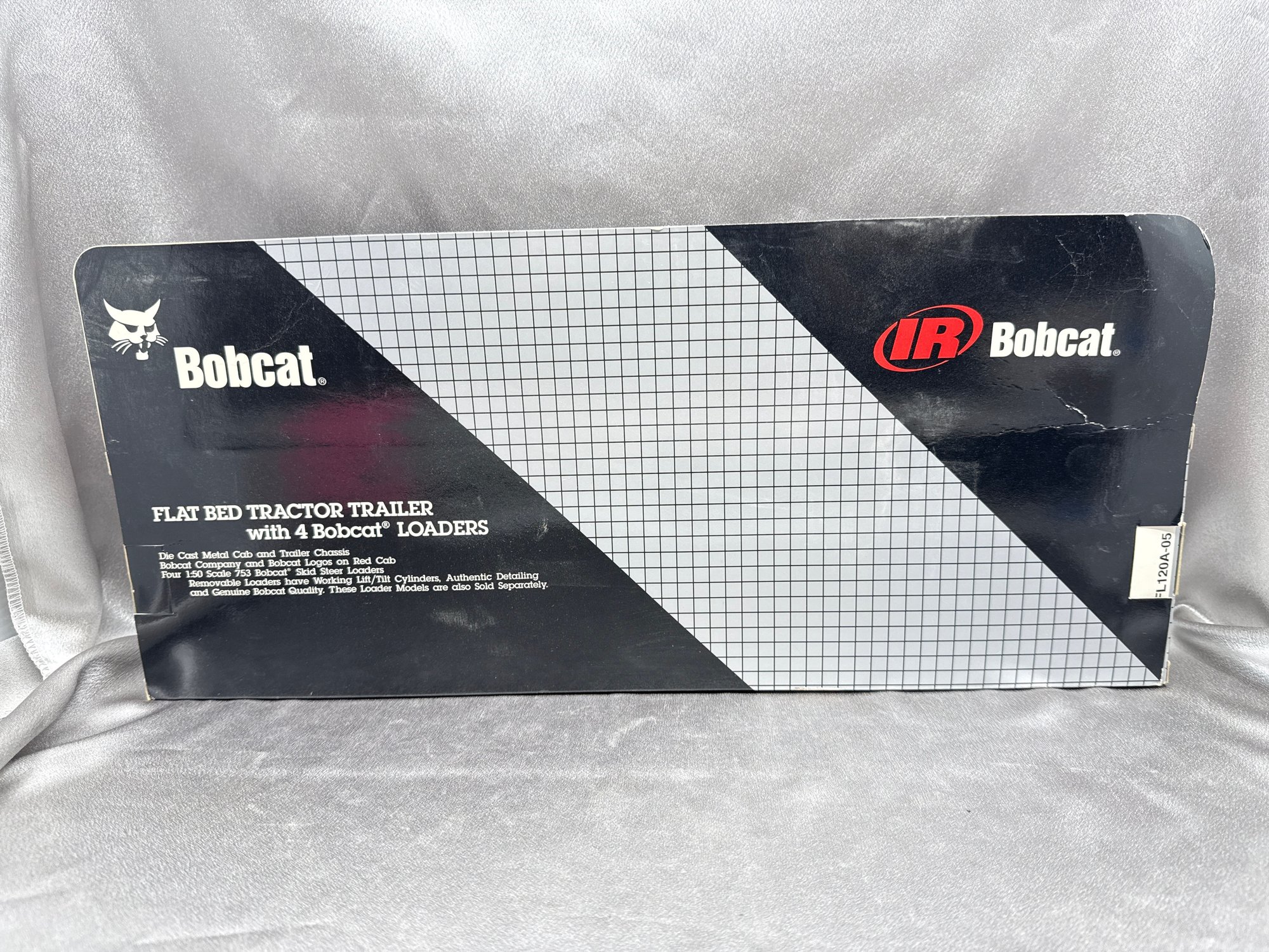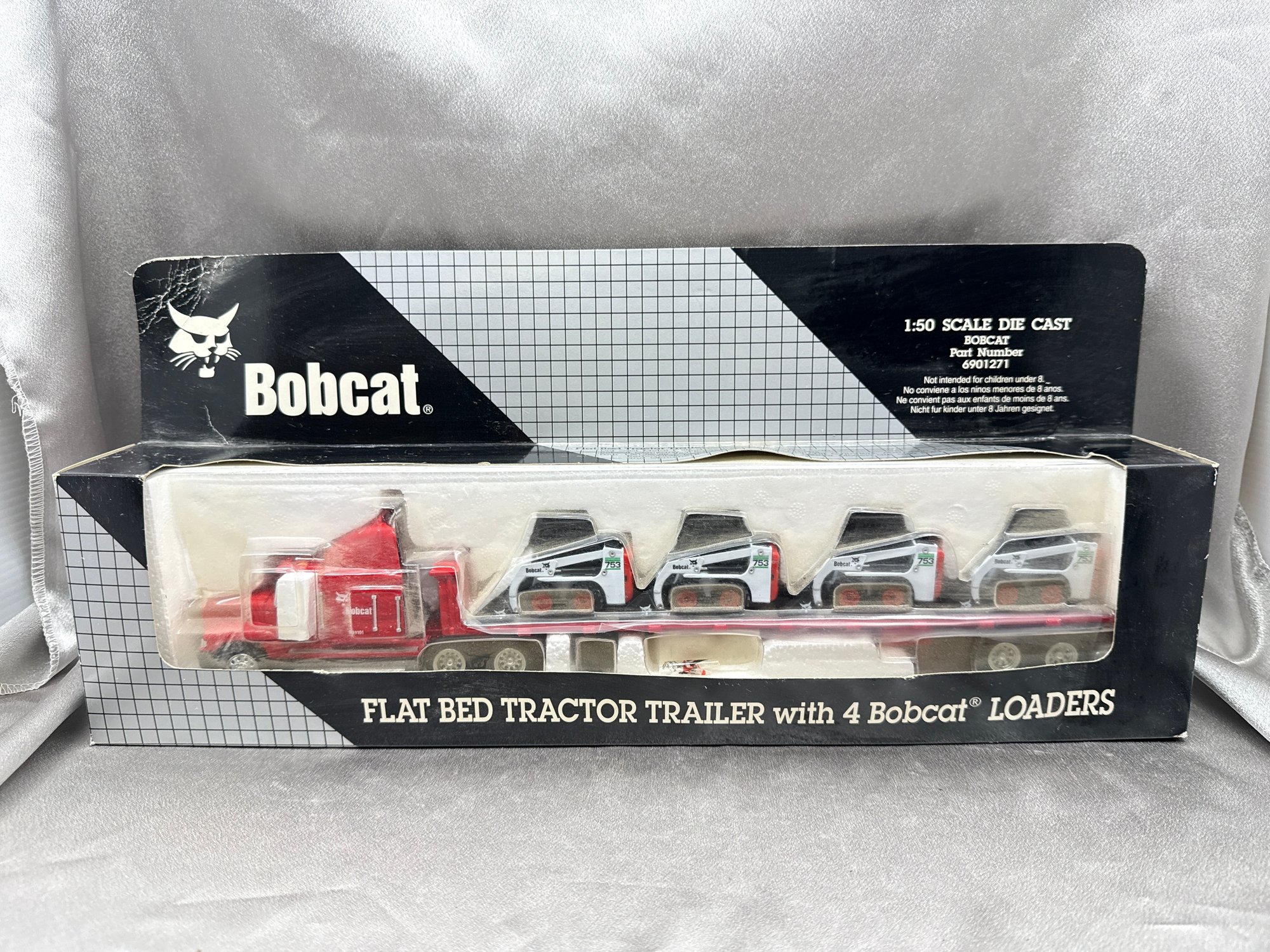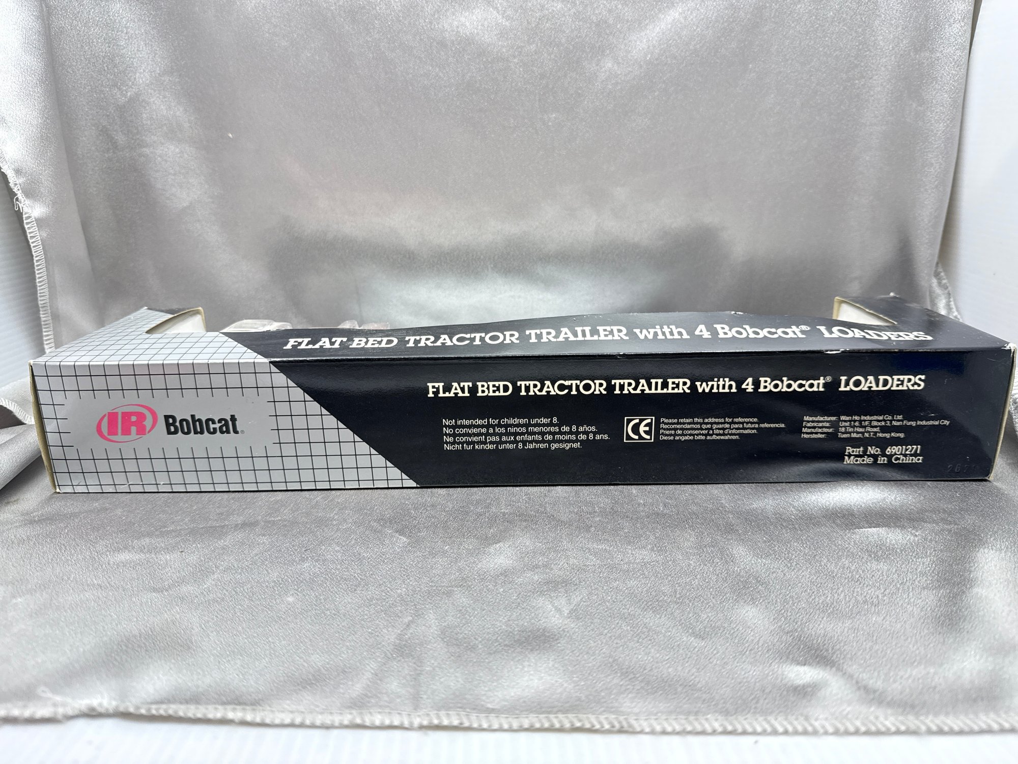 (A-41) VINTAGE NEW IN BOX-BOBCAT FLAT BED TRACTOR TRAILER-W/4 BOBCAT LOADERS-DIE CAST MODEL