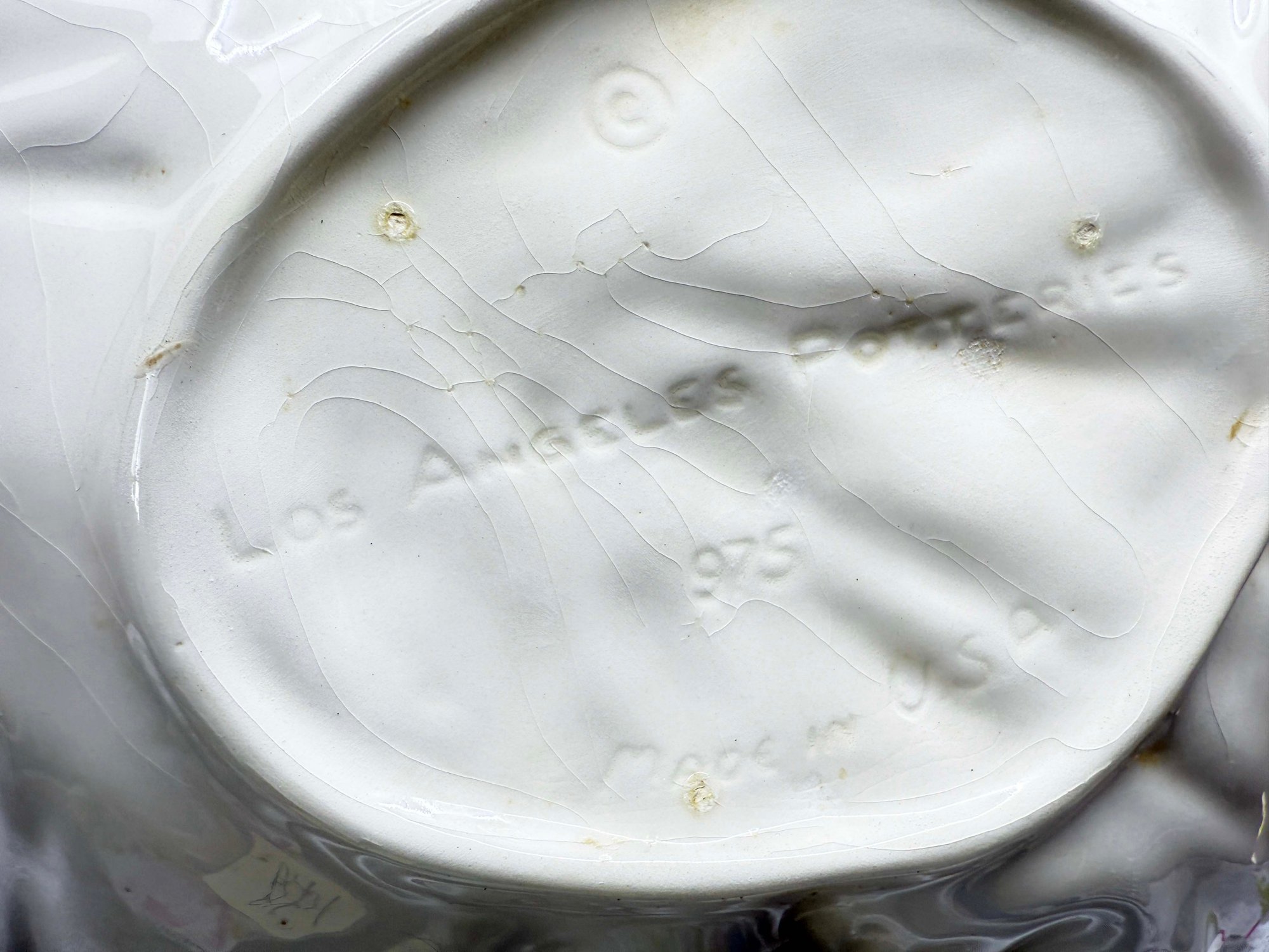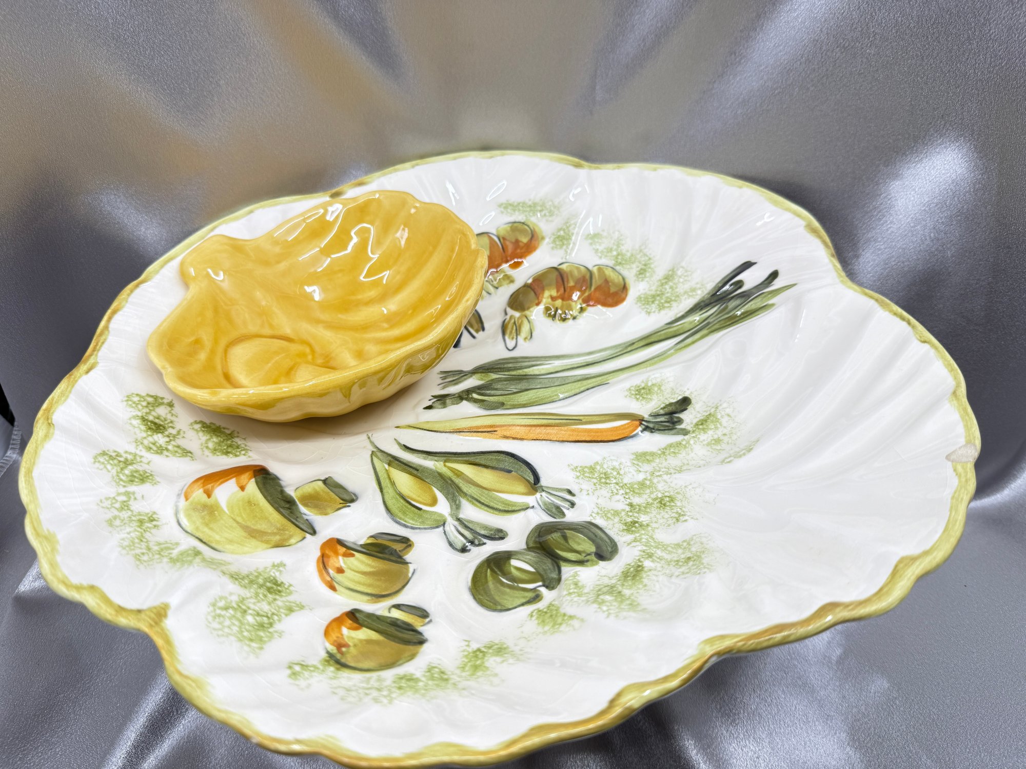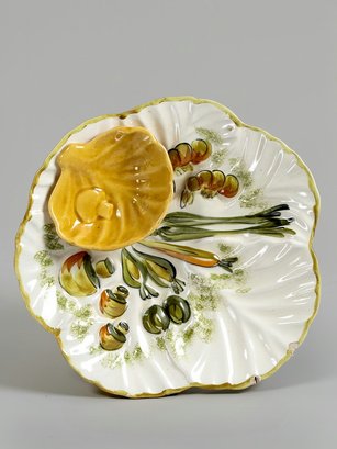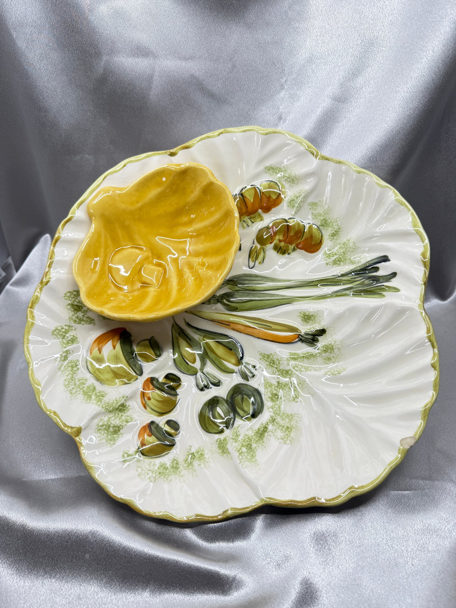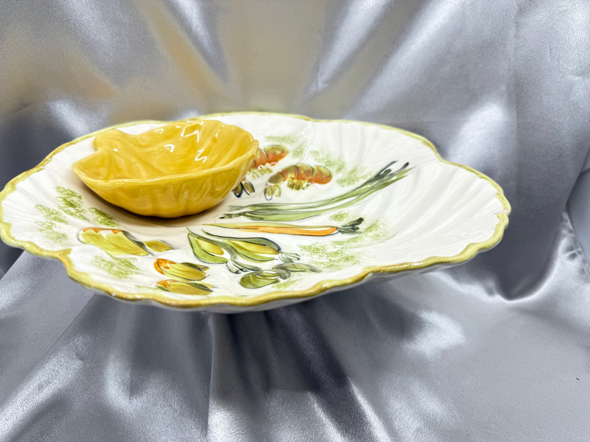 (A-44) VINTAGE HAND PAINTED CERAMIC SERVING PLATTER W/ATTACHED DIP BOWL-LOS ANGELES POTTERY