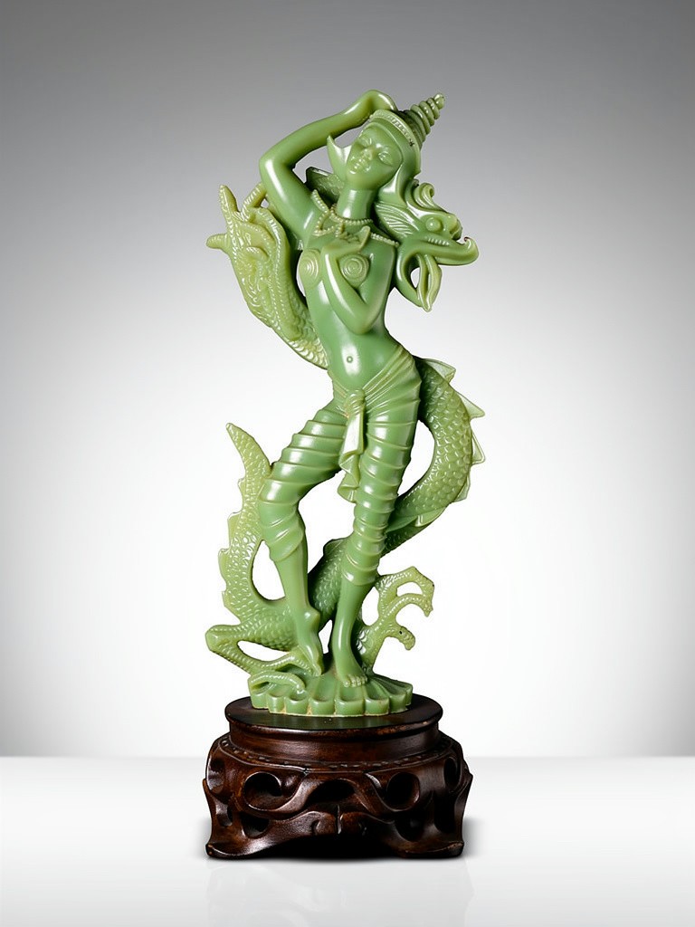 (A-48) VINTAGE FAUX JADE GREEN CARVED SCULPTURE CHINESE WOMAN ON WOOD BASE