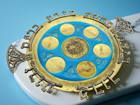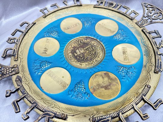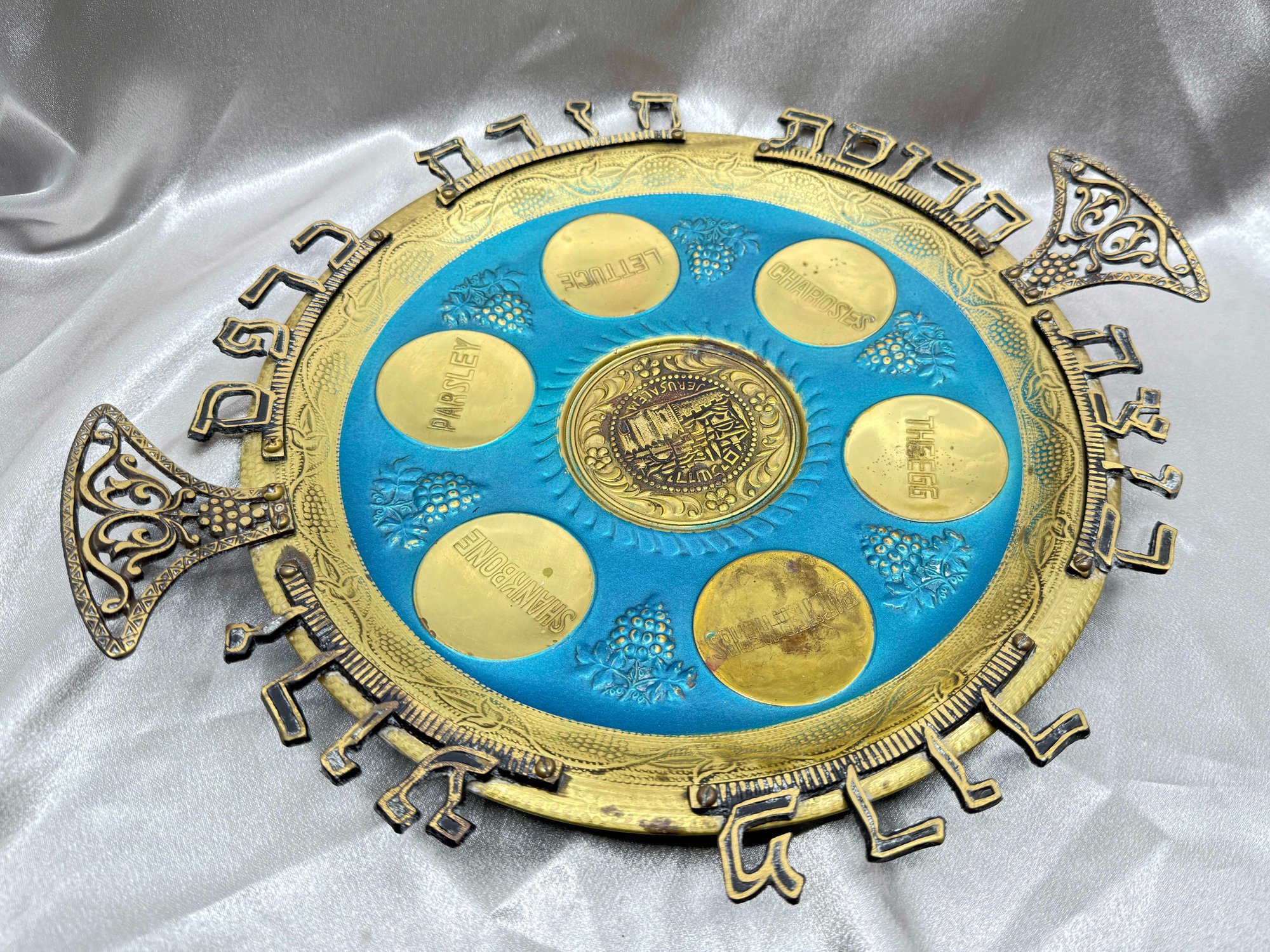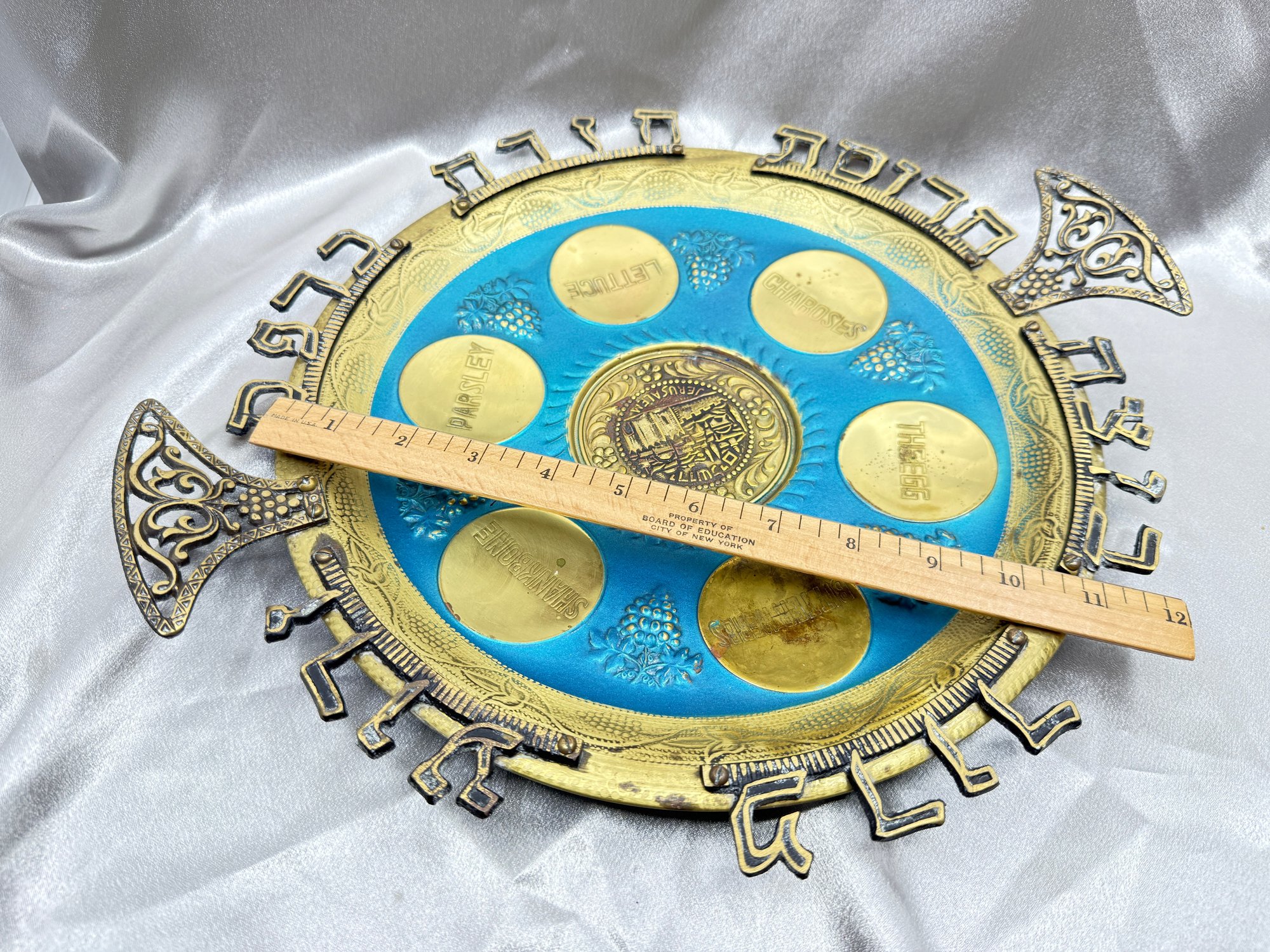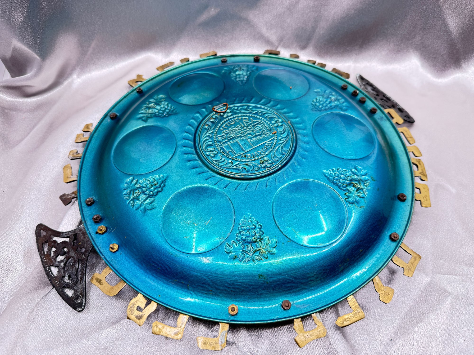 (A-49) VINTAGE BRASS AND BLUE ENAMEL PASSOVER SEDER PLATE-ISRAEL