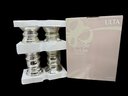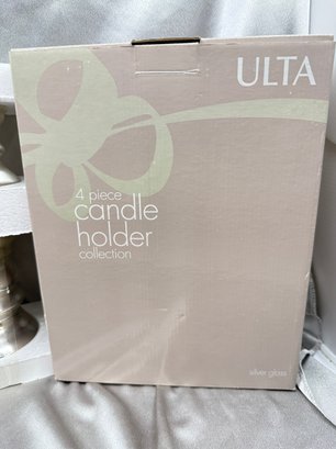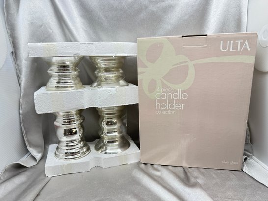 (A-49) VINTAGE NEW IN BOX ULTA 4 PIECE CANDLE HOLDERS-SILVER GLASS