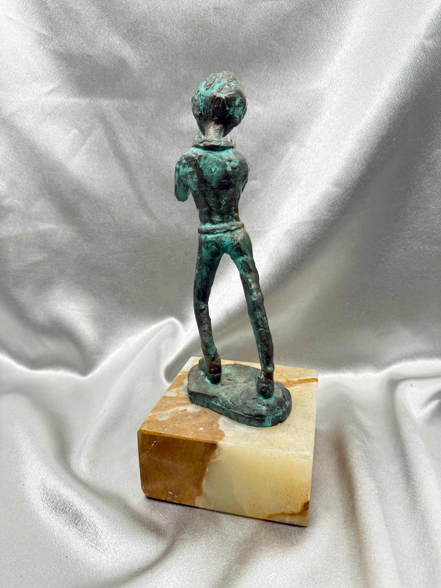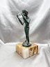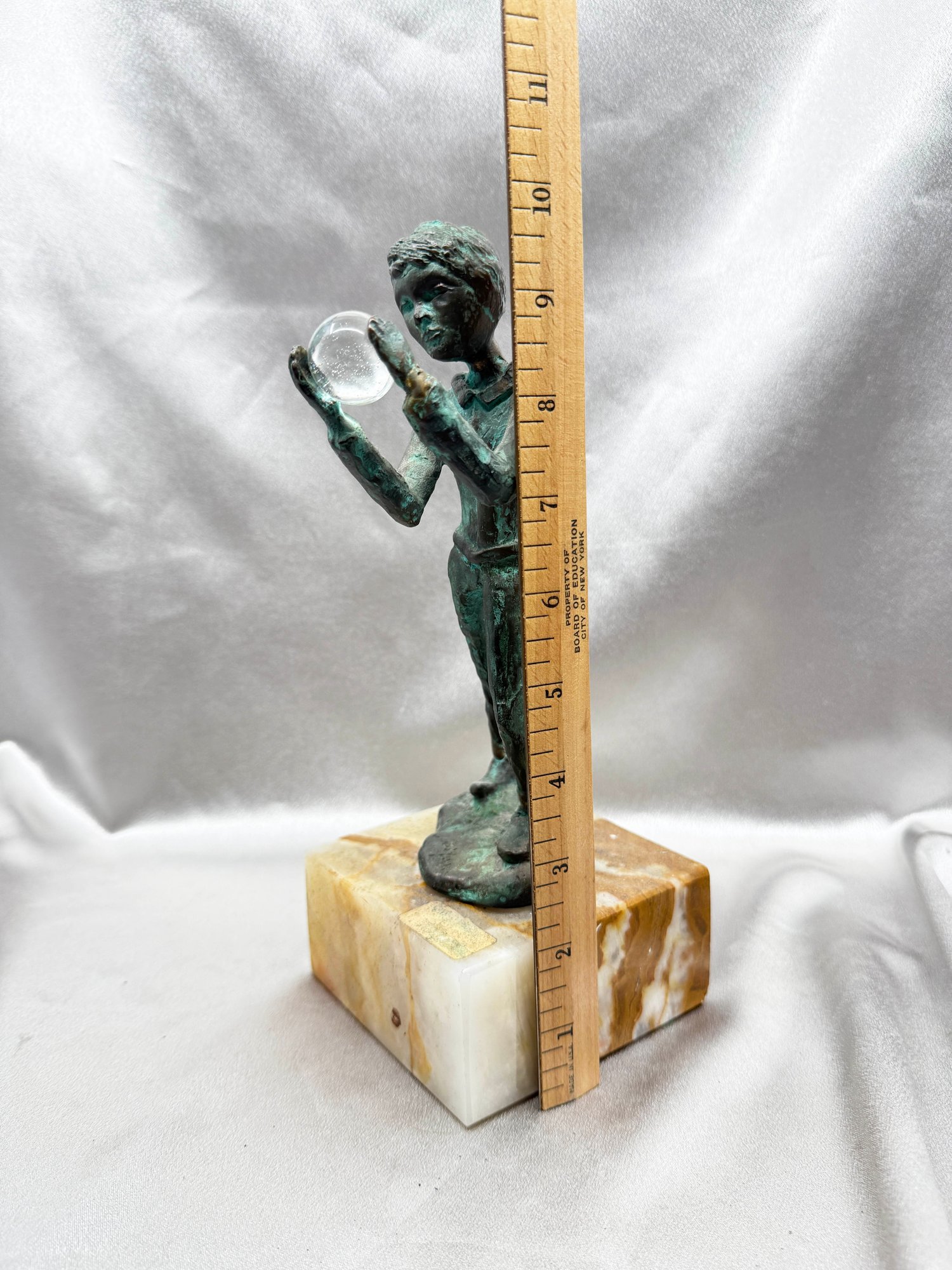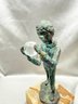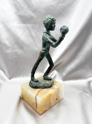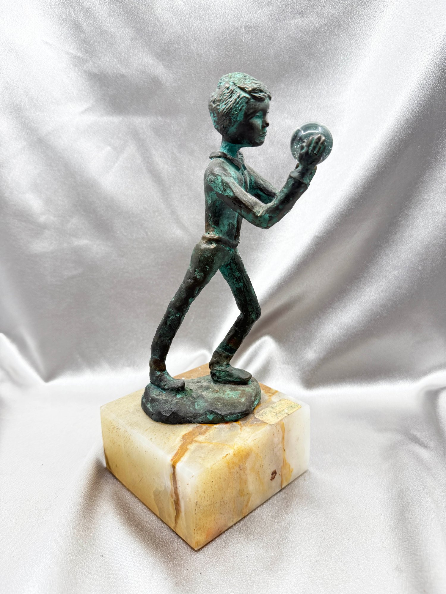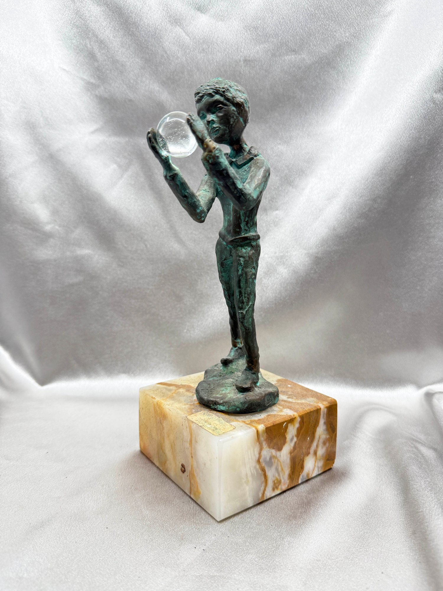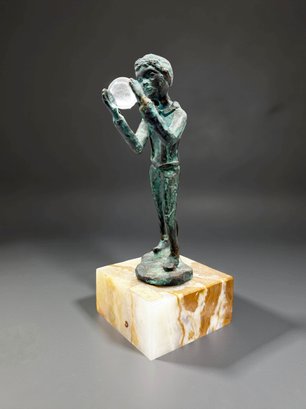(A-57) VINTAGE BRONZE SCULPTURE BOY HOLDING A GLASS ORB MOUNTED ON AN ONYX BASE-SIGNED BIJAN?