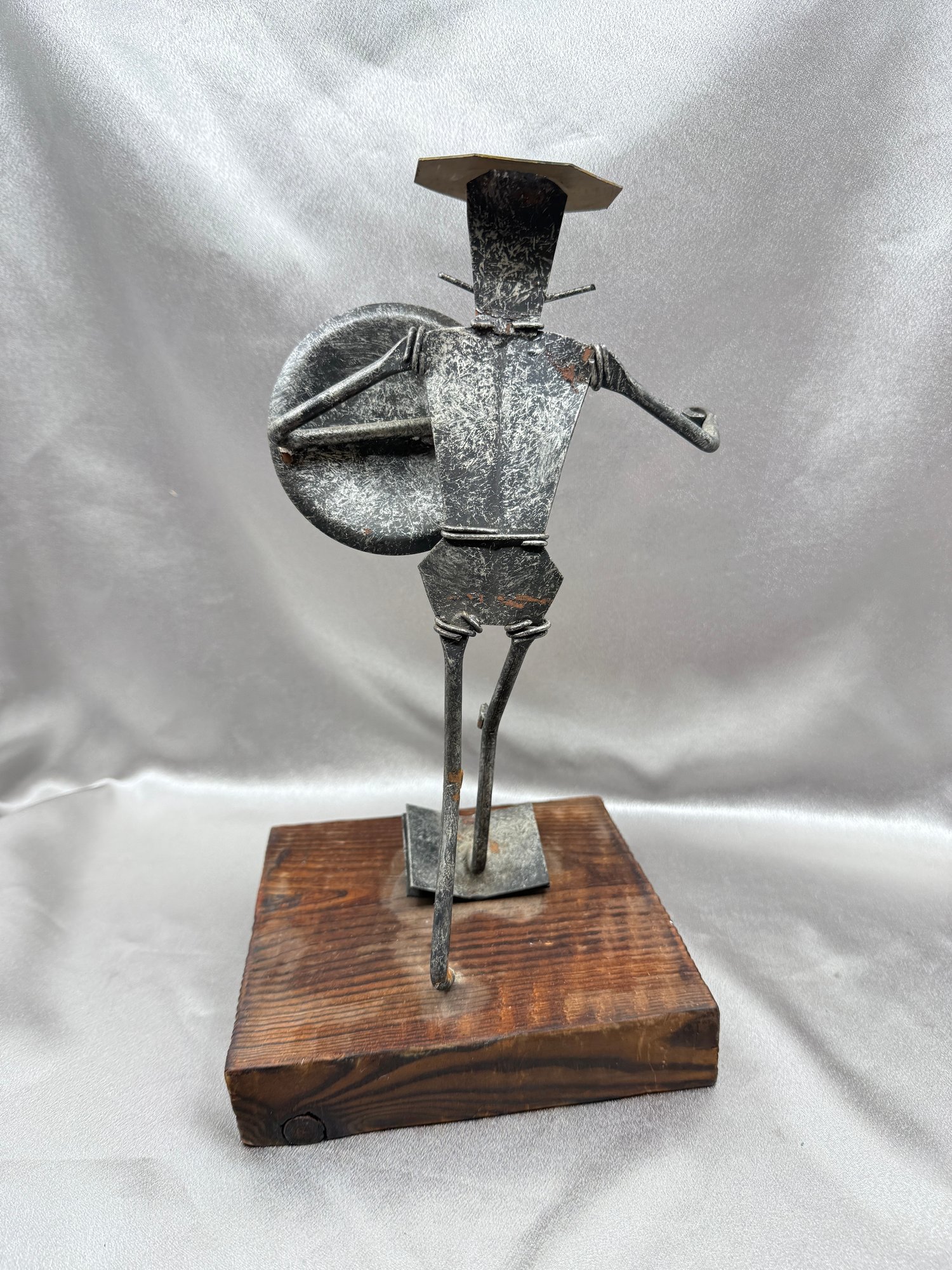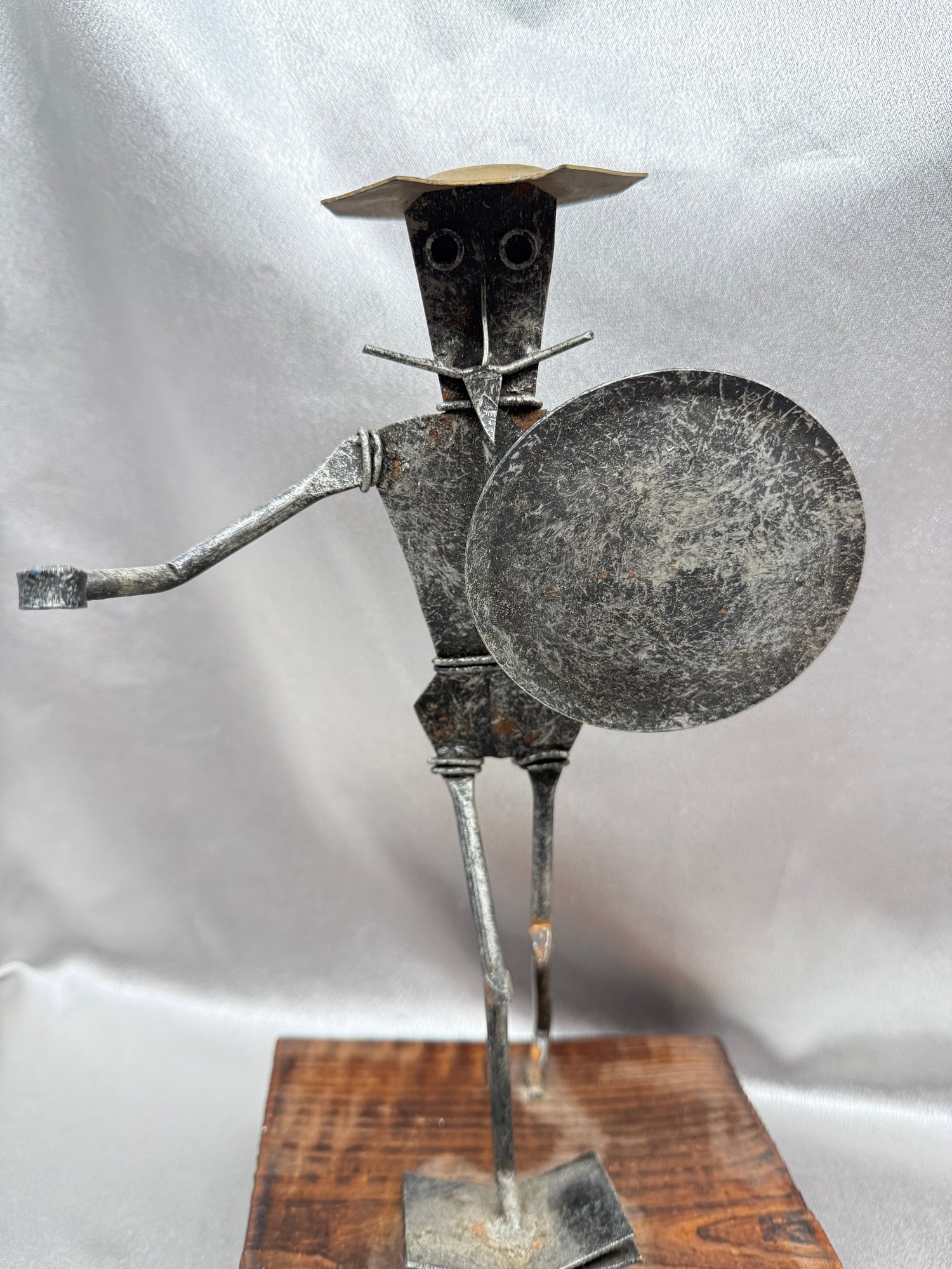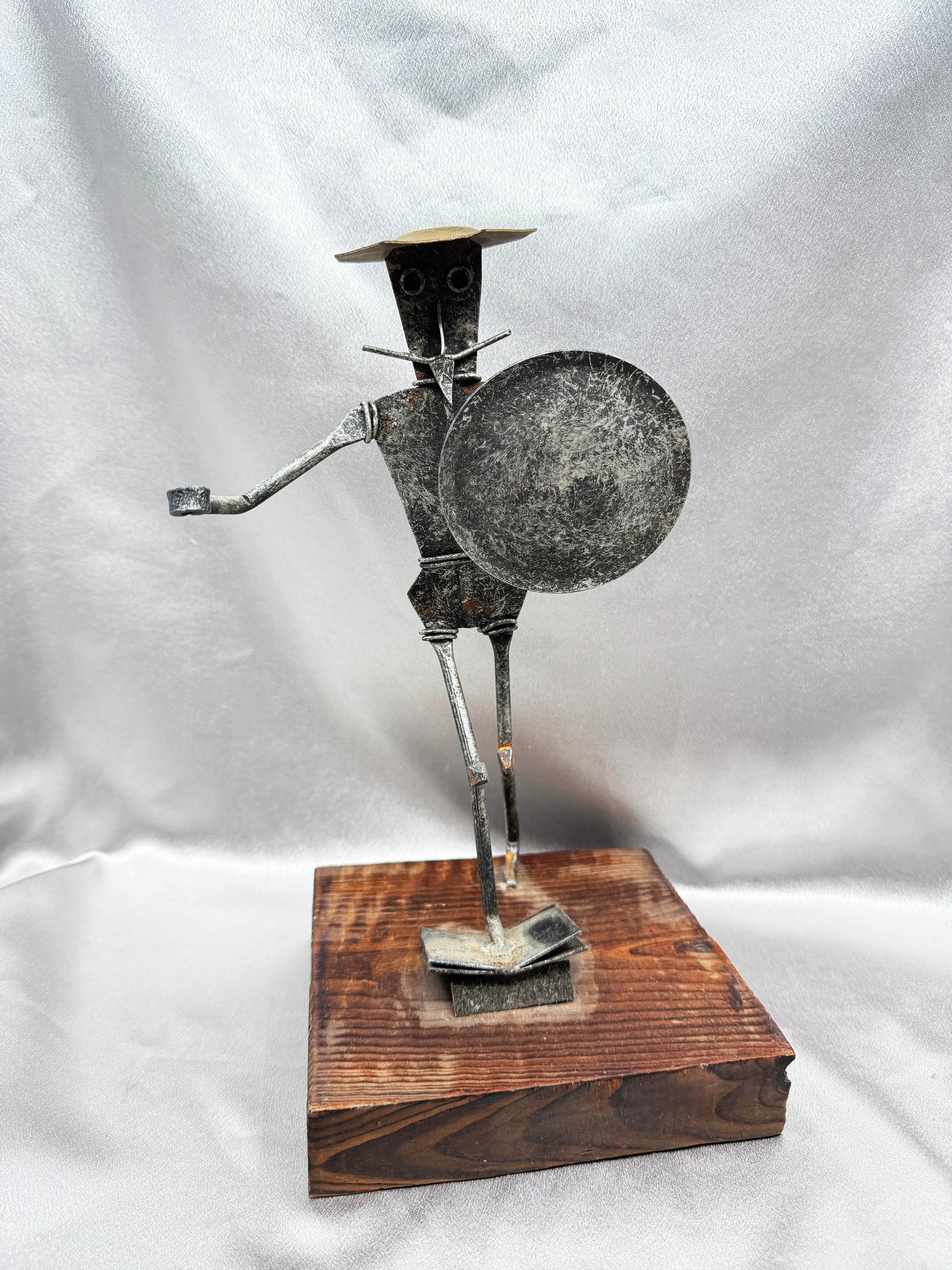 (A-61) VINTAGE MID CENTURY MODERN BRUTALIST DON QUIXOTE SCULPTURE SCRAP METAL-WOOD BASE-SPAIN-MISSING SPEAR