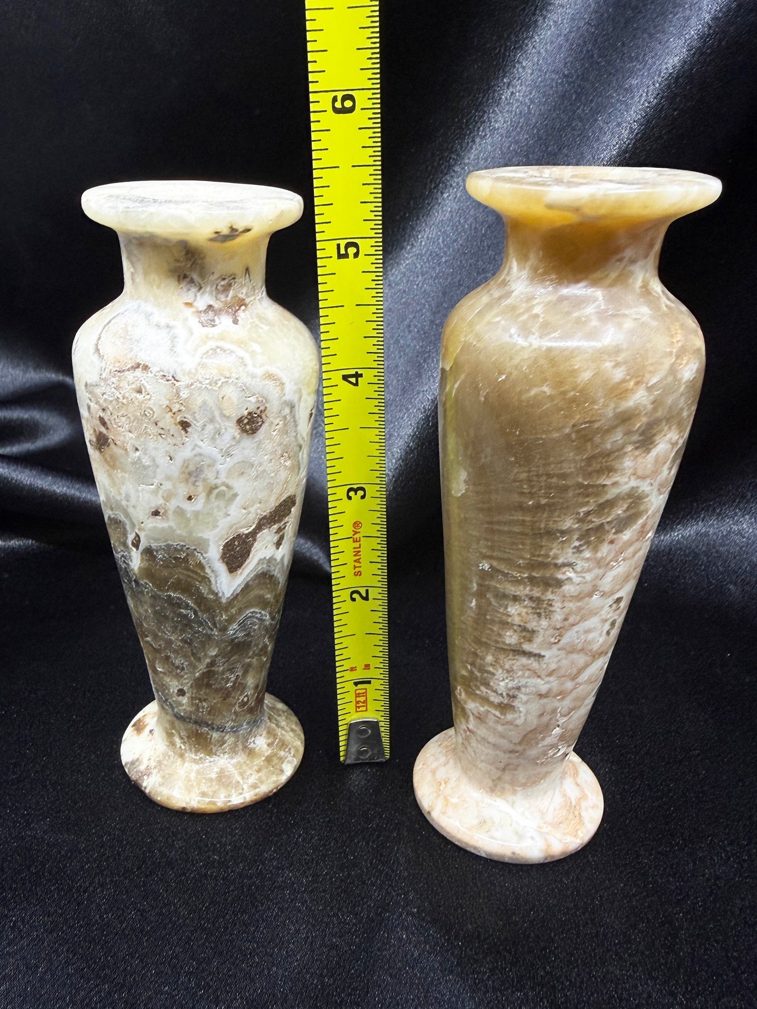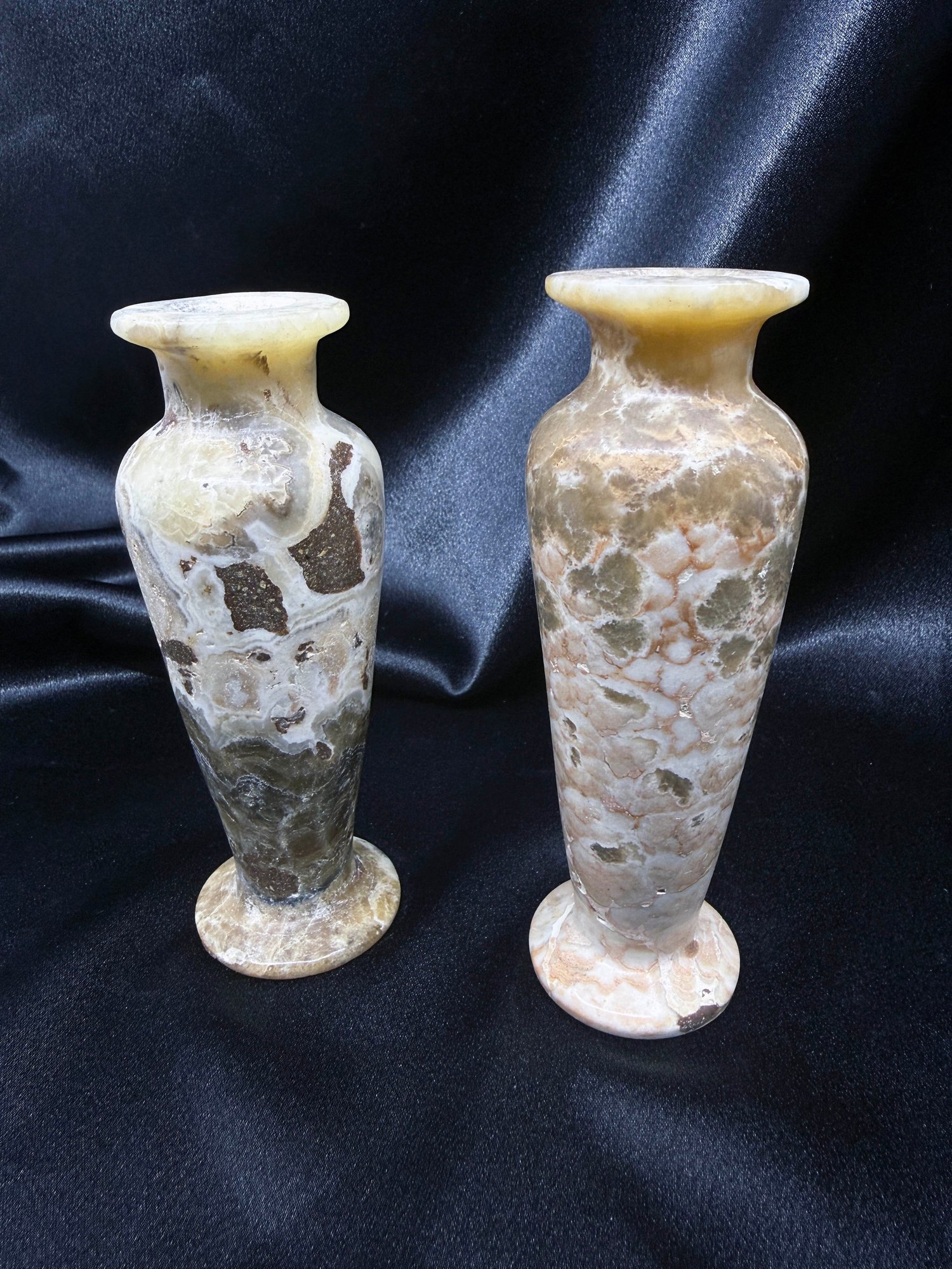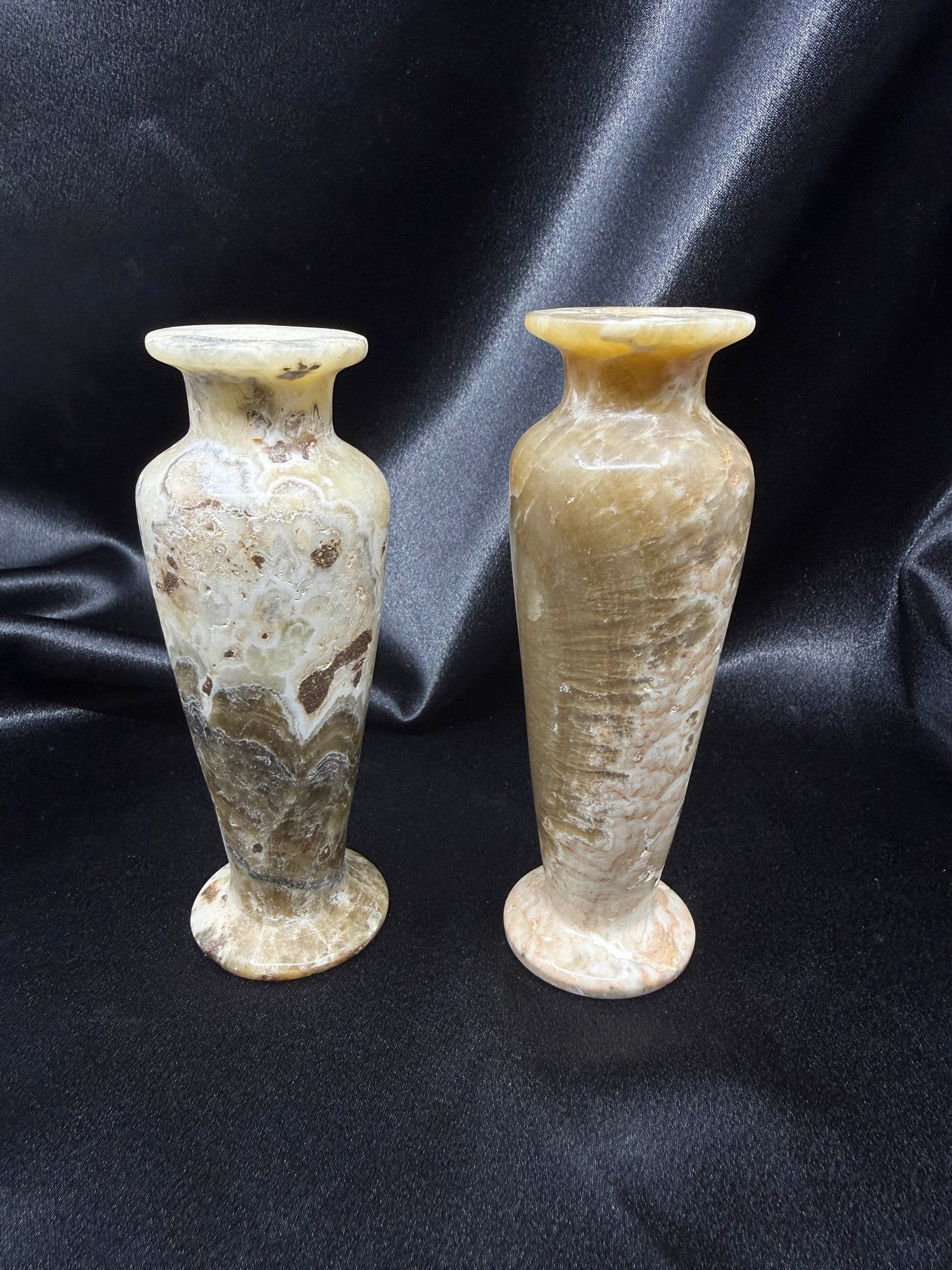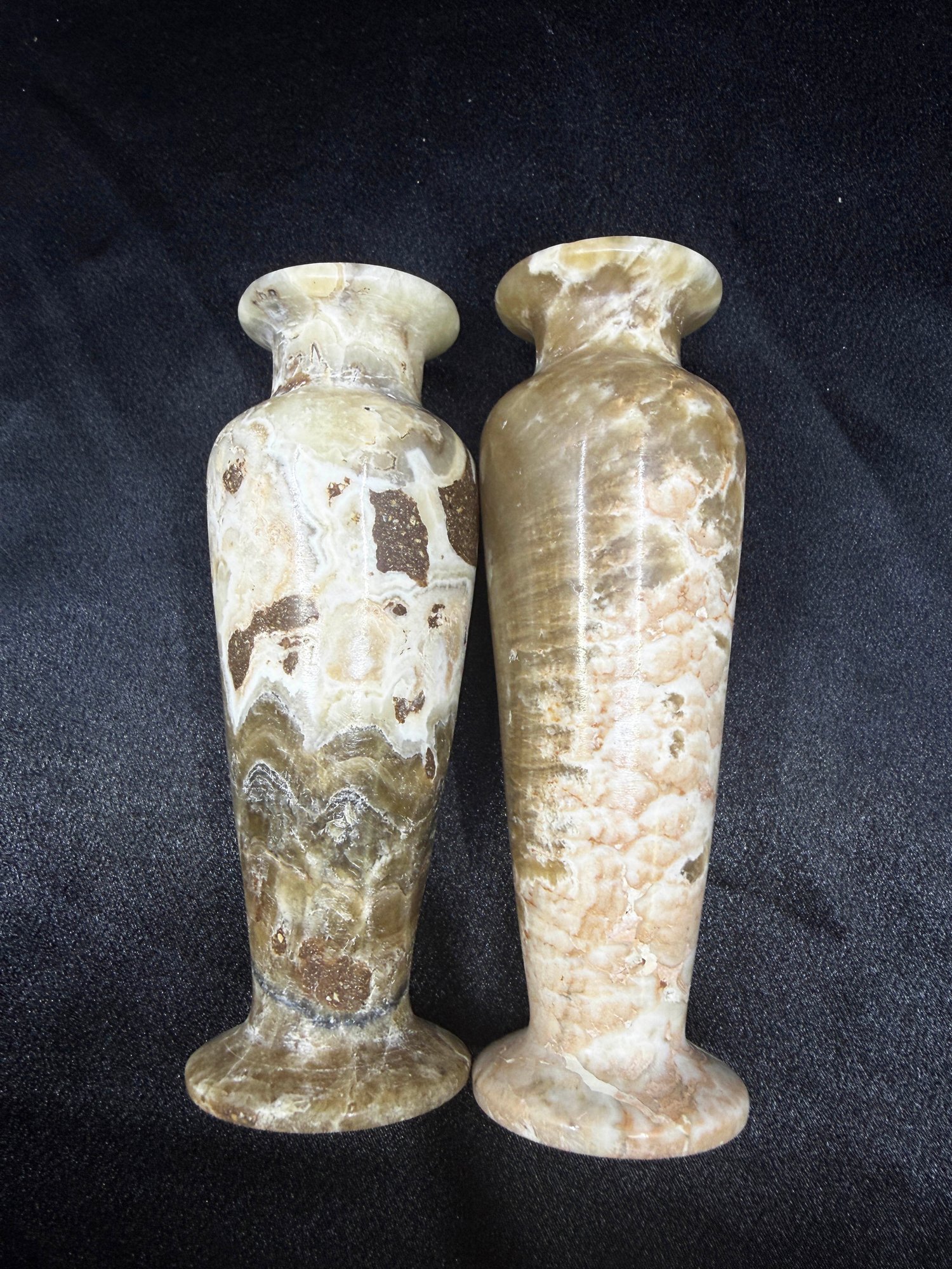 (A-73) VINTAGE MINIATURE PAIR OF HAND CARVED ONYX MARBLE TABLE VASES