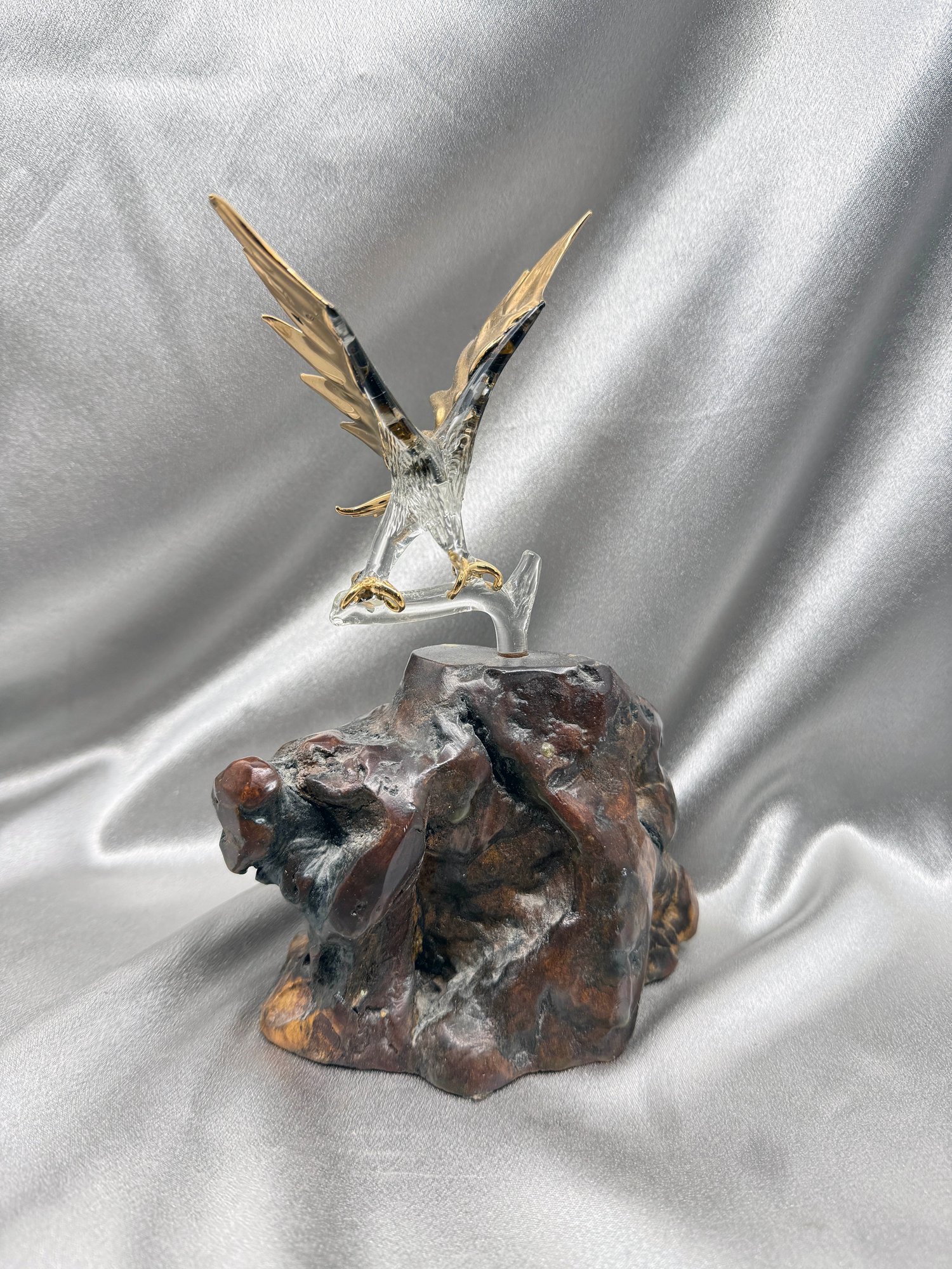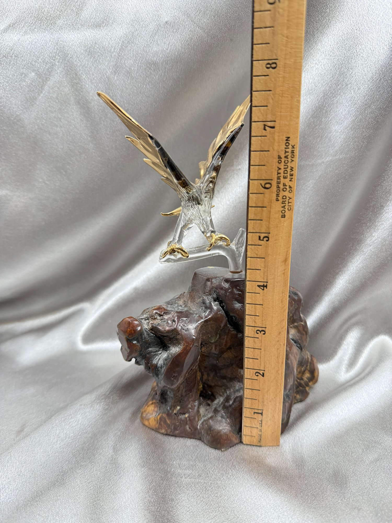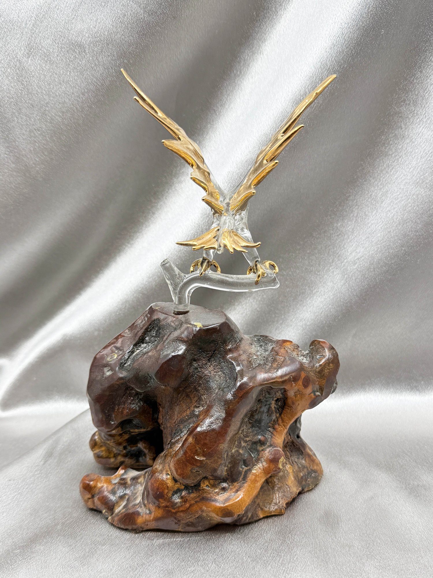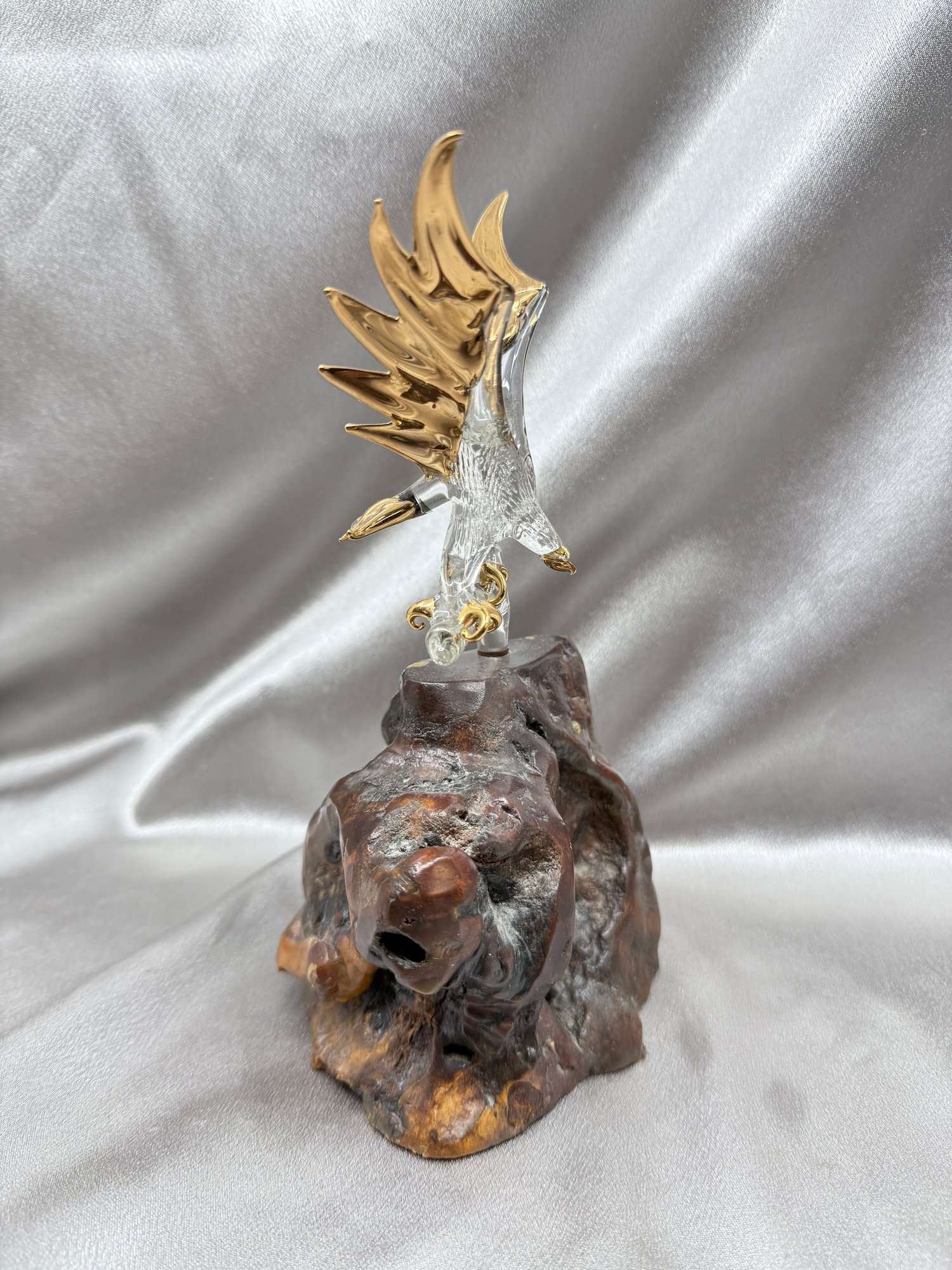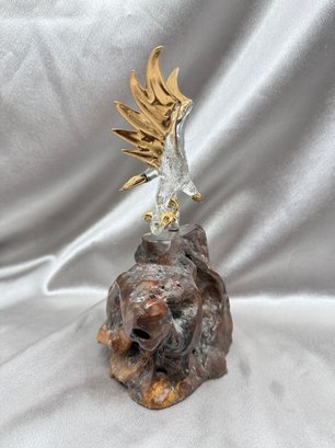 (A-80) VINTAGE GLASS BARON BALD EAGLE FIGURINE- CLEAR GLASS EAGLE W/24KT GOLD ACCENTS ON WOOD BASE