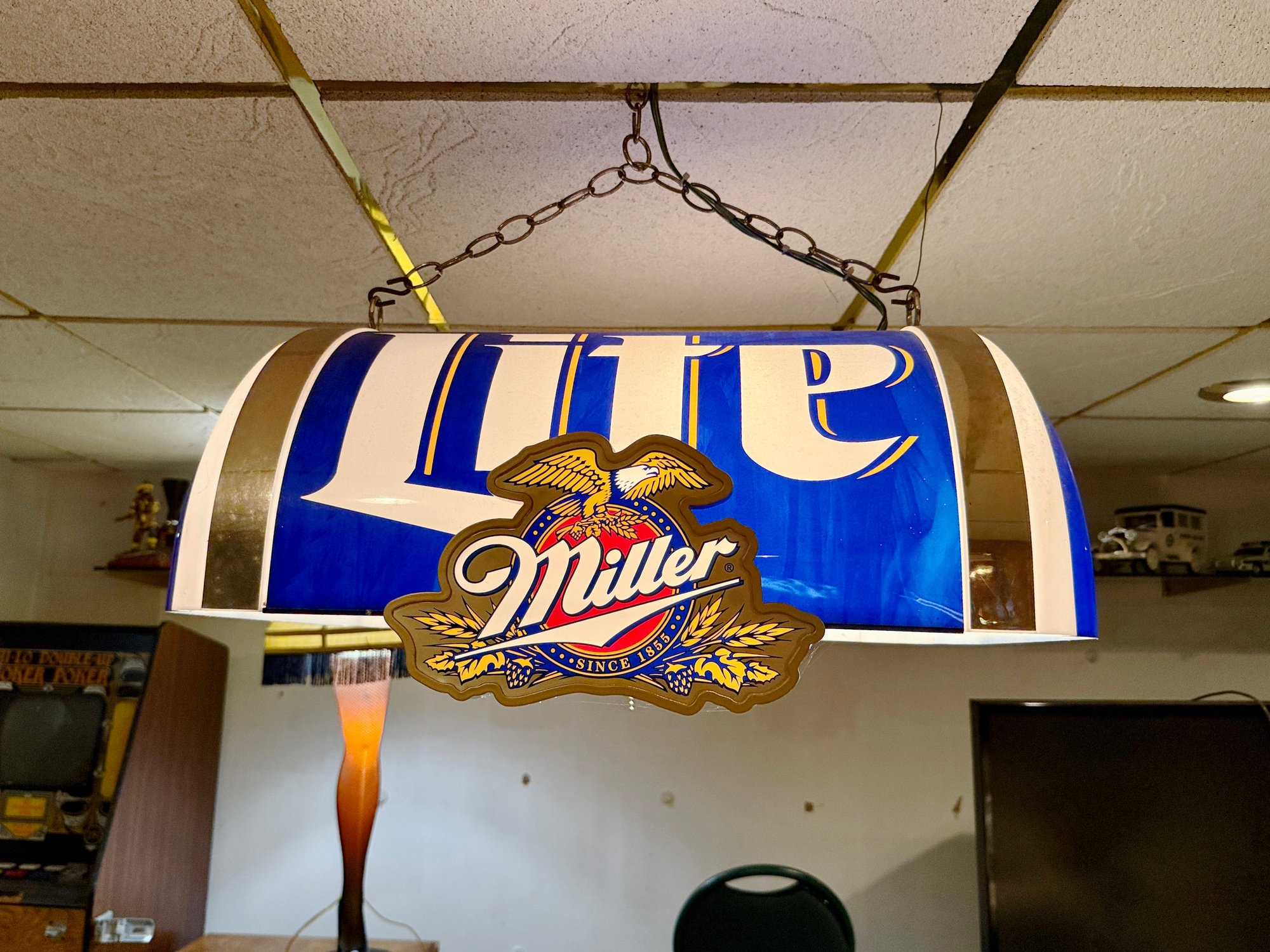 (B-2) MILLER LITE BEER POOL TABLE LIGHT, WORKING- 25" BY 17" BY 12"