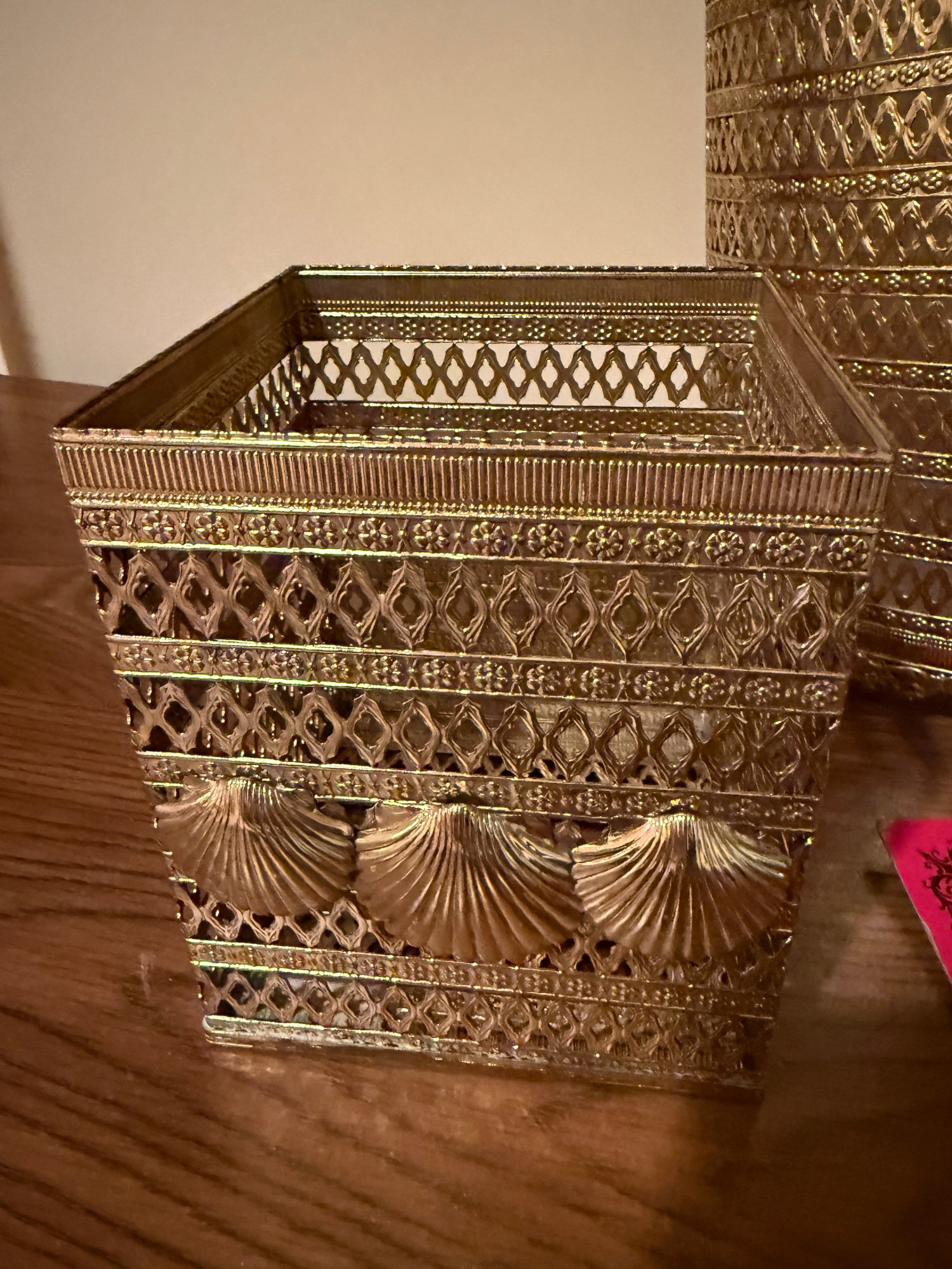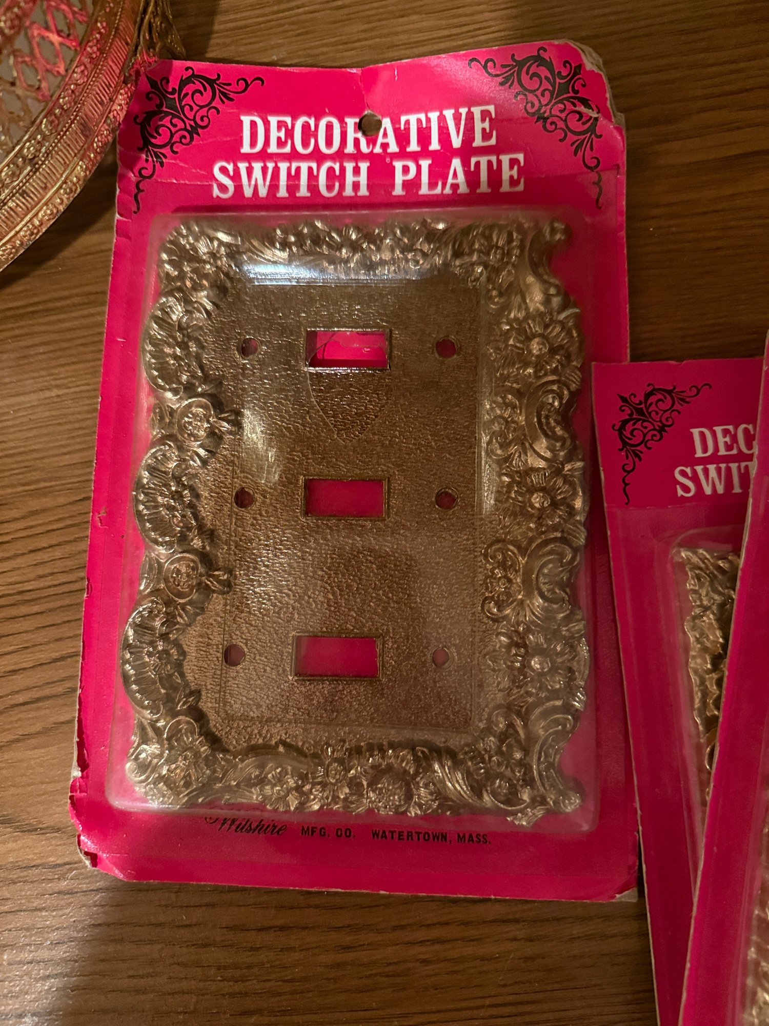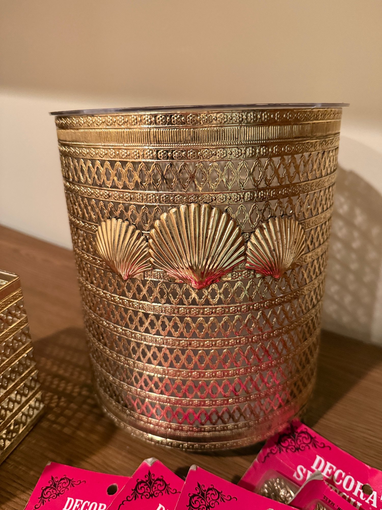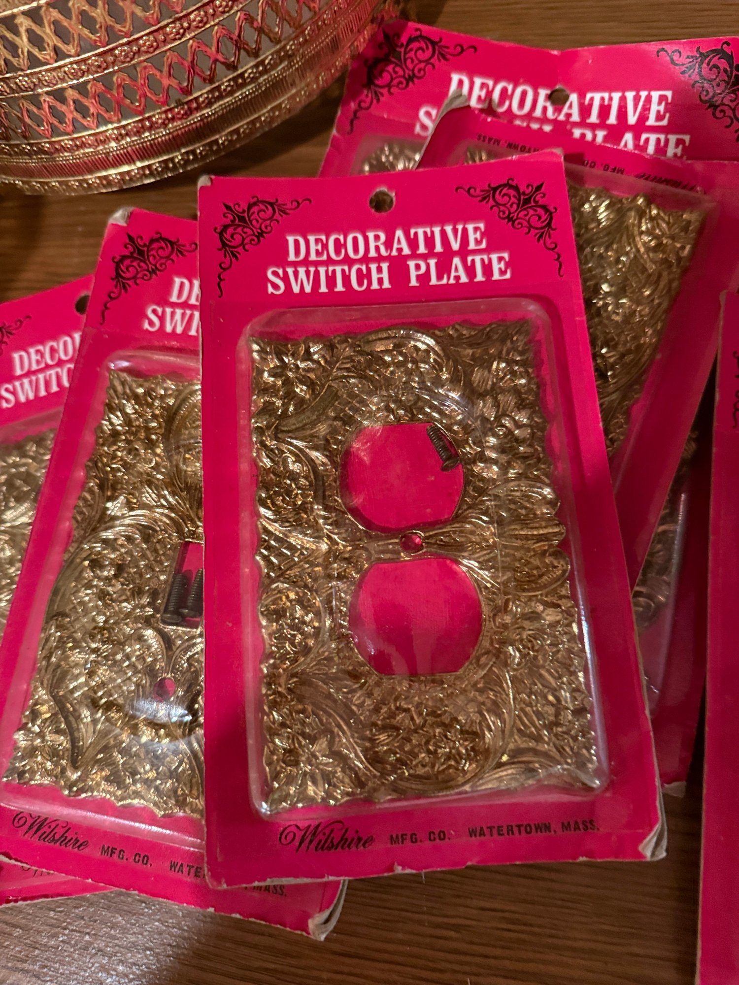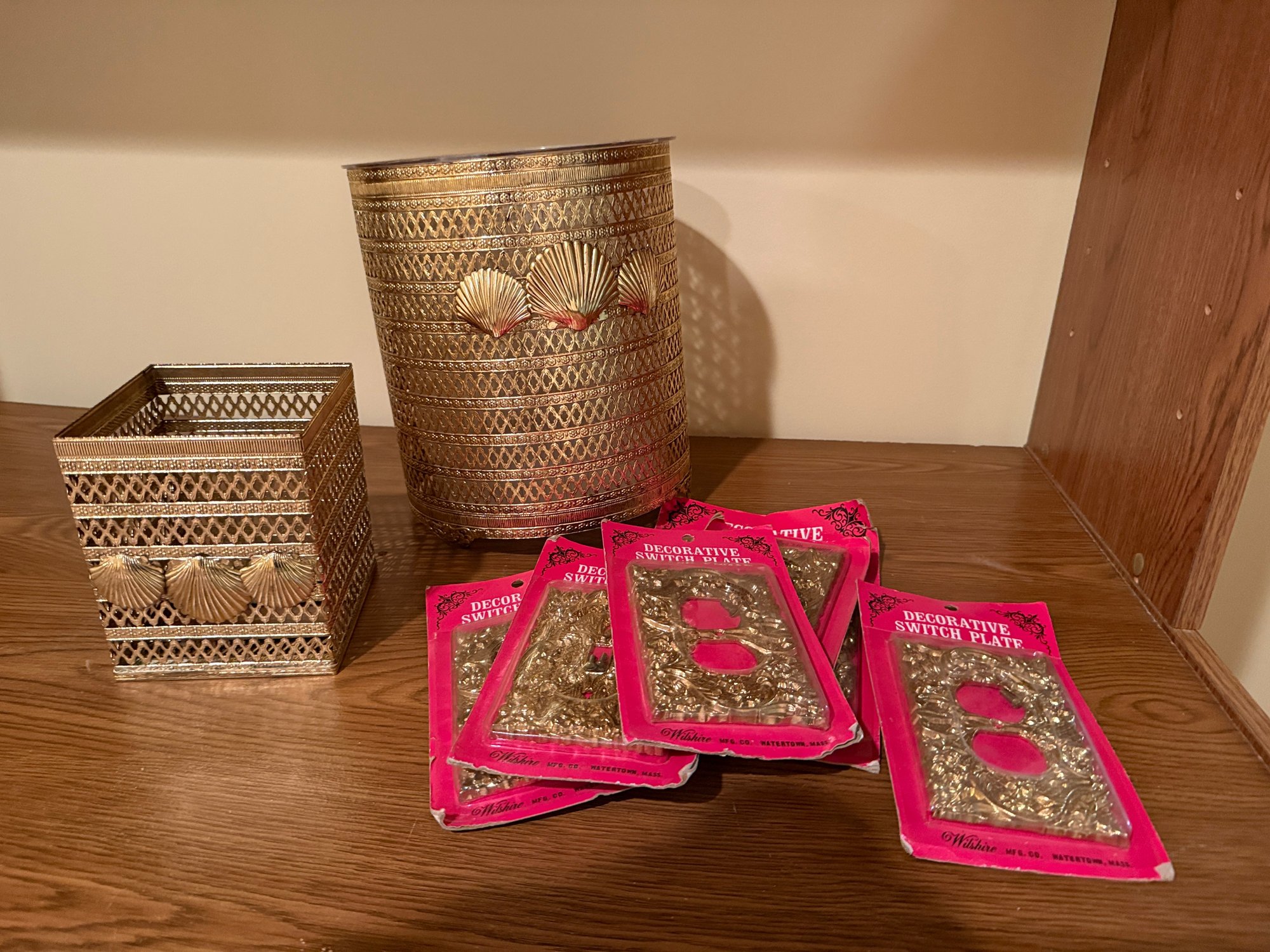 (BA-30) COLLECTION OF VINTAGE GOLD ACCESSORIES, TRASH PAIL, TISSUE BOX & 6 LIGHT SWITCH PLATES