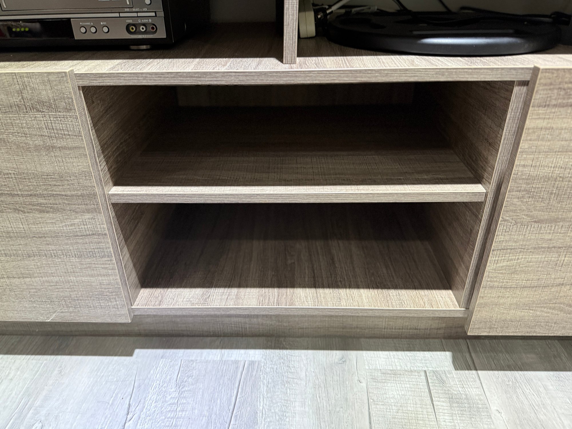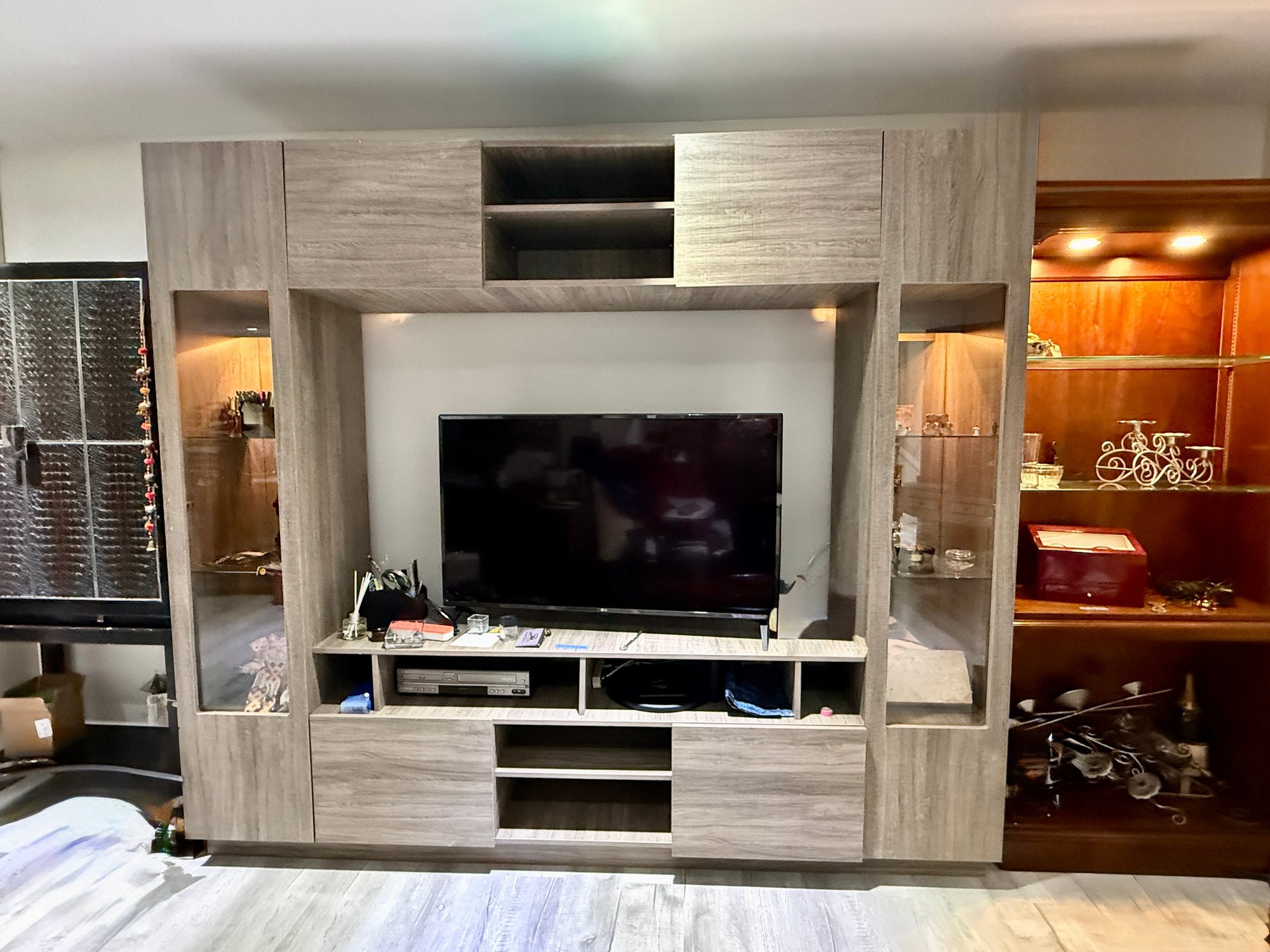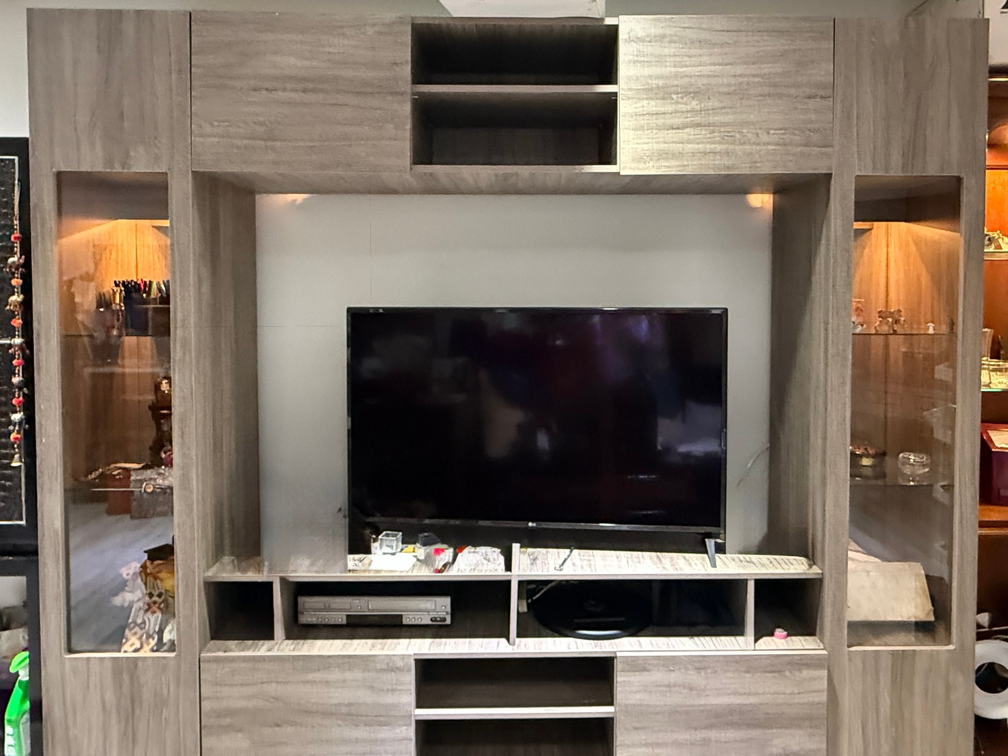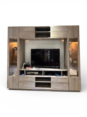 (BASE) CONTEMPORARY LIGHT COMPOSITE WOOD WALL UNIT MEDIA CENTER - LARGE & WILL NEED 3 PEOPLE TO TAKE APART - 97" BY 85" BY 20"