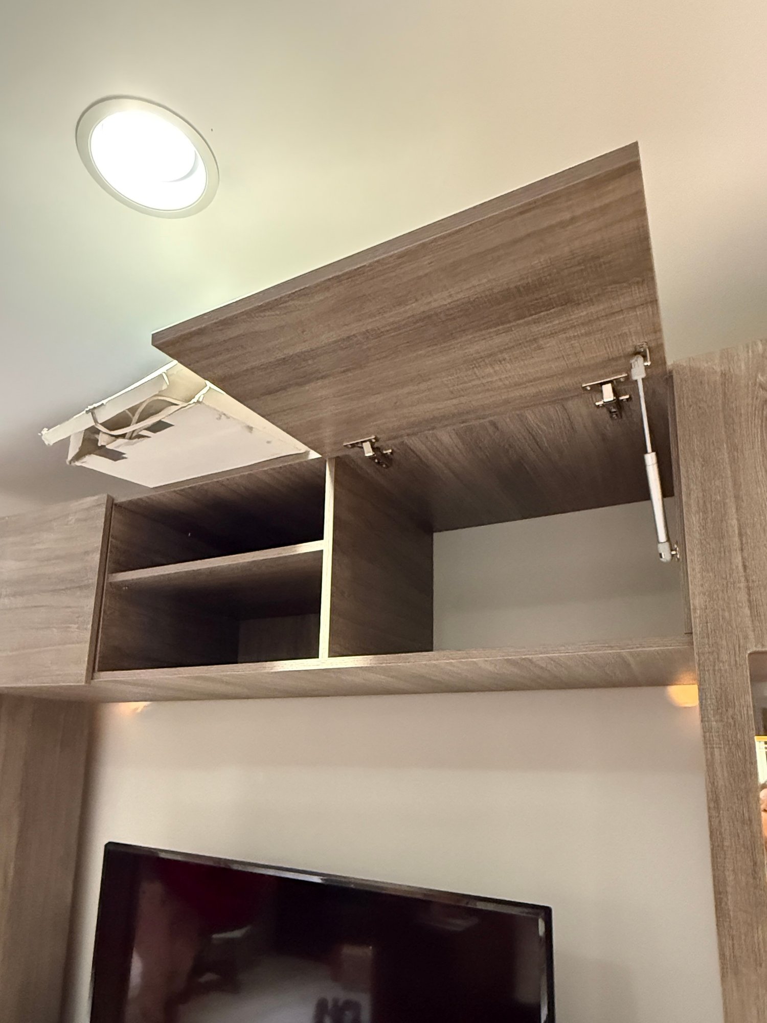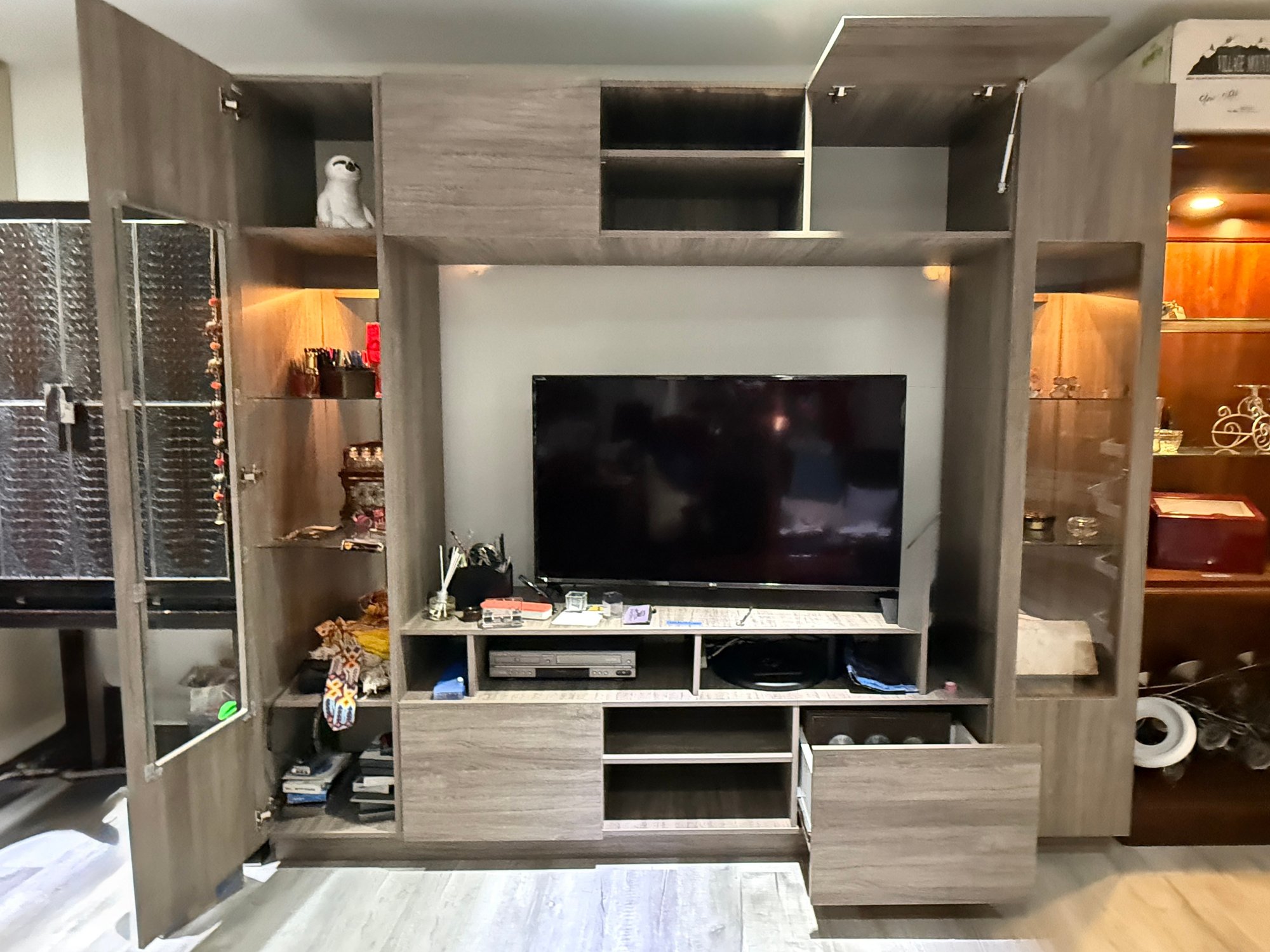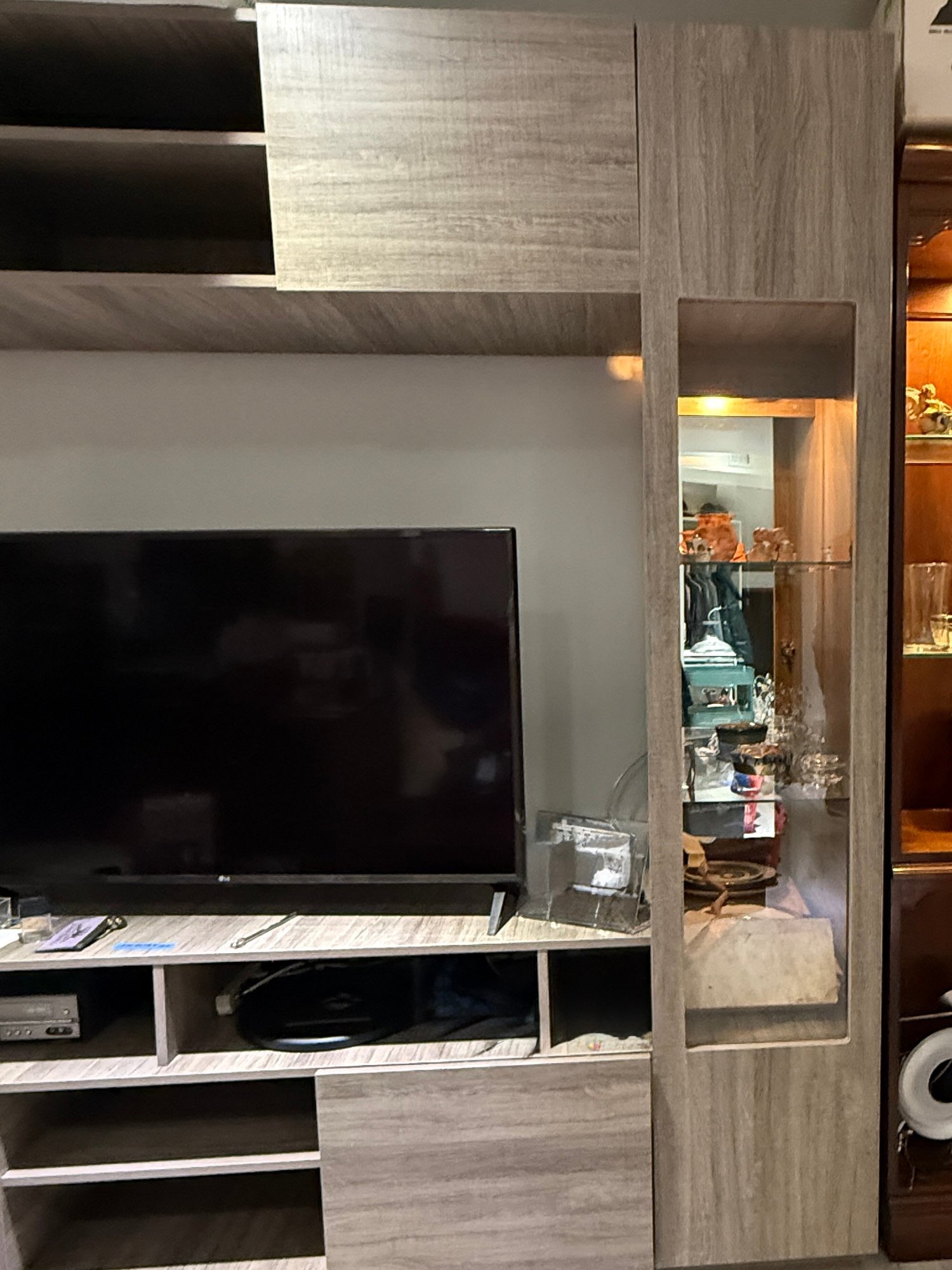 (BASE) CONTEMPORARY LIGHT COMPOSITE WOOD WALL UNIT MEDIA CENTER - LARGE & WILL NEED 3 PEOPLE TO TAKE APART - 97" BY 85" BY 20"