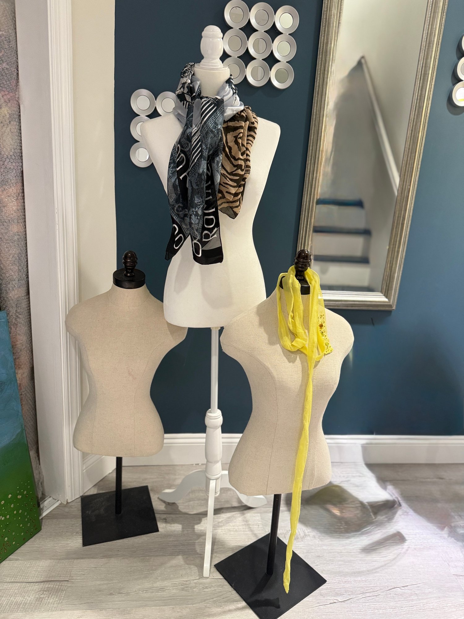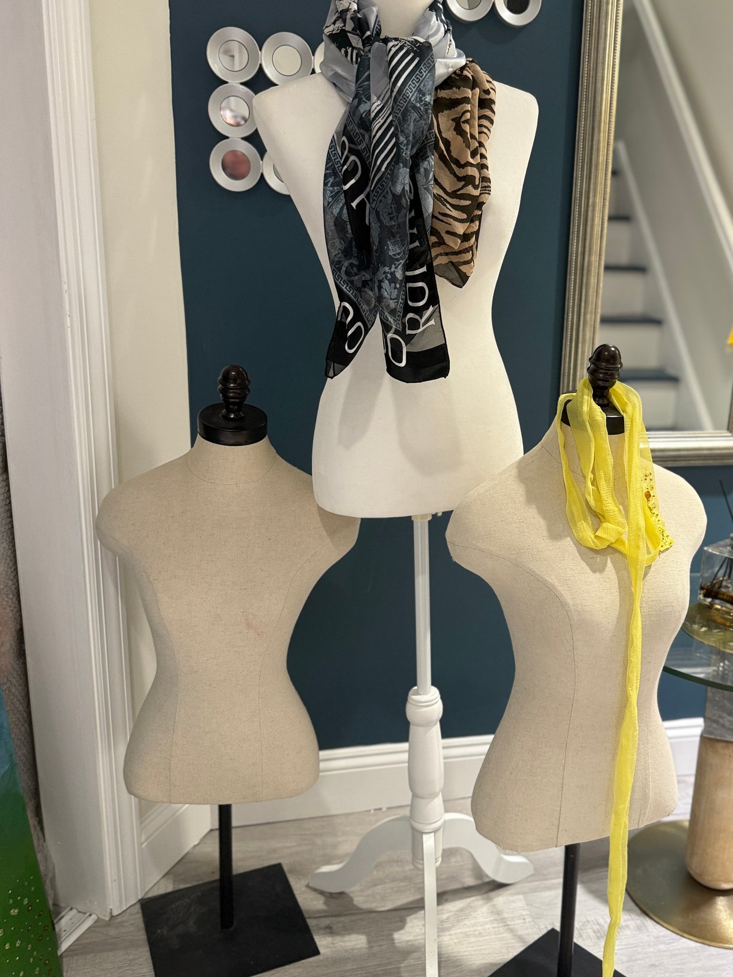 (BASE) THREE DECORATIVE MANNEQUINS ON STANDS - PICK UP ONLY