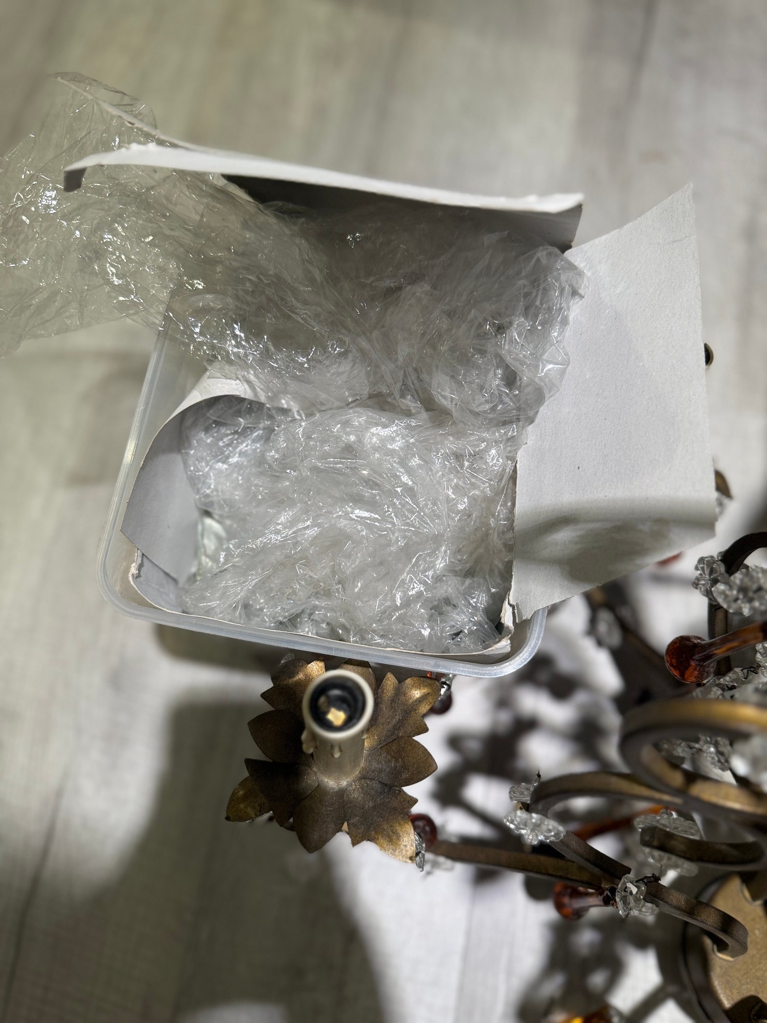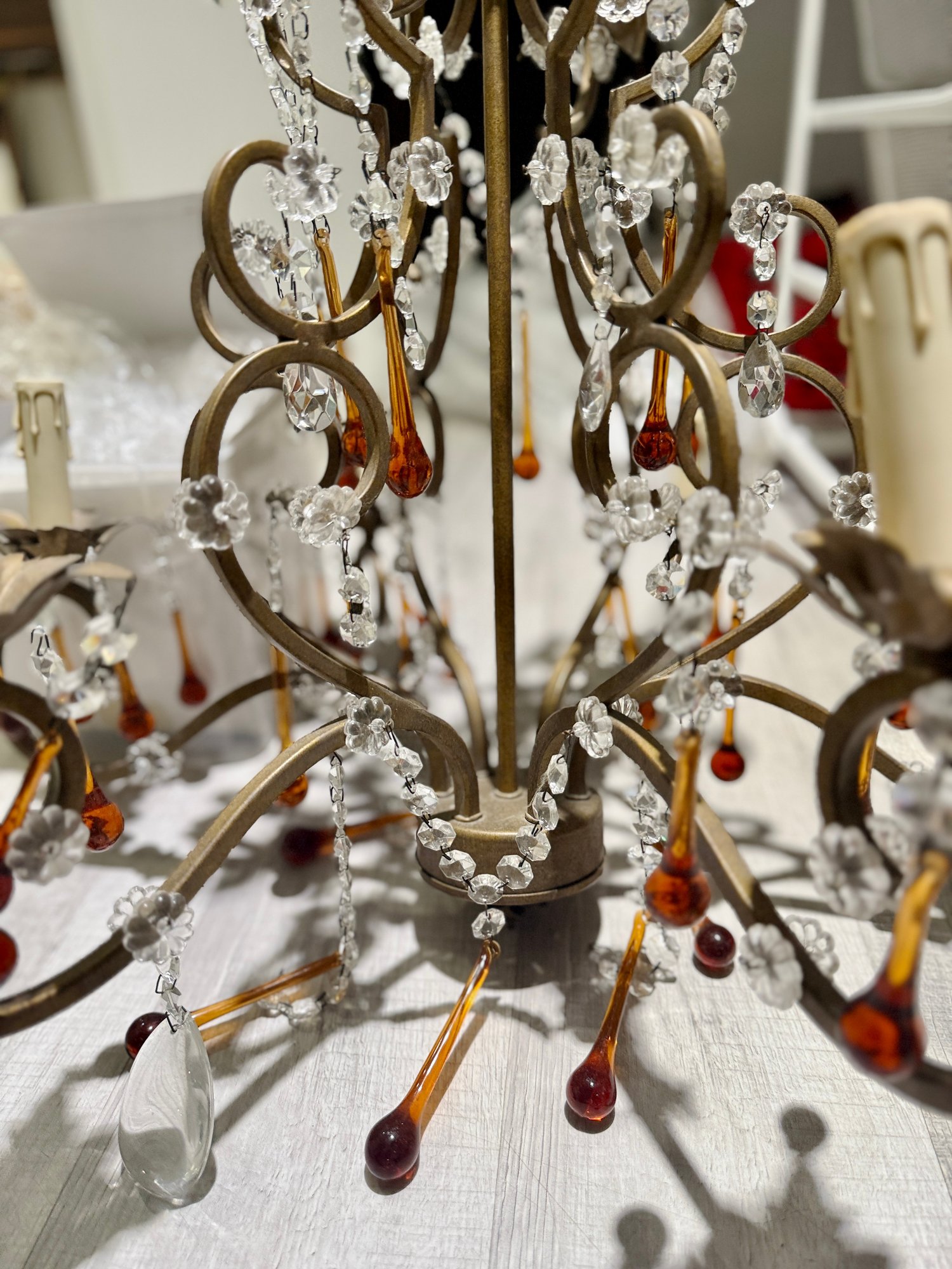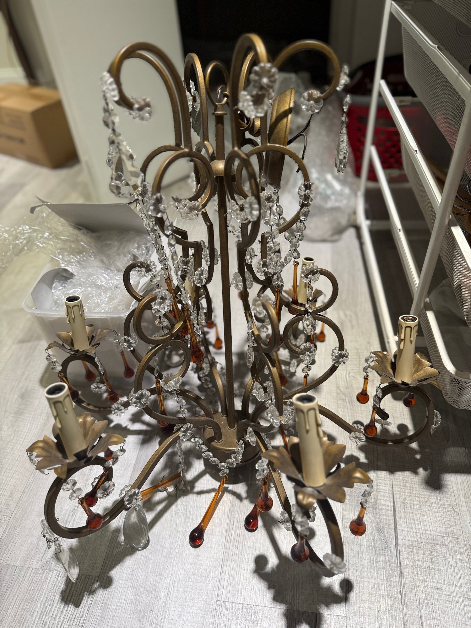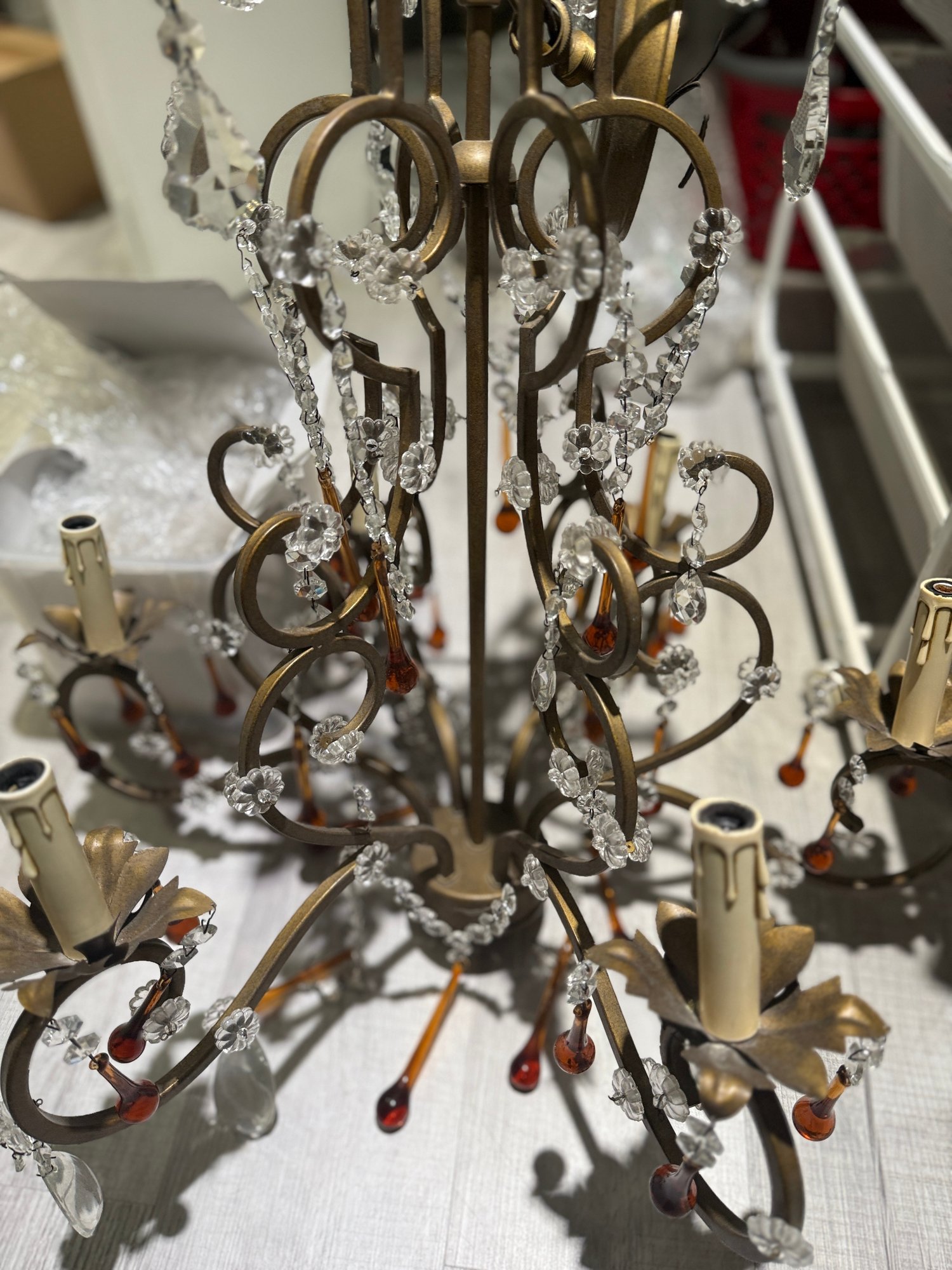 (BASE) VINTAGE CRYSTAL & BRASS SIX LIGHT CHANDELIER - LOOKS COMPLETE WITH PRISMS - APPROX: 30" ACROSS