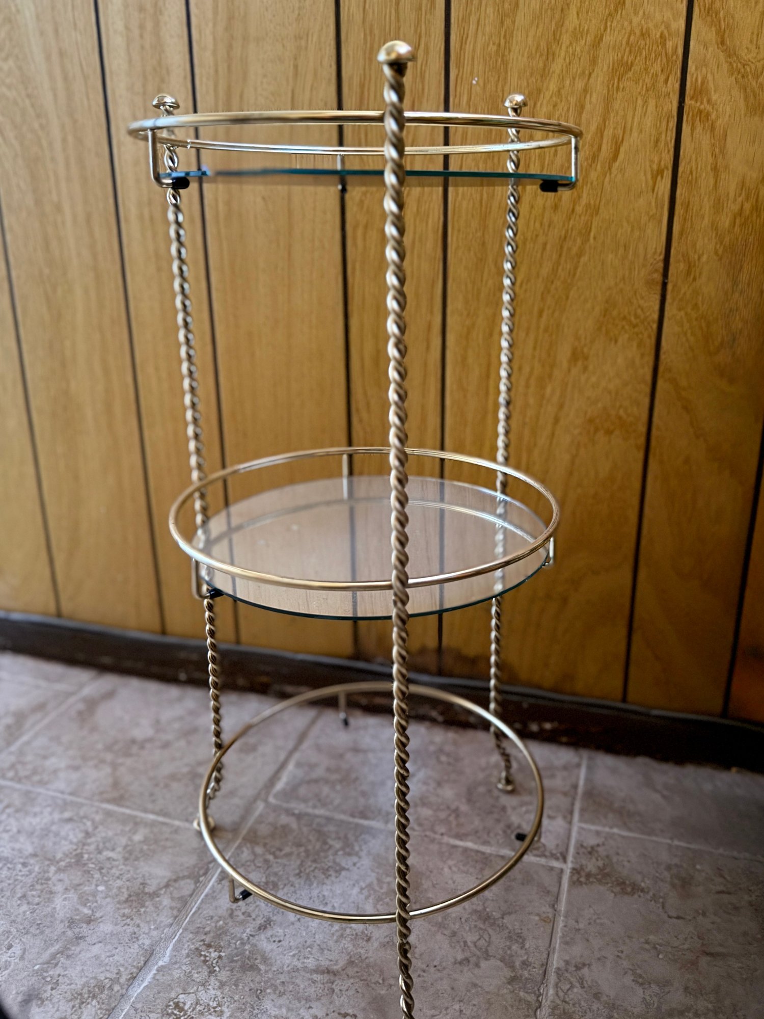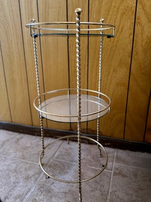 (BASEBR) VINTAGE THREE SHELF DISPLAY STAND, ONE PIECE OF GLASS IS MISSING - 12" BY 26"