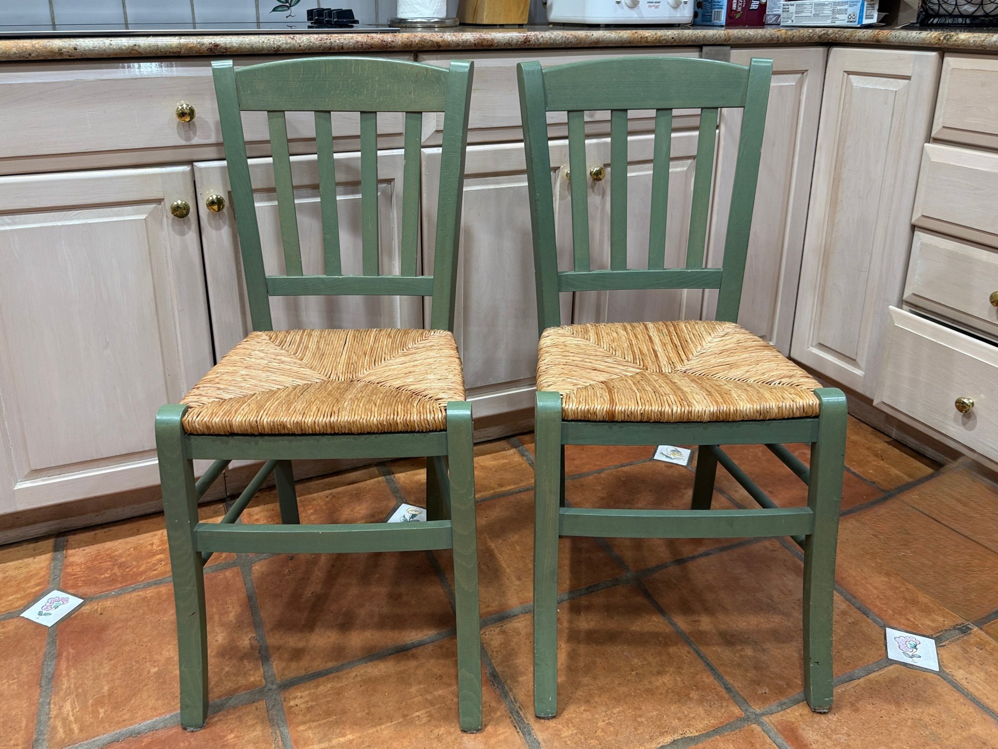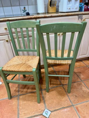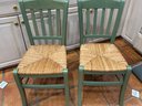 (K) PAIR OF GREEN WOOD CHAIRS - RUSH SEAT, MADE IN ITALY