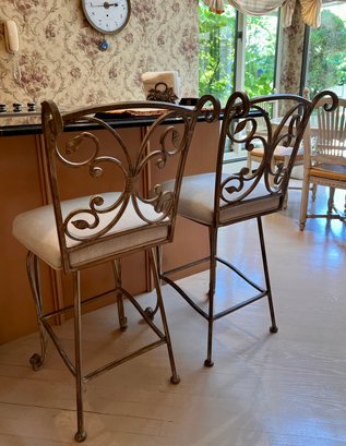(K) PAIR OF IRON KITCHEN ISLAND SWIVEL CHAIRS WITH IVORY UPHOLSTERED SEATS - 39" BY 16" BY 17