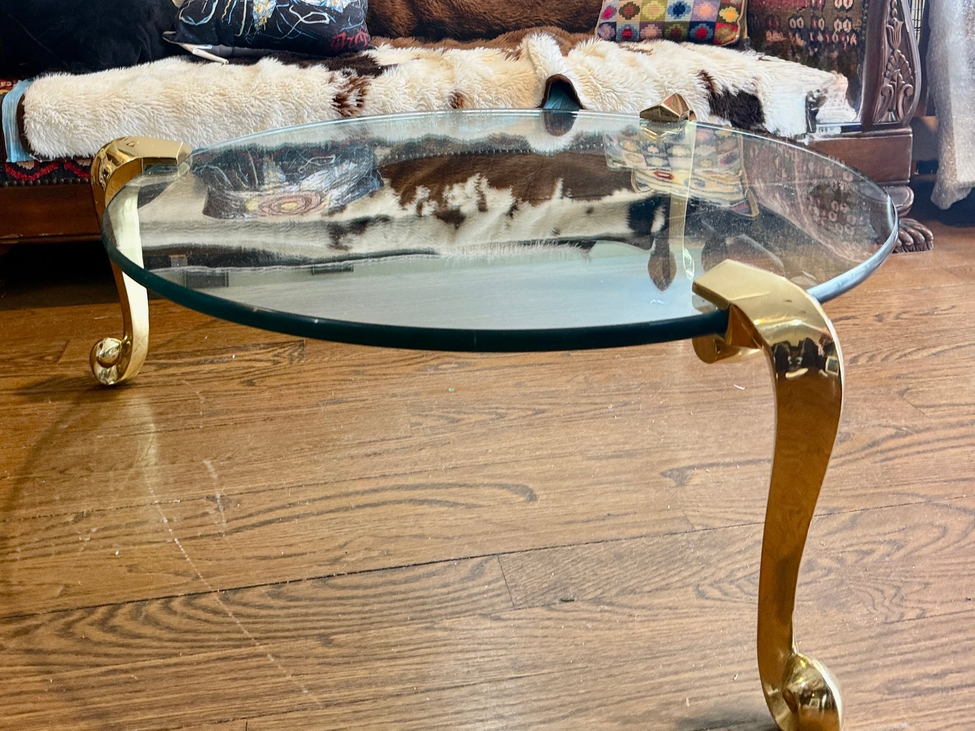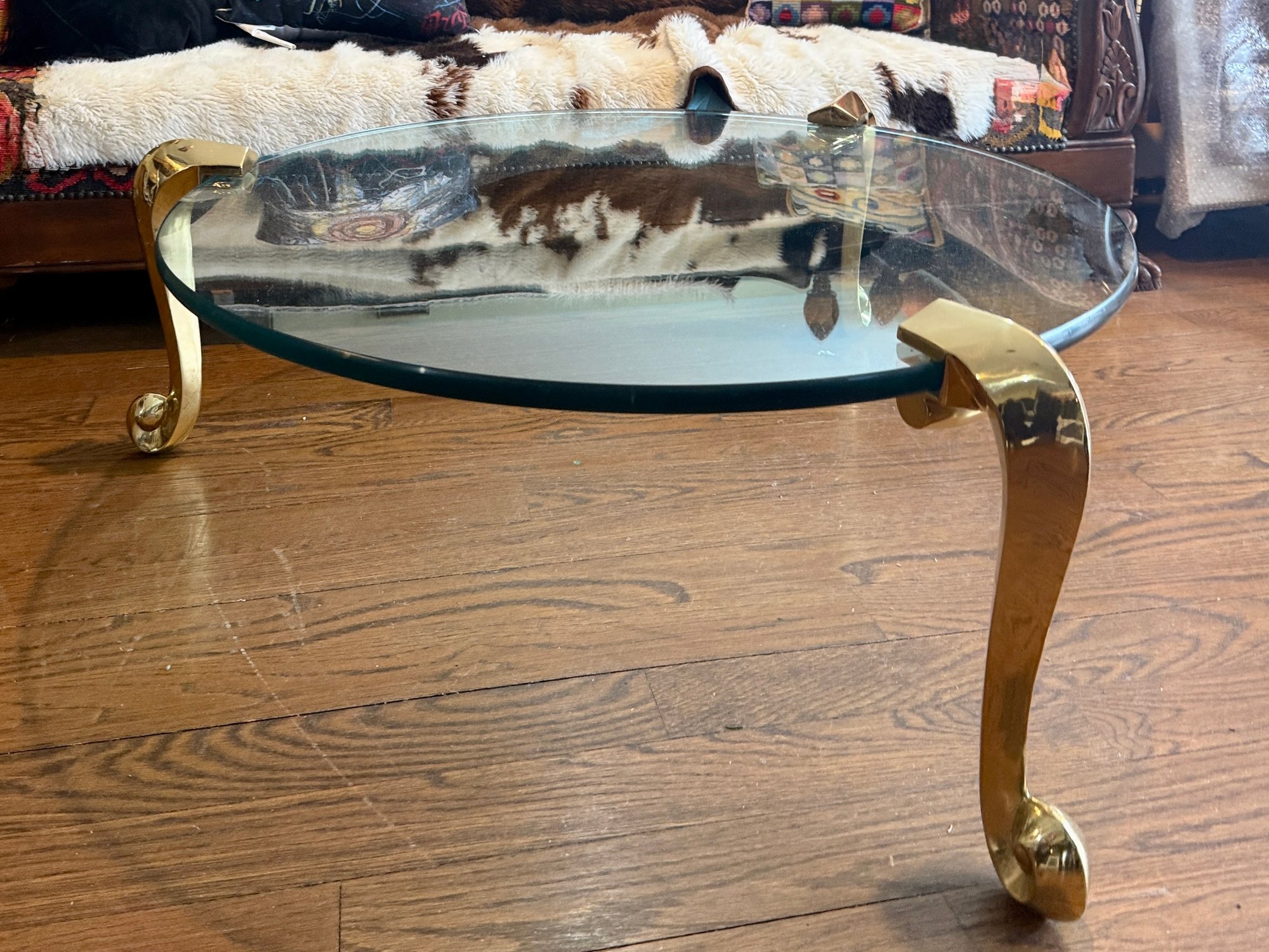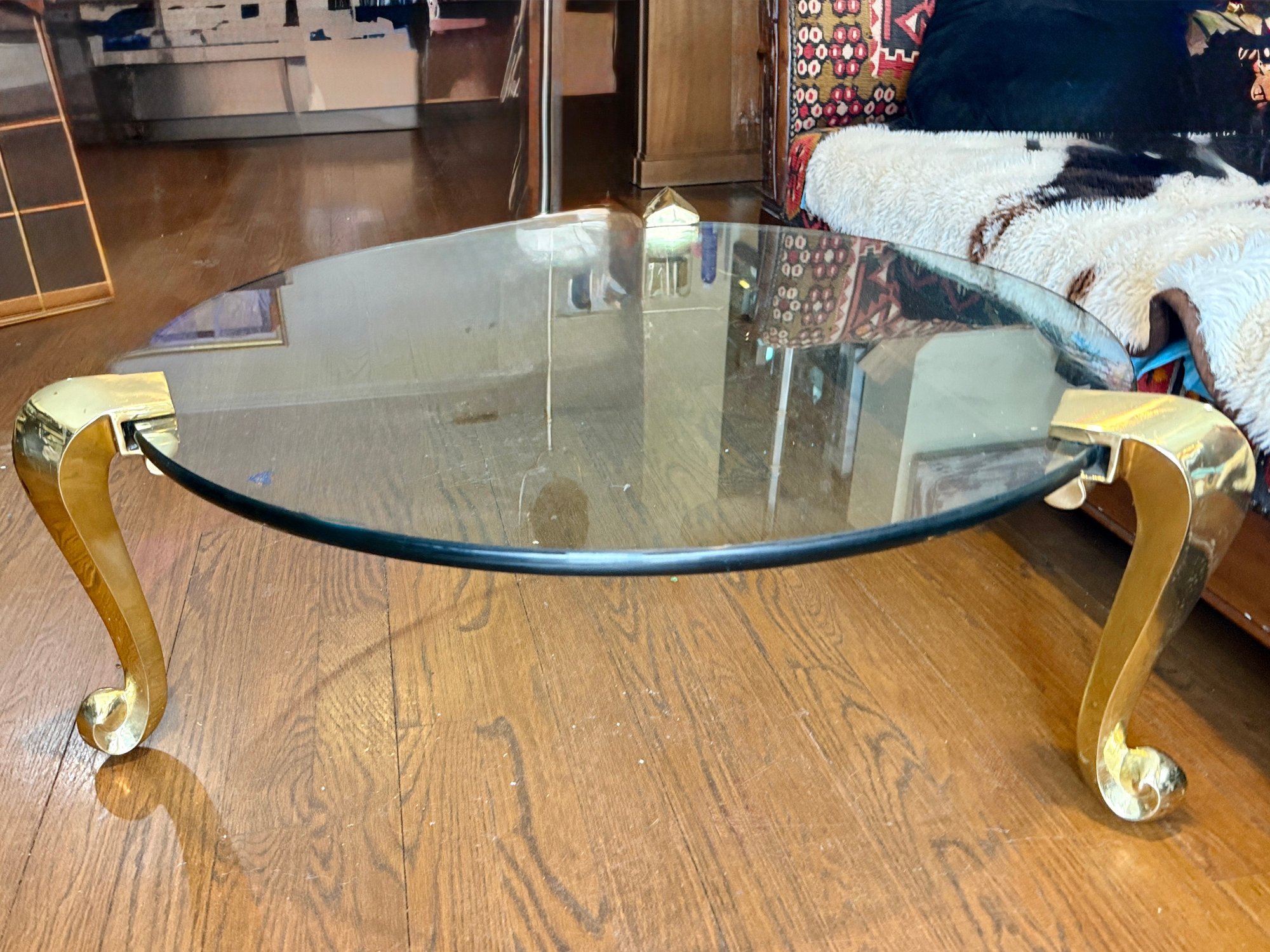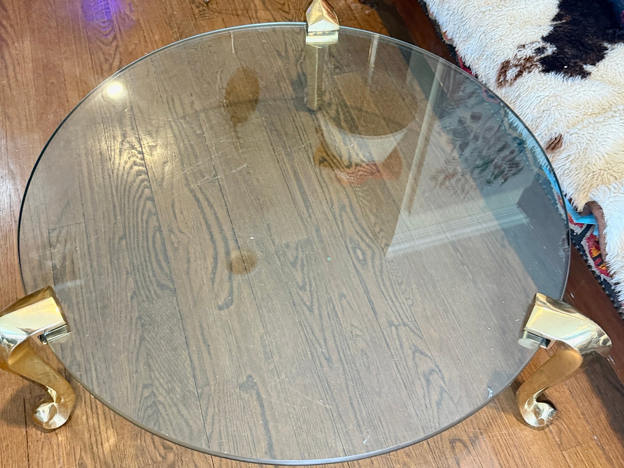 (LR) VINTAGE POST MODERN GLASS TOP COCKTAIL TABLE WITH GOLD LEGS - 36" ROUND BY 18"HIGH