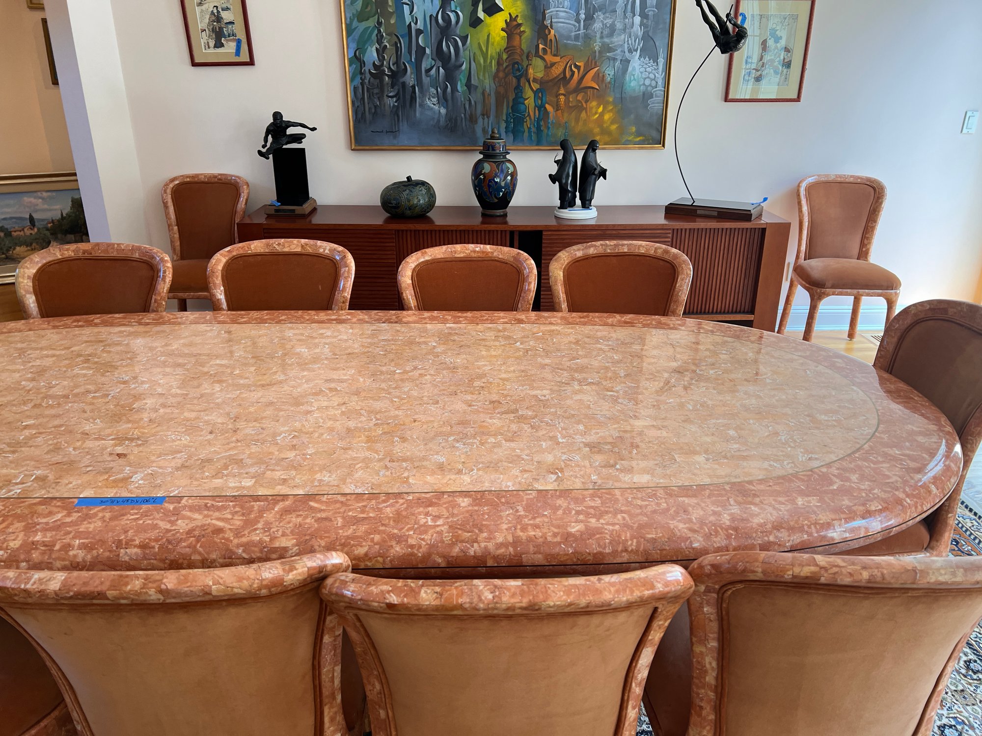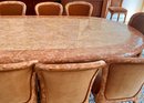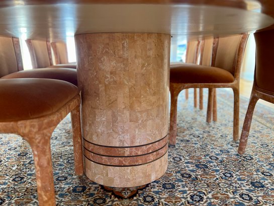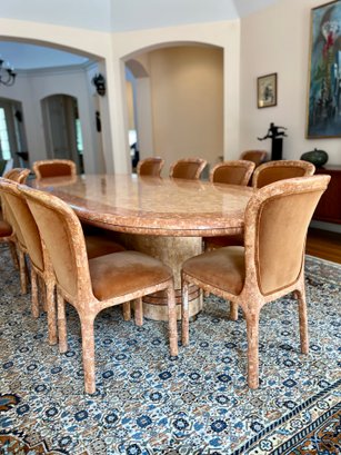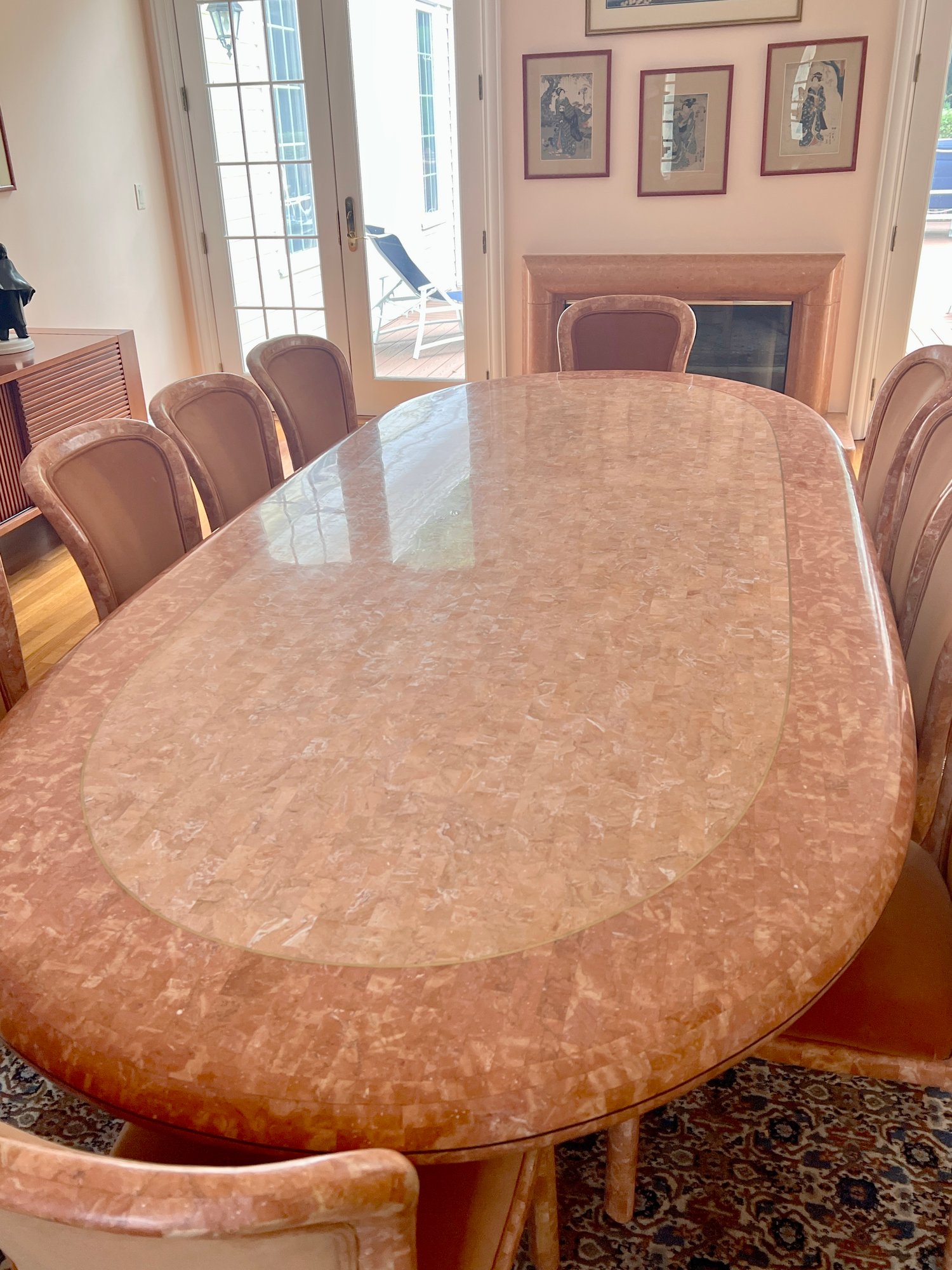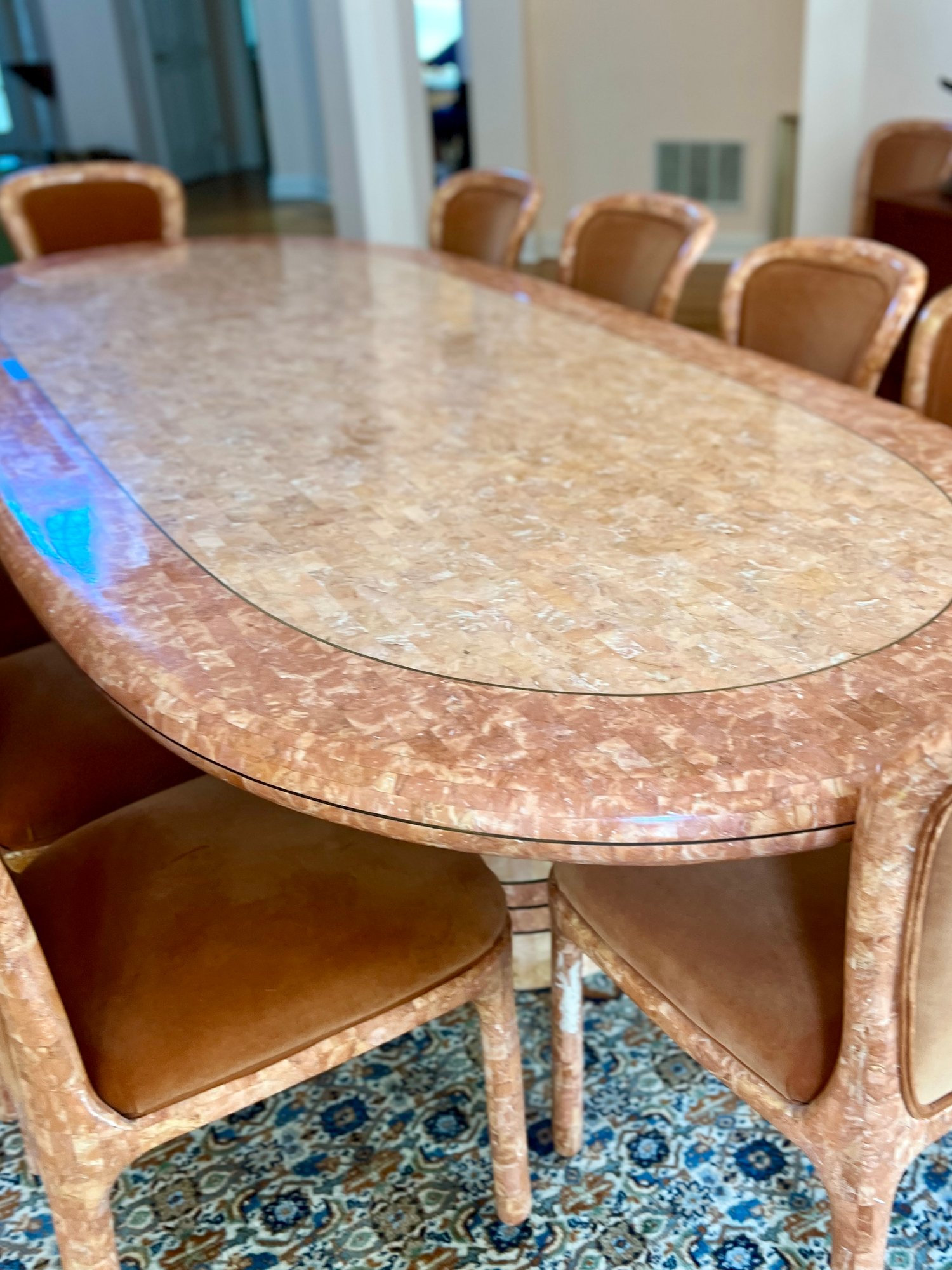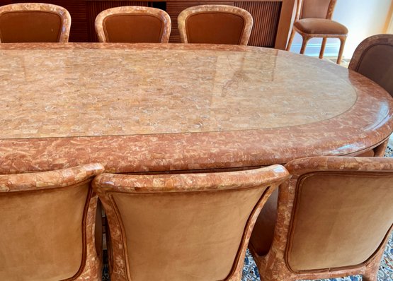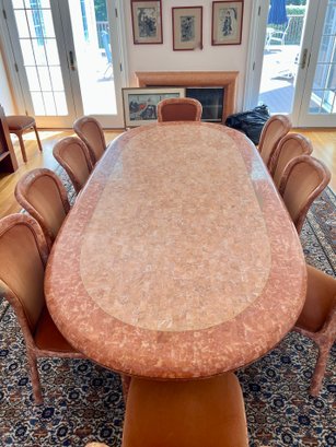 POLISHED HAND INLAID REAL SEASHELL DINING TABLE & TWELVE CHAIRS CUSTOM BUILT & IMPORTED FROM THE PHILIPPINES - TABLE IS: 8'9" BY 4' BY 30" HIGH, CHAIRS ARE: 19" BY 18" BY 35"H