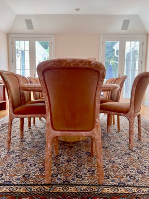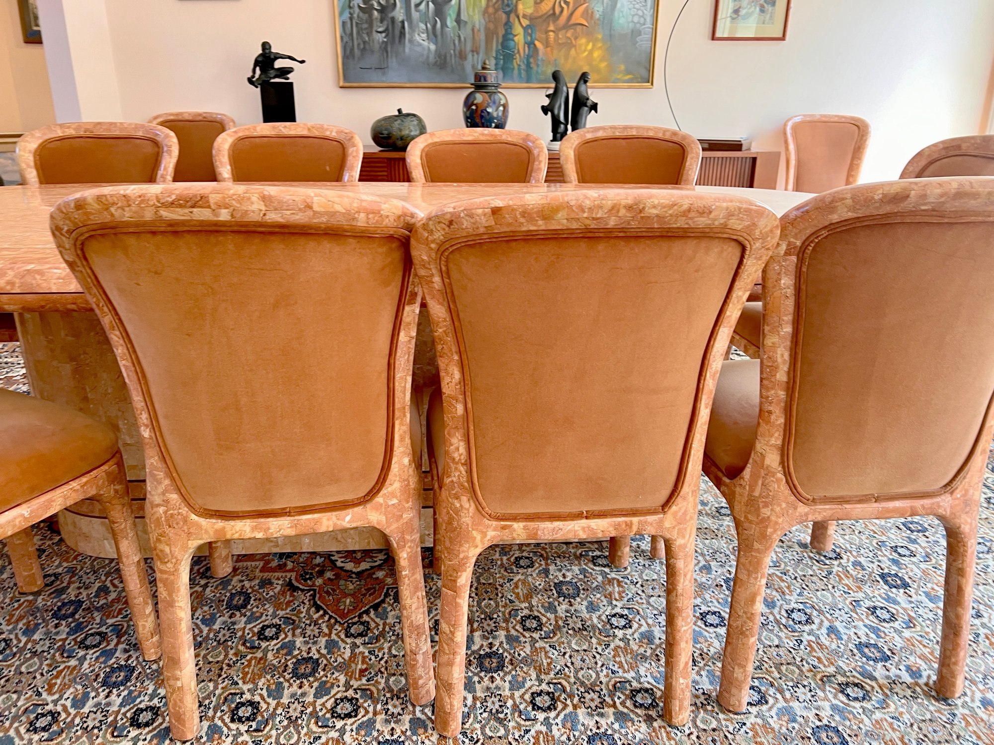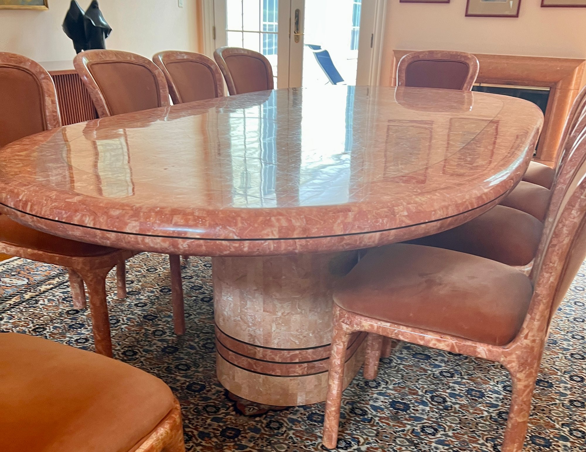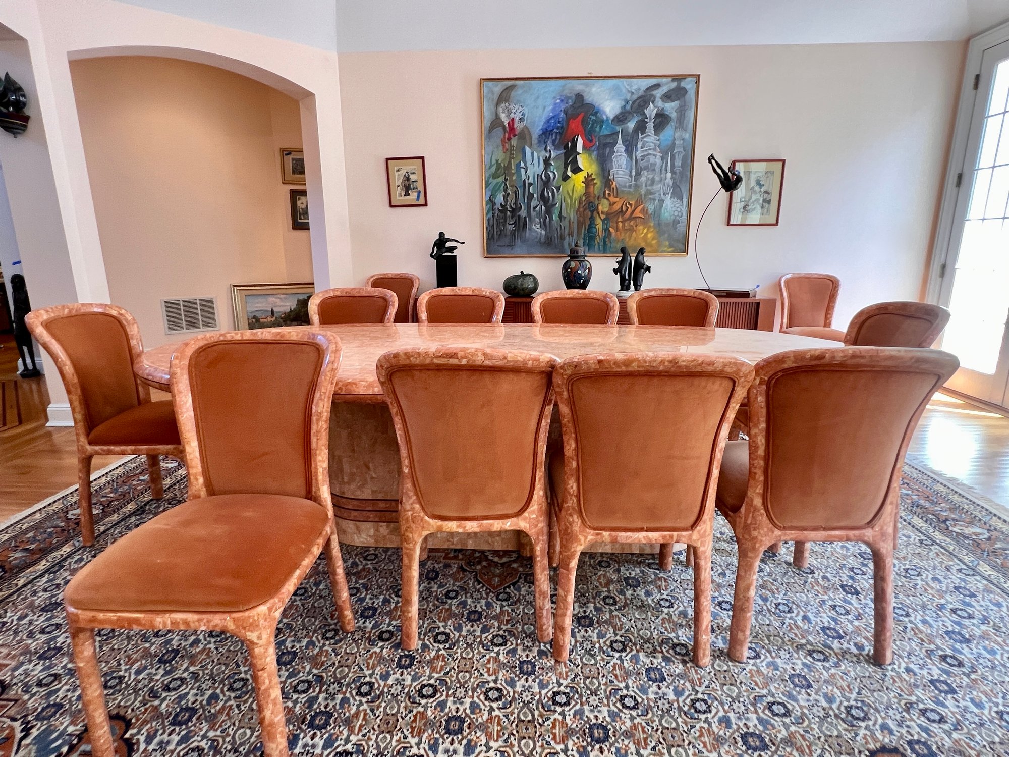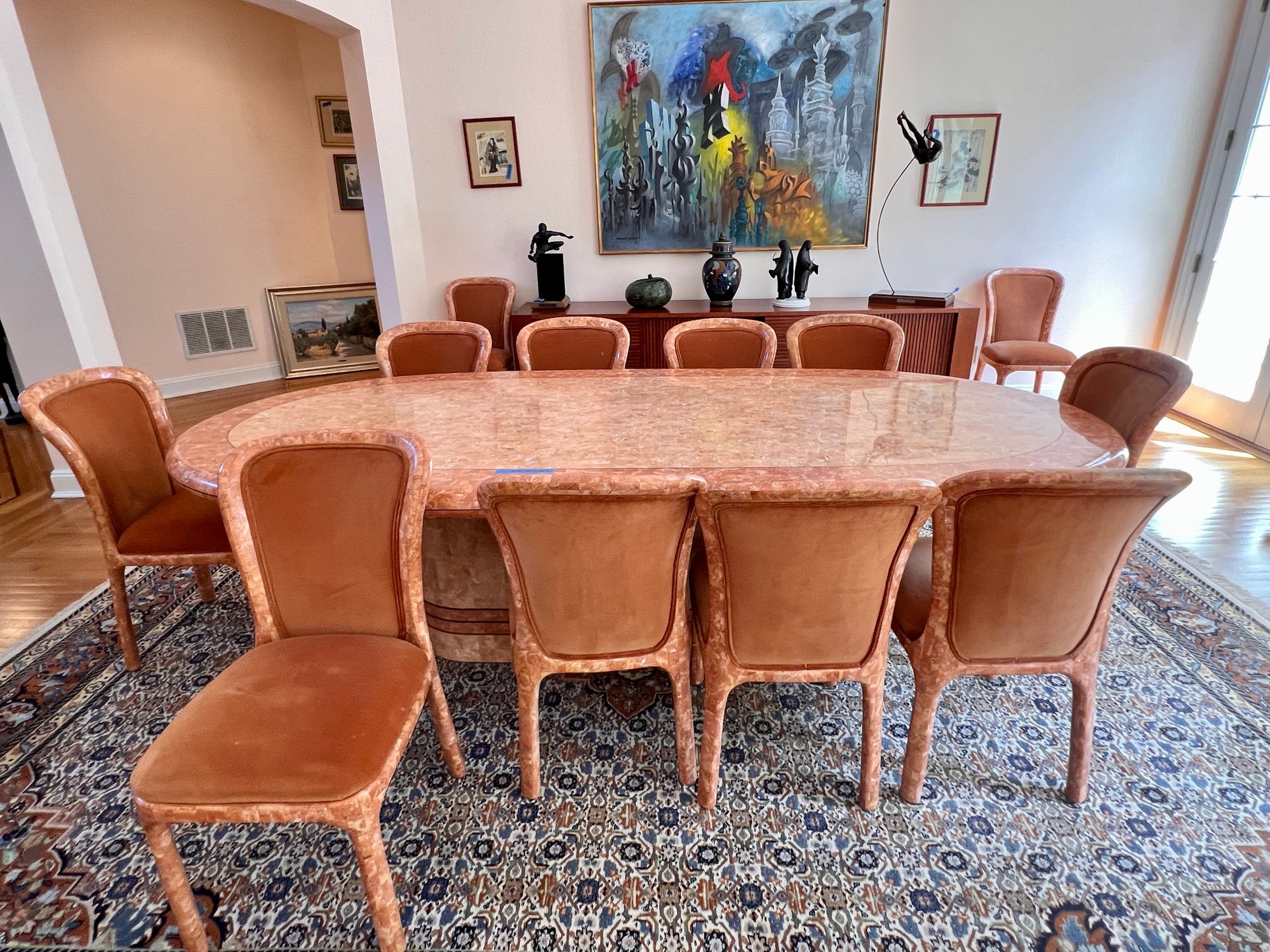 POLISHED HAND INLAID REAL SEASHELL DINING TABLE & TWELVE CHAIRS CUSTOM BUILT & IMPORTED FROM THE PHILIPPINES - TABLE IS: 8'9" BY 4' BY 30" HIGH, CHAIRS ARE: 19" BY 18" BY 35"H