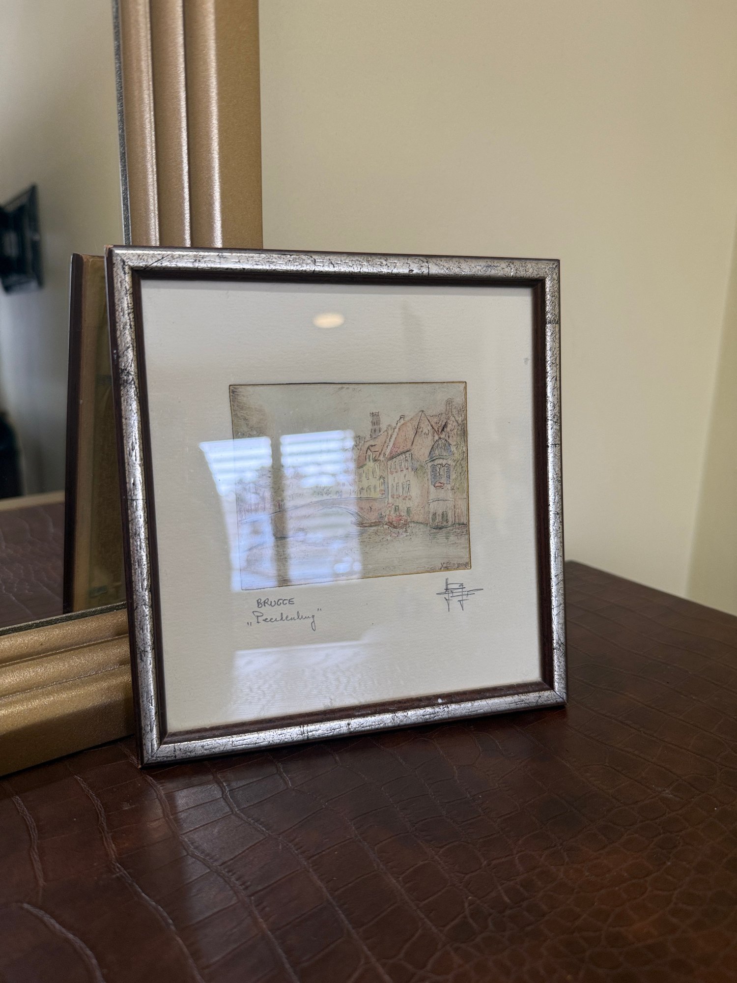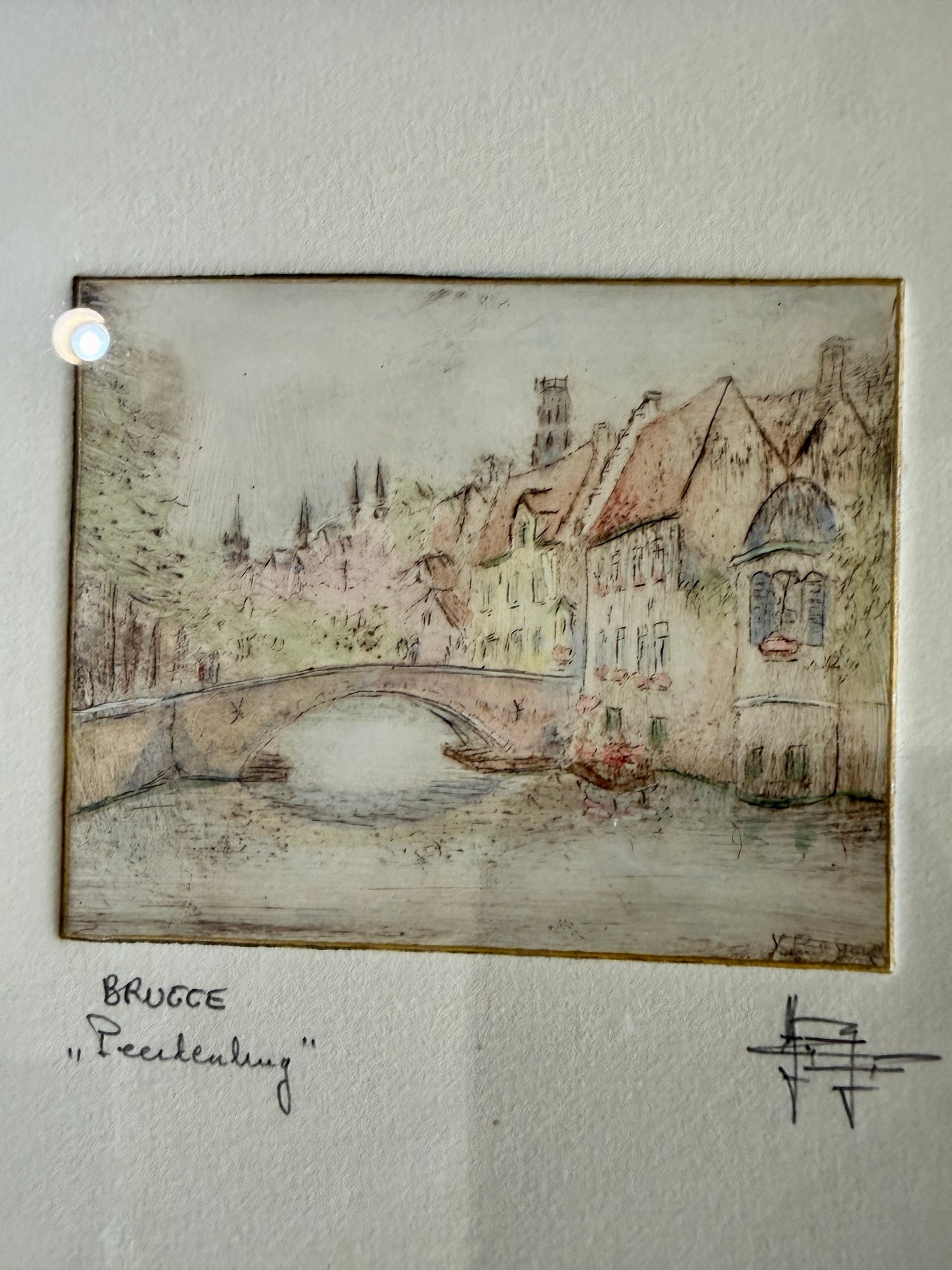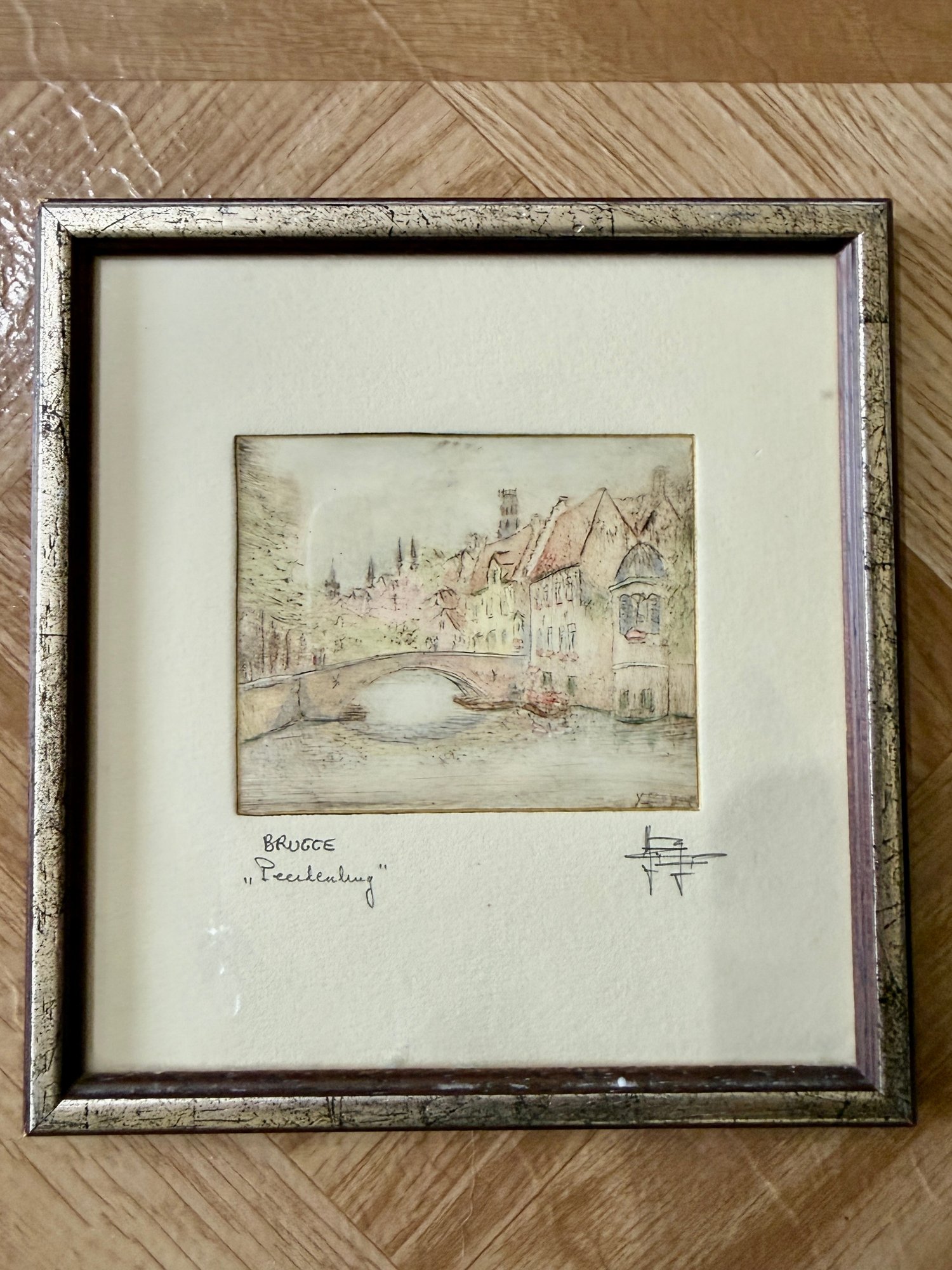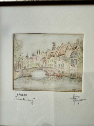 (U-12) SIGNED VINTAGE ETCHING BY YVAN ROYON (1938) - PEERDENBRUG BRIDGE IN BRUGGE BELGIUM - 8" BY 8"