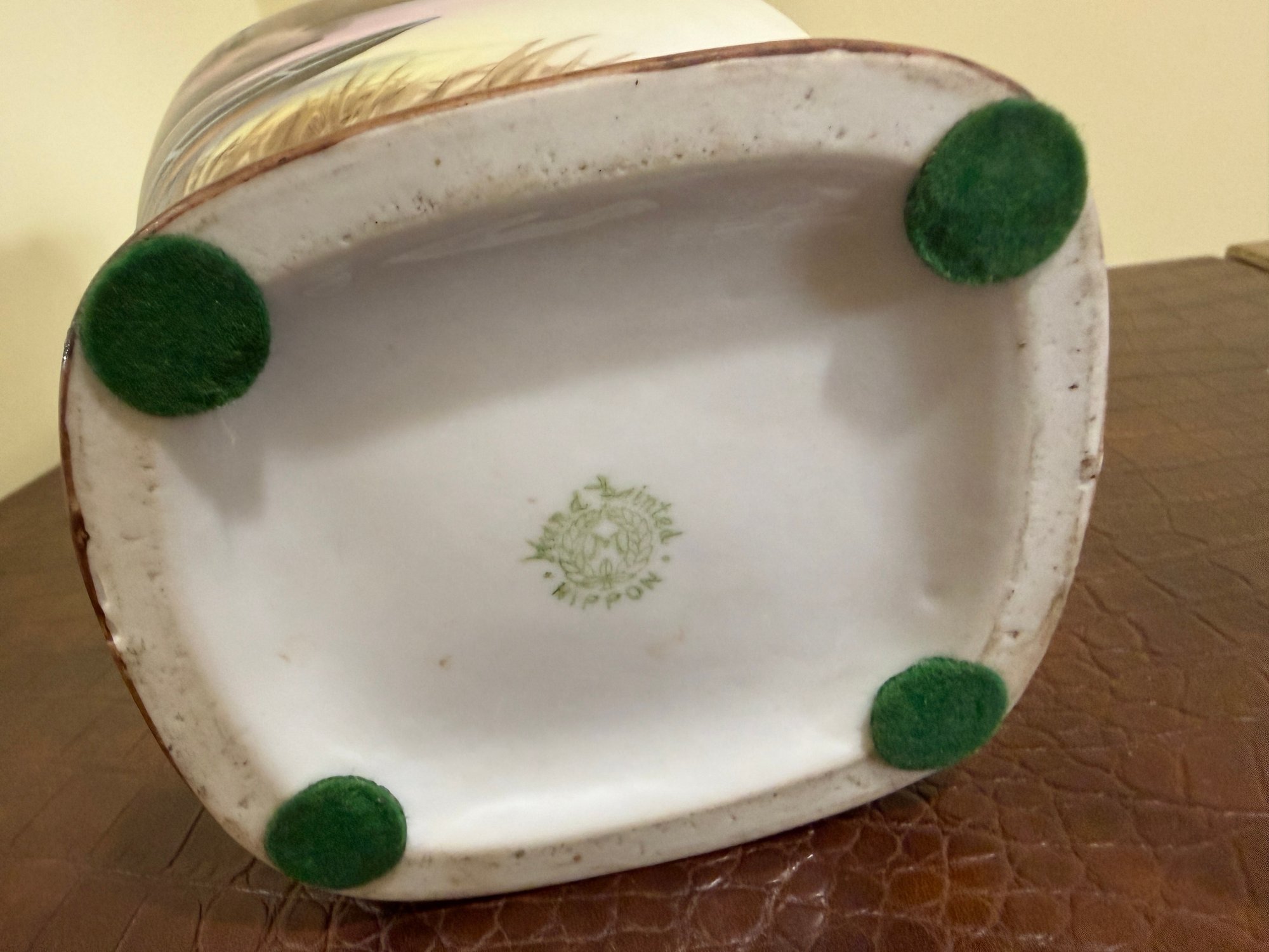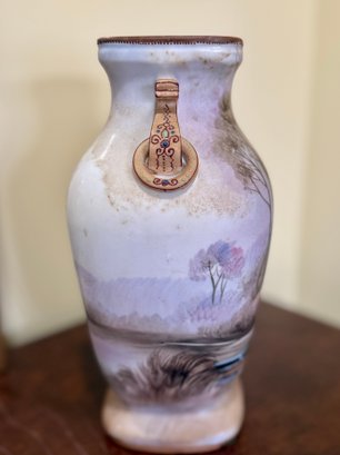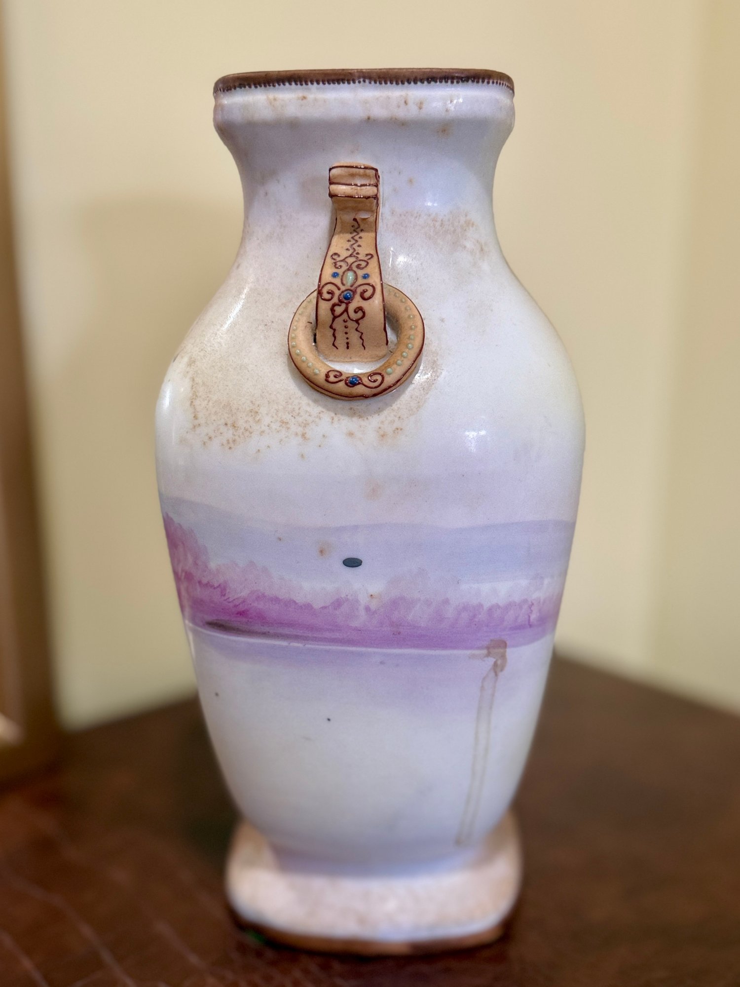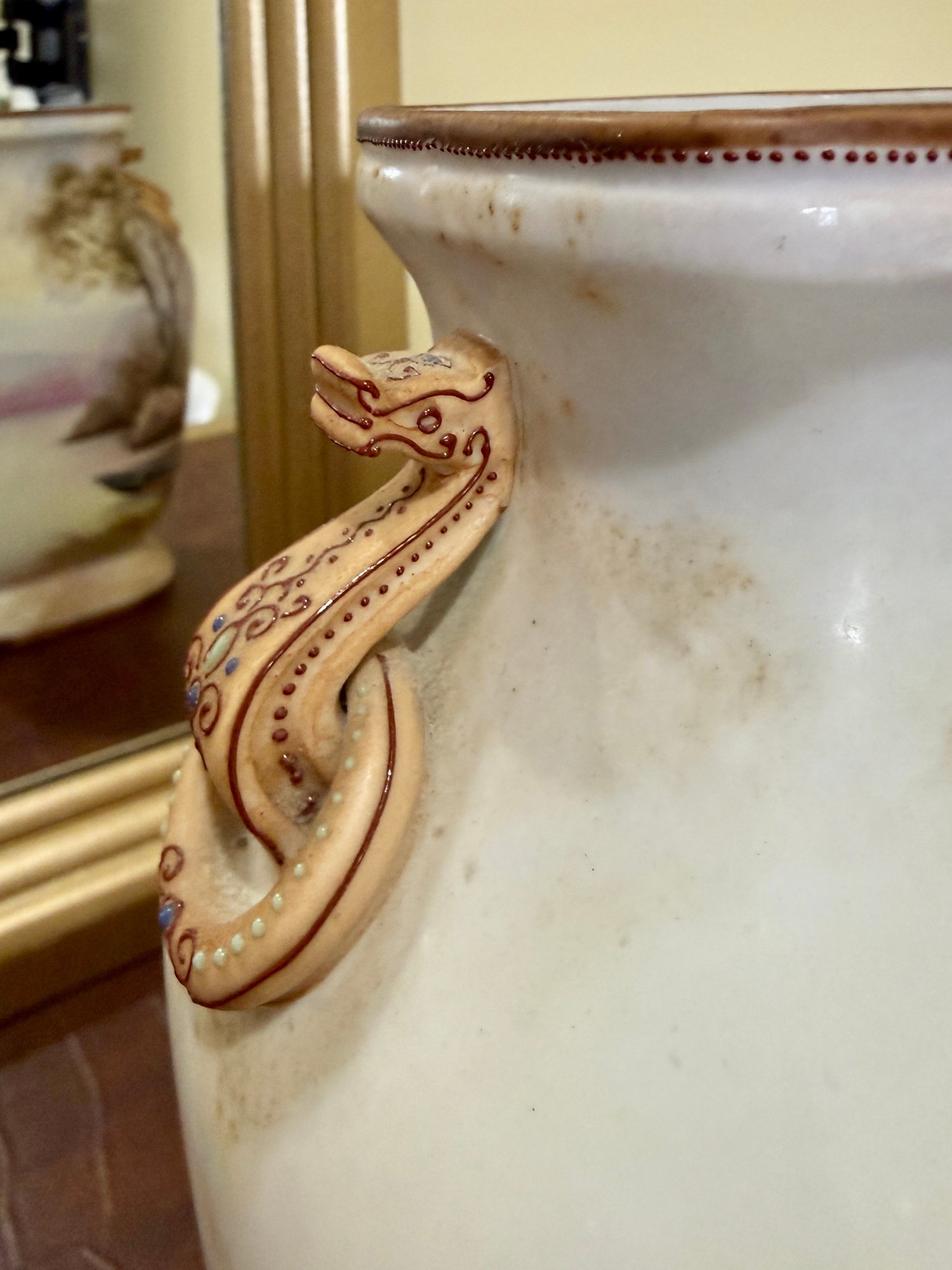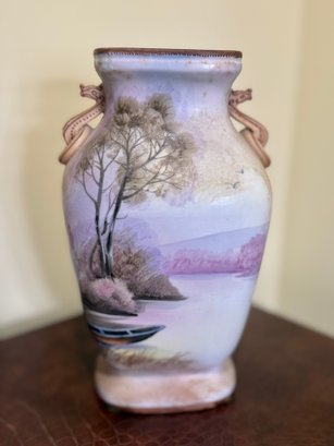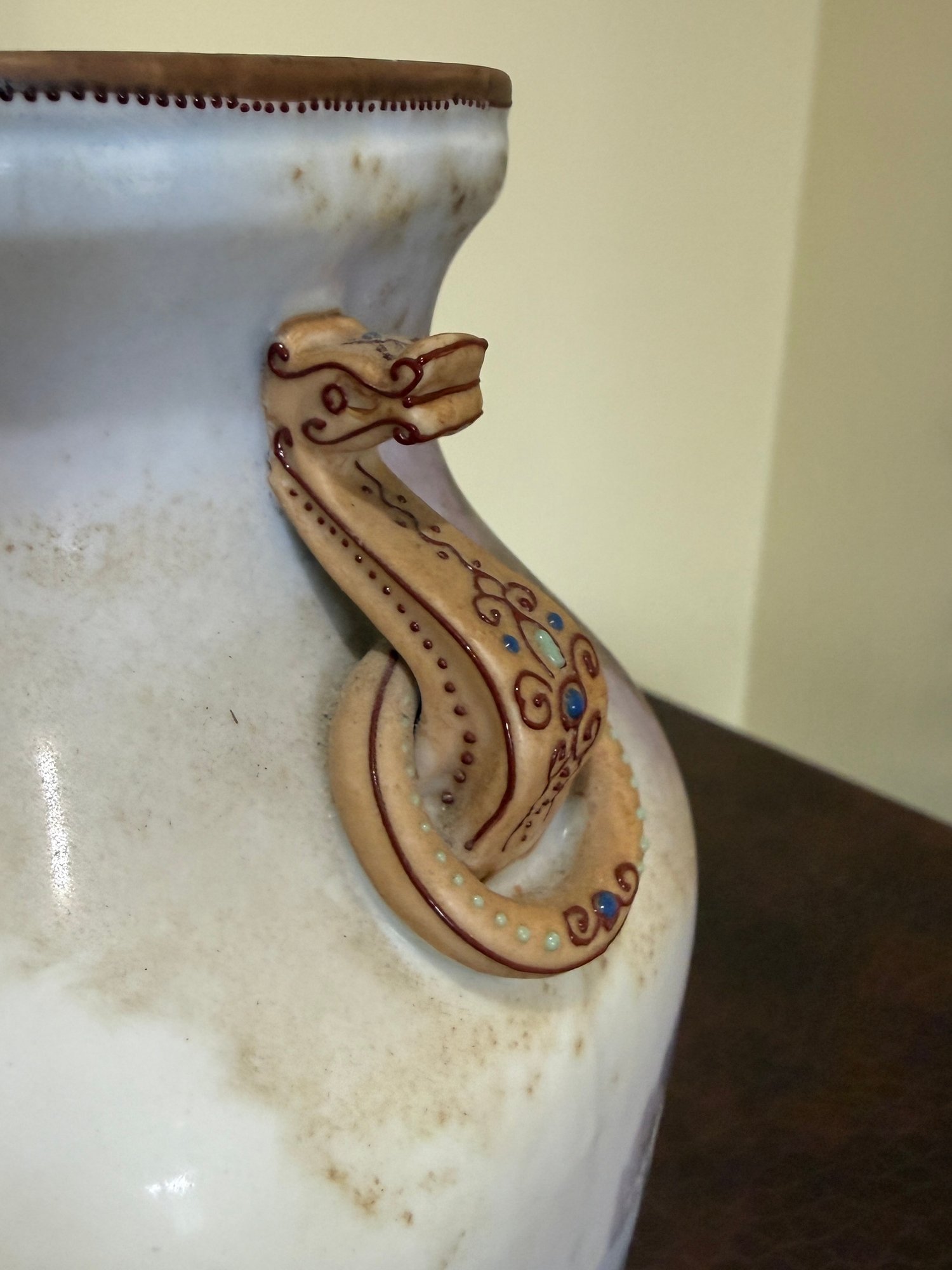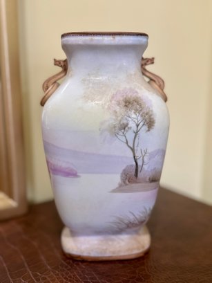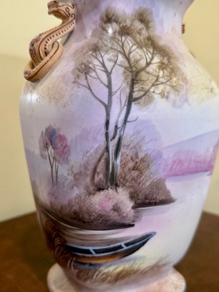 (U-2) ANTIQUE HAND PAINTED NIPPON PORCELAIN VASE WITH SERPENT HANDLES -NEEDS CLEANING -9.5" BY 6"