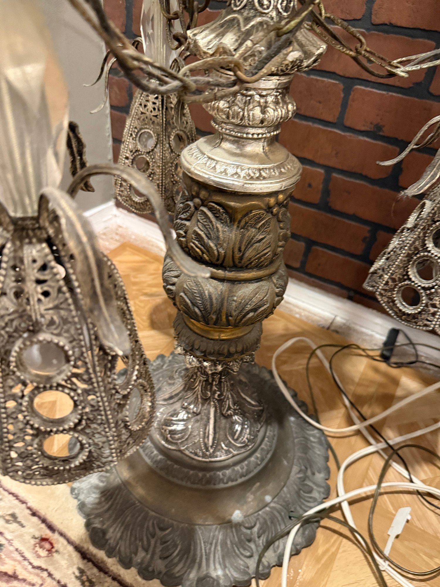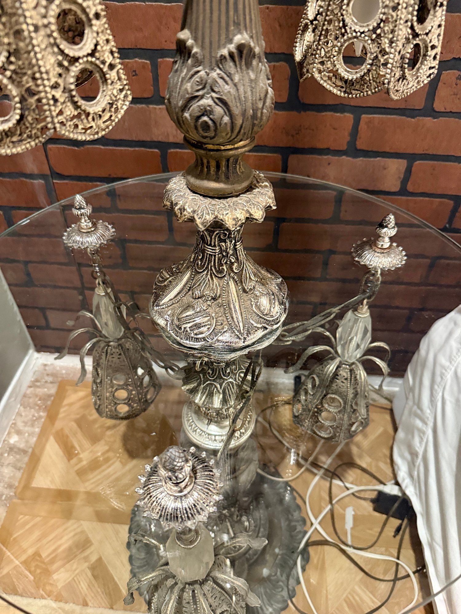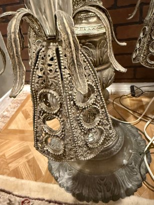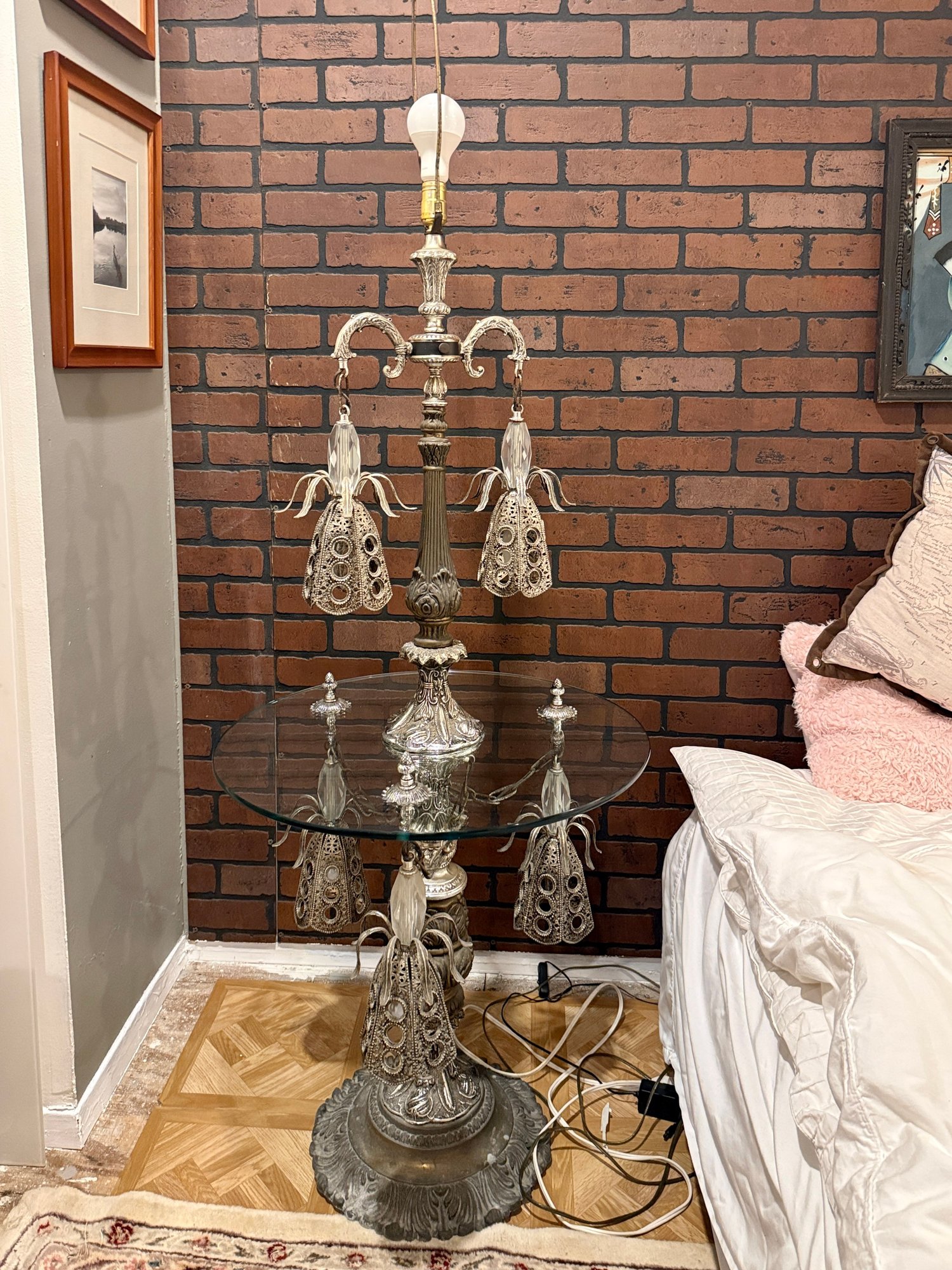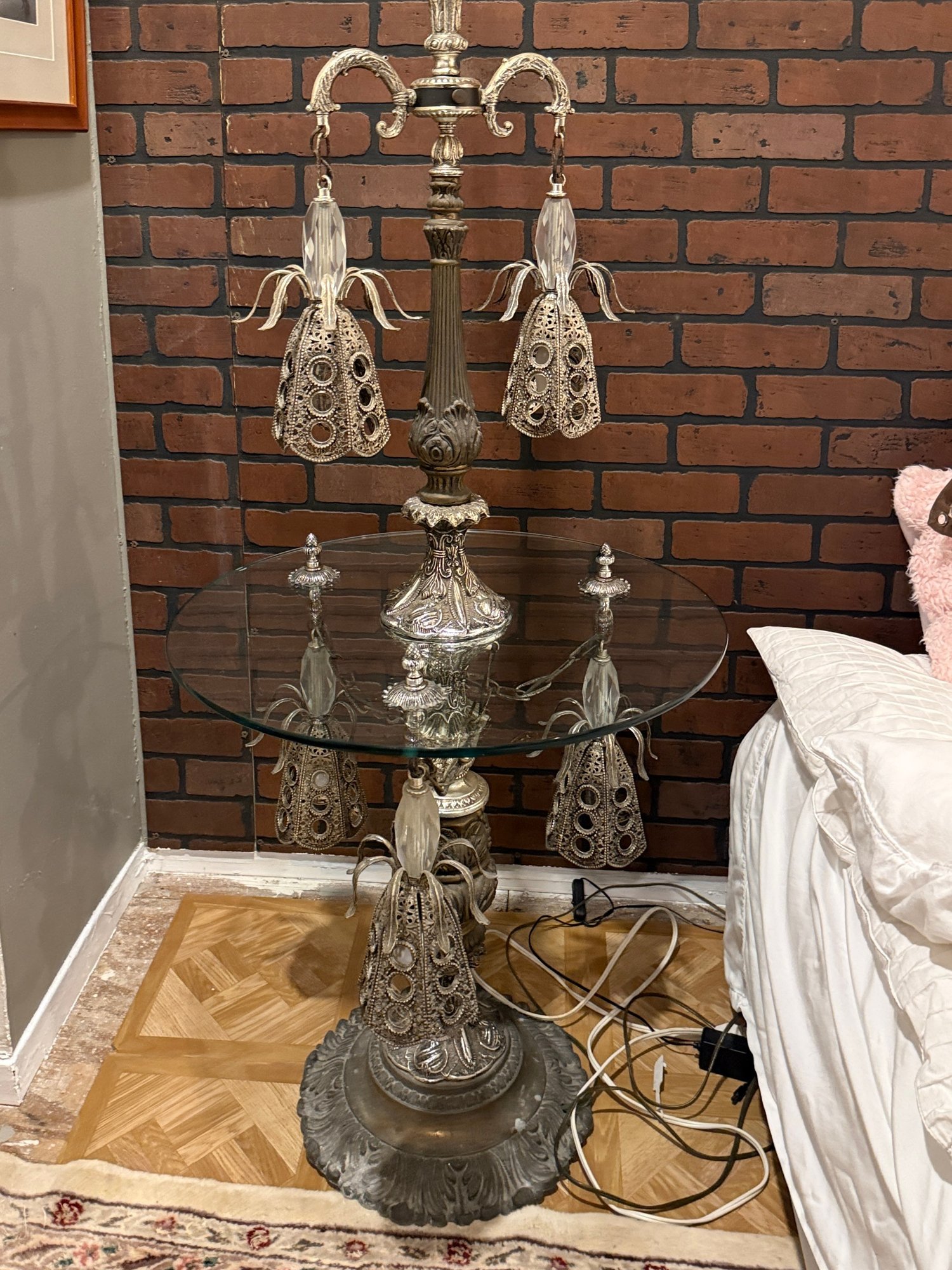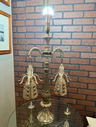 (U-87) VINTAGE GLASS TOP TABLE WITH ORNATE ATTACHED LAMP & LIGHTS UNDER BASE -WORKING -67"H BY 24"W