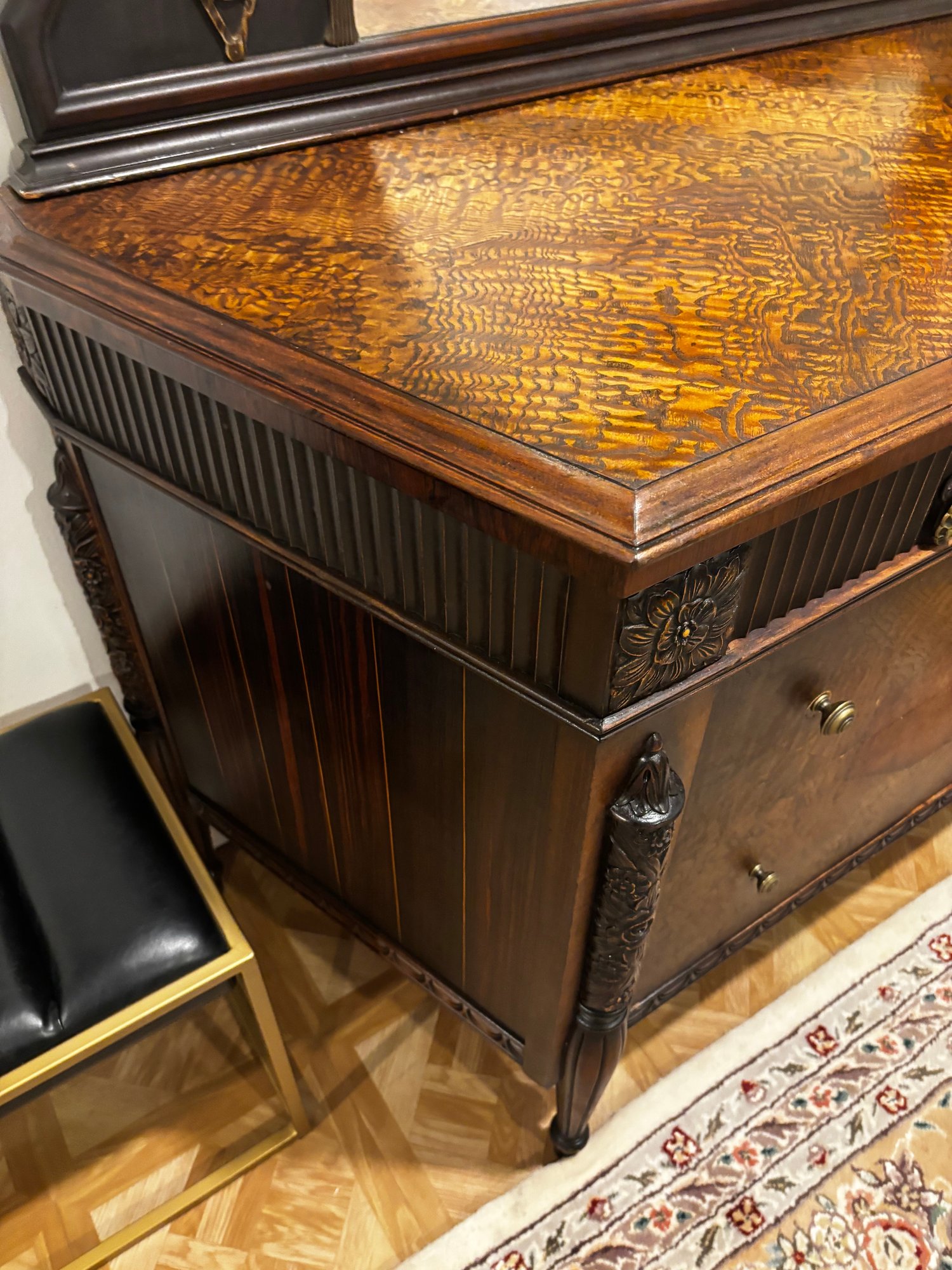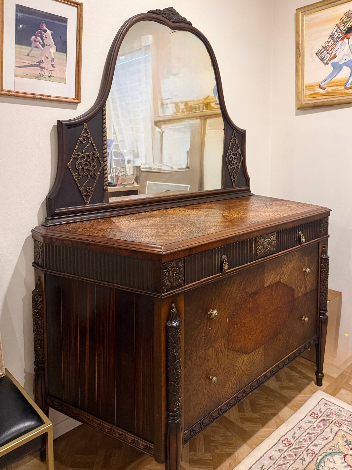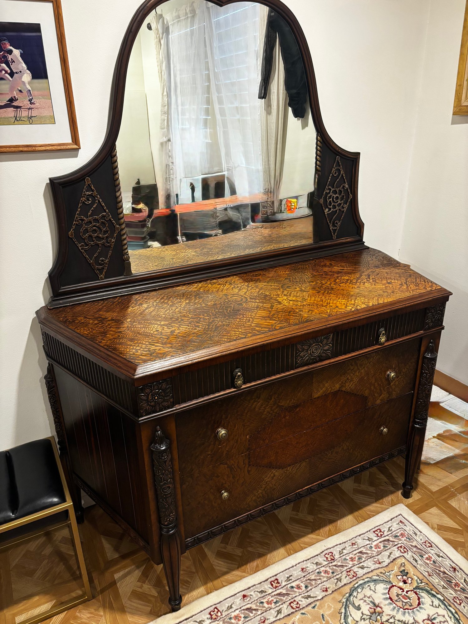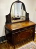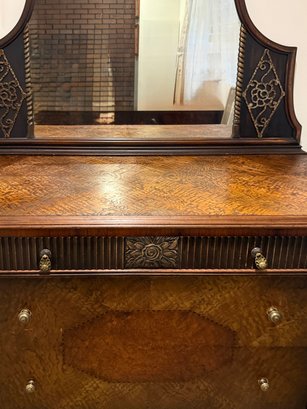 (UPBR) ANTIQUE INLAID & CARVED TIGER OAK DRESSER WITH MATCHING MIRROR- 54" BY 35" BY 23"