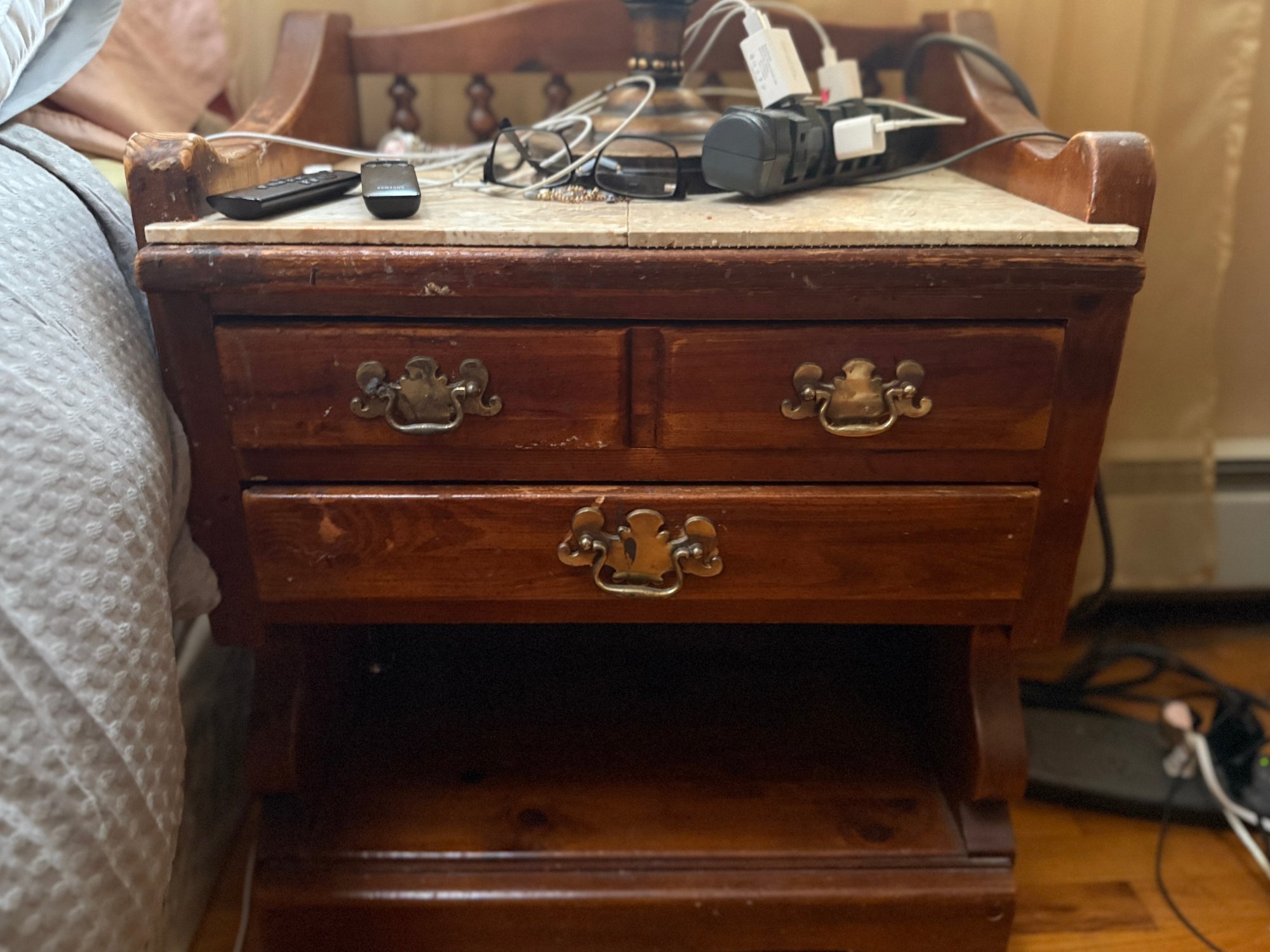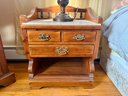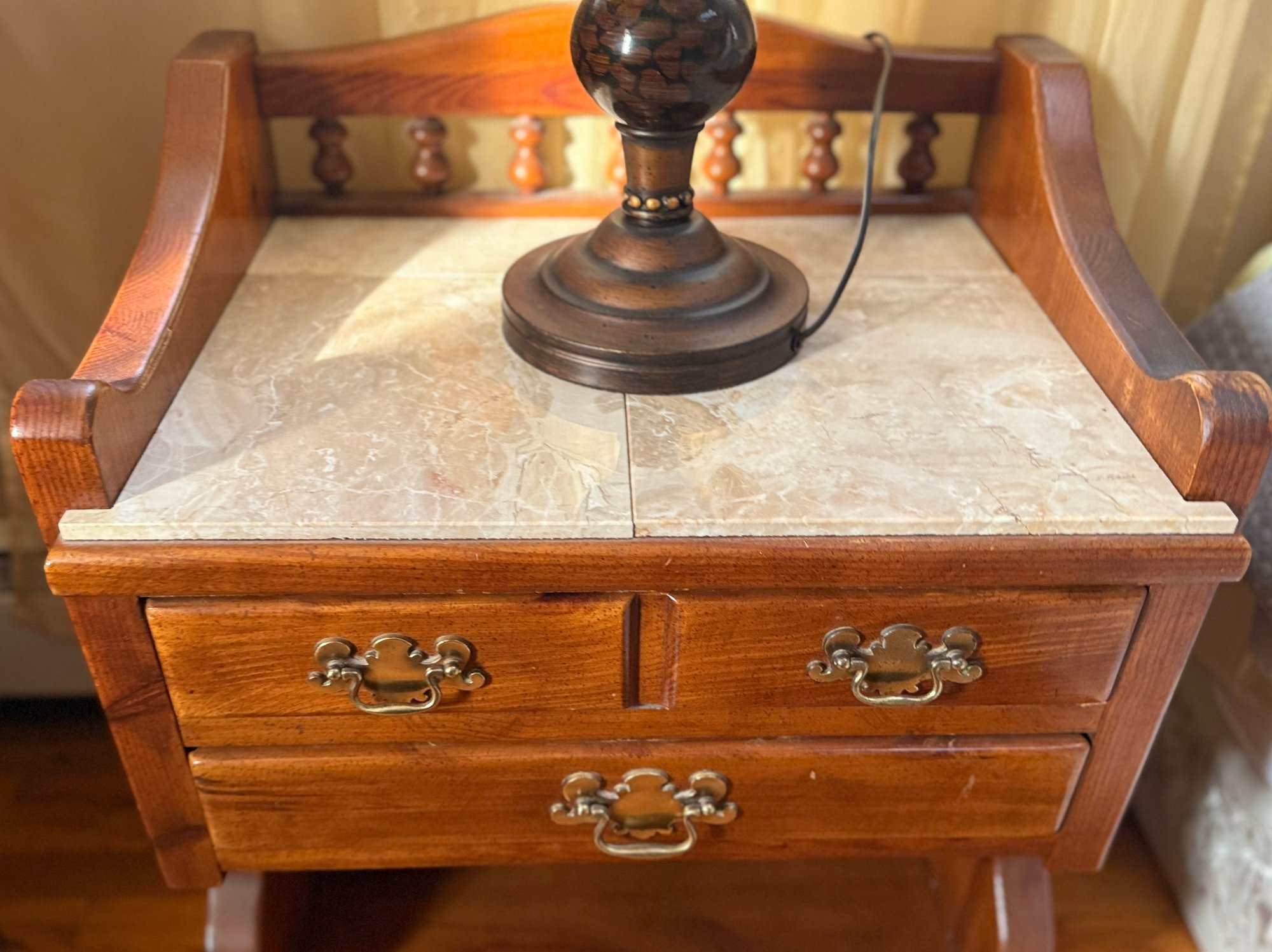 (UPBR) PAIR OF VINTAGE COLONIAL PINE SOLID WOOD NIGHTSTANDS WITH MARBLE TOPS - 24" BY 25"