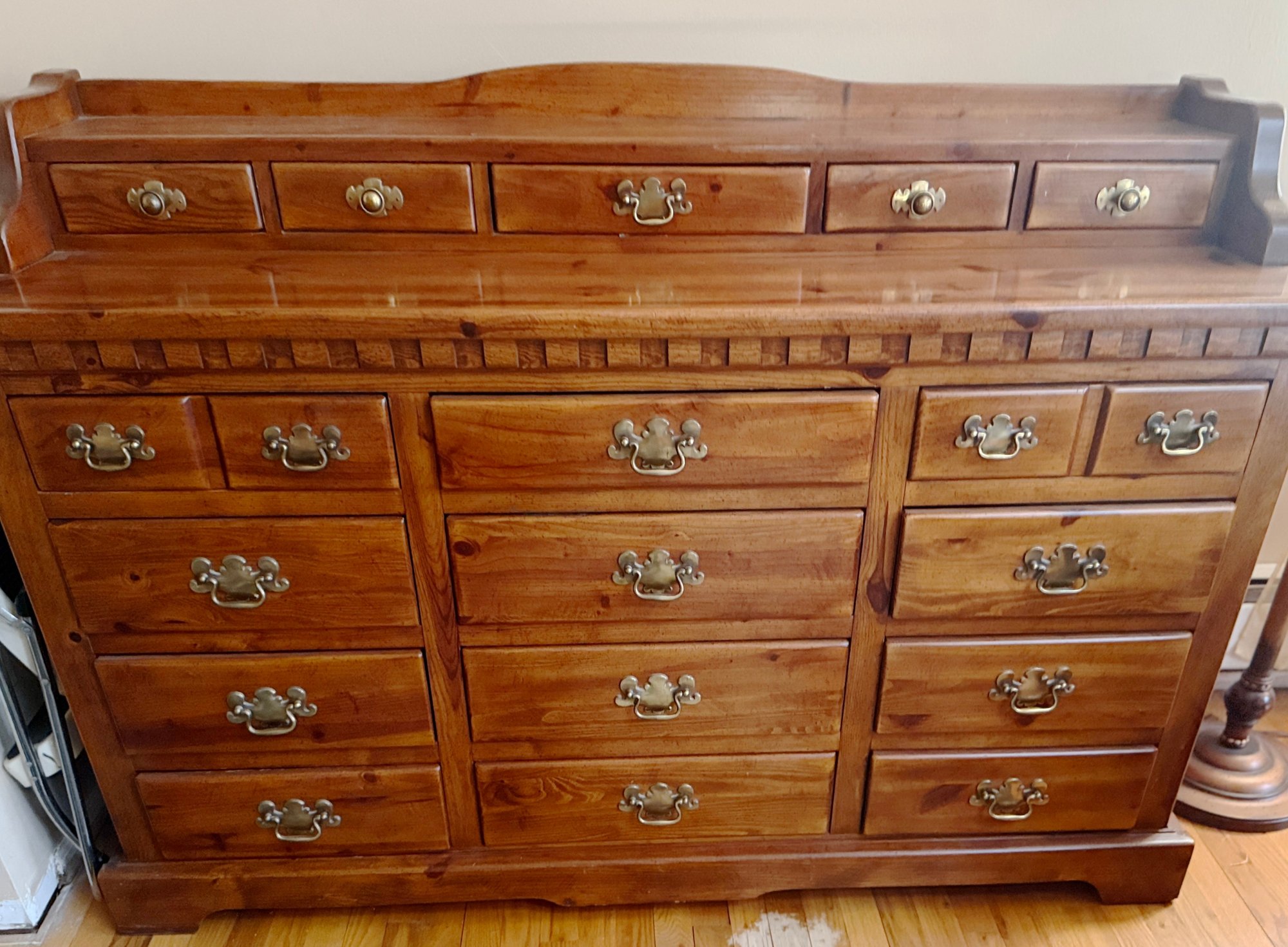 (UPBR) VINTAGE COLONIAL PINE TWELVE DRAWER DRESSER W/ADDITIONAL VANITY DRAWERS -SOLID WOOD- 64" BY 22" BY 36"H