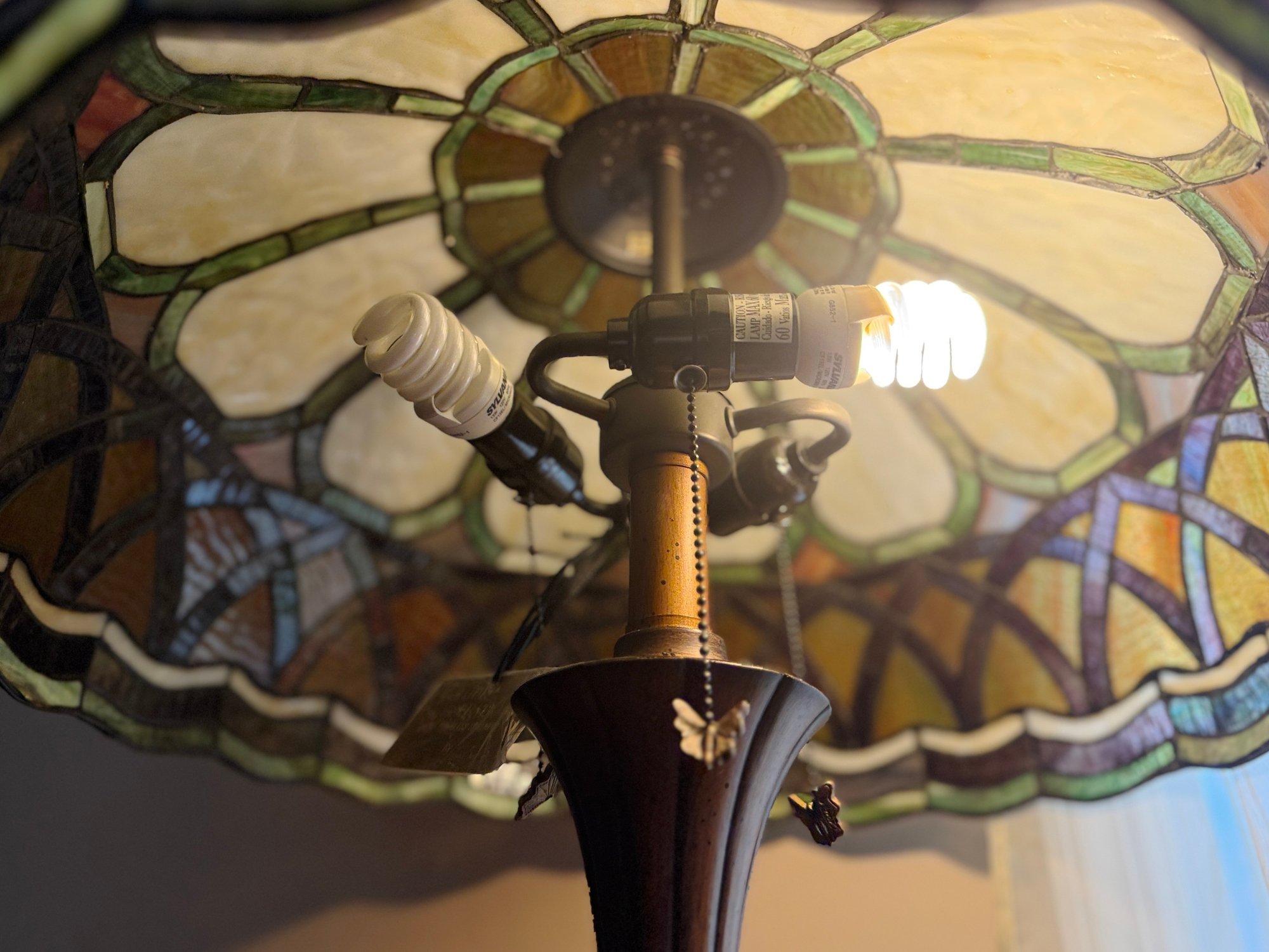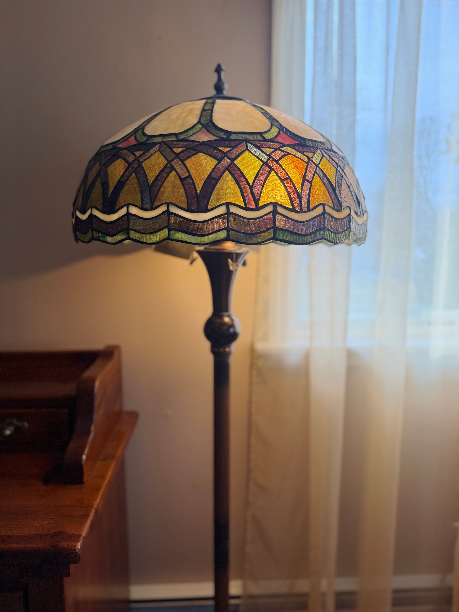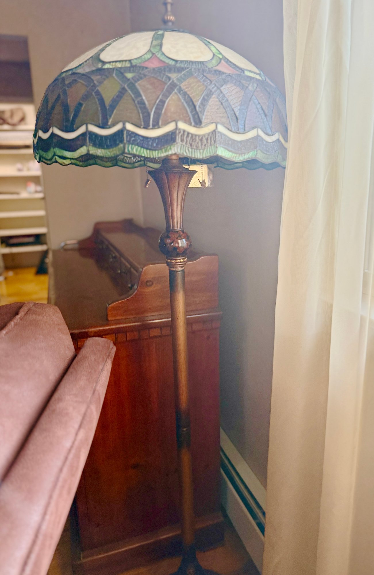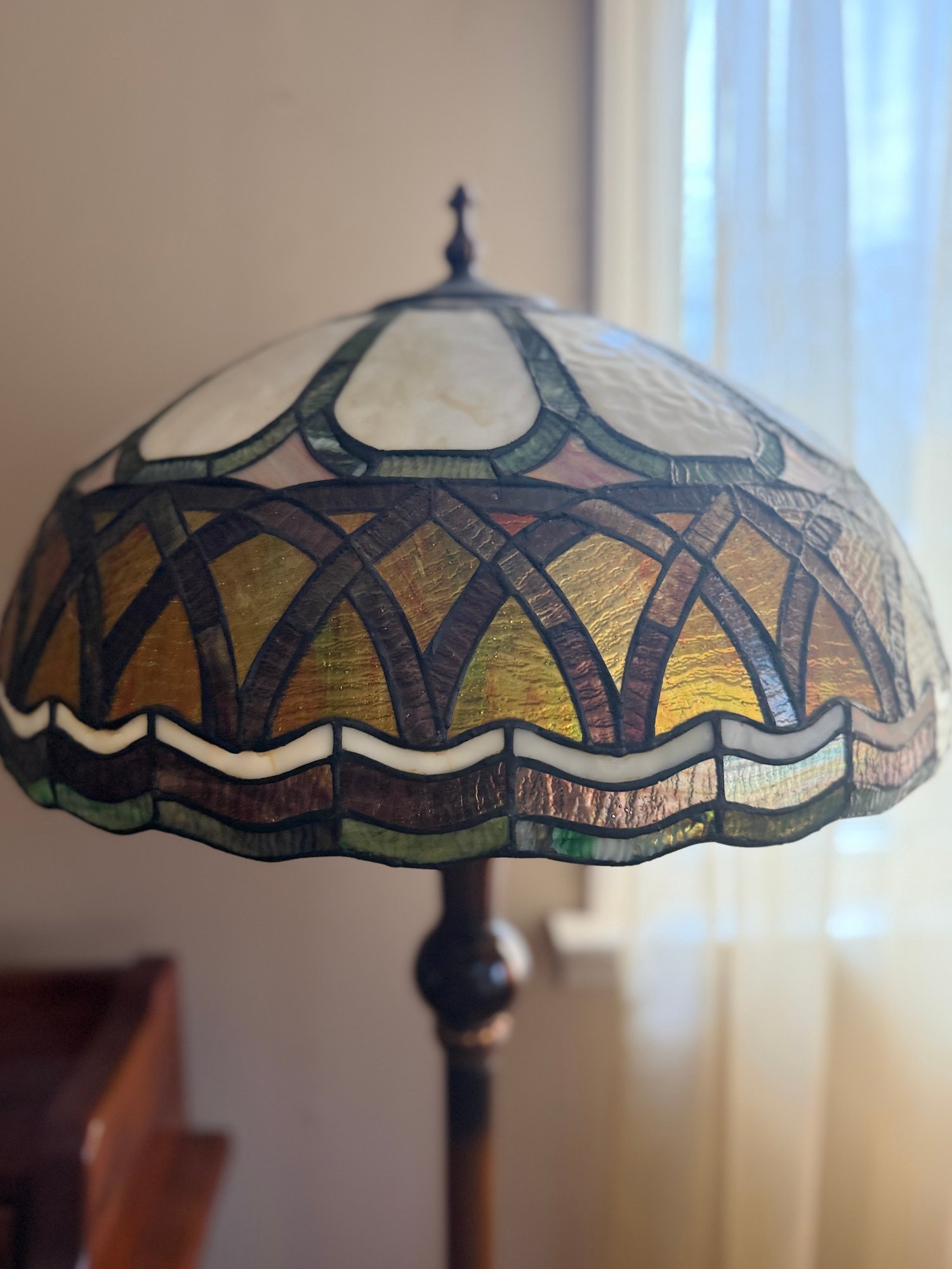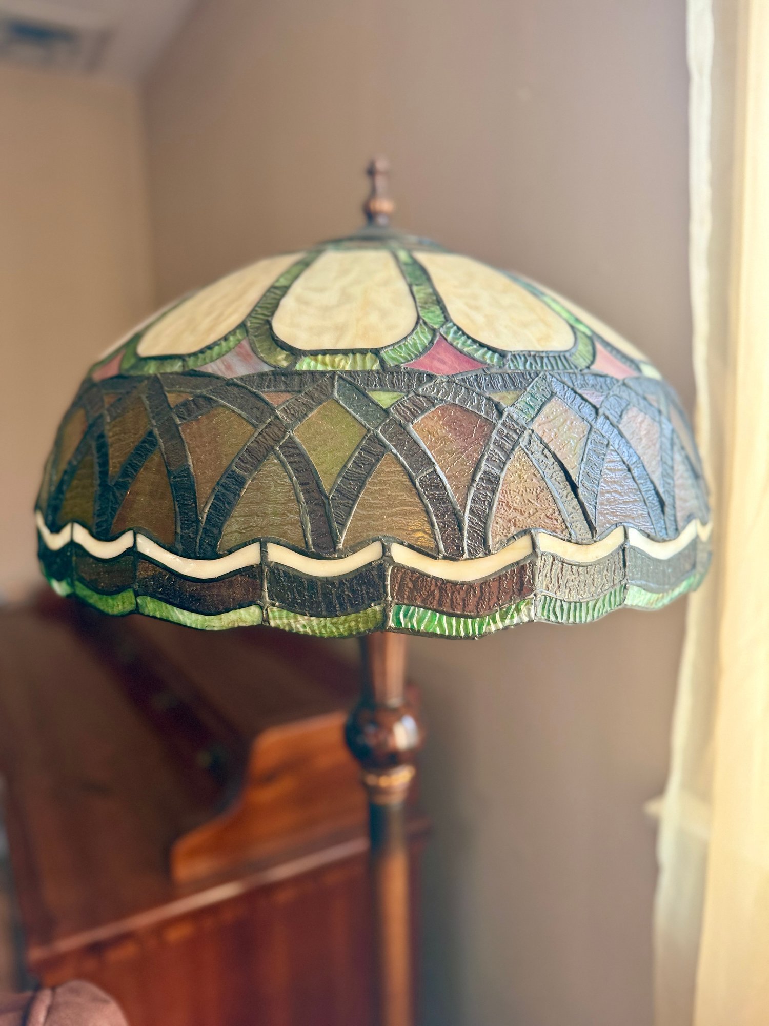 (UPBR) VINTAGE STAINED GLASS FLOOR LAMP WITH AMBER & GREEN SHADE - Approx: 62" BY 32" W