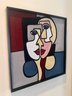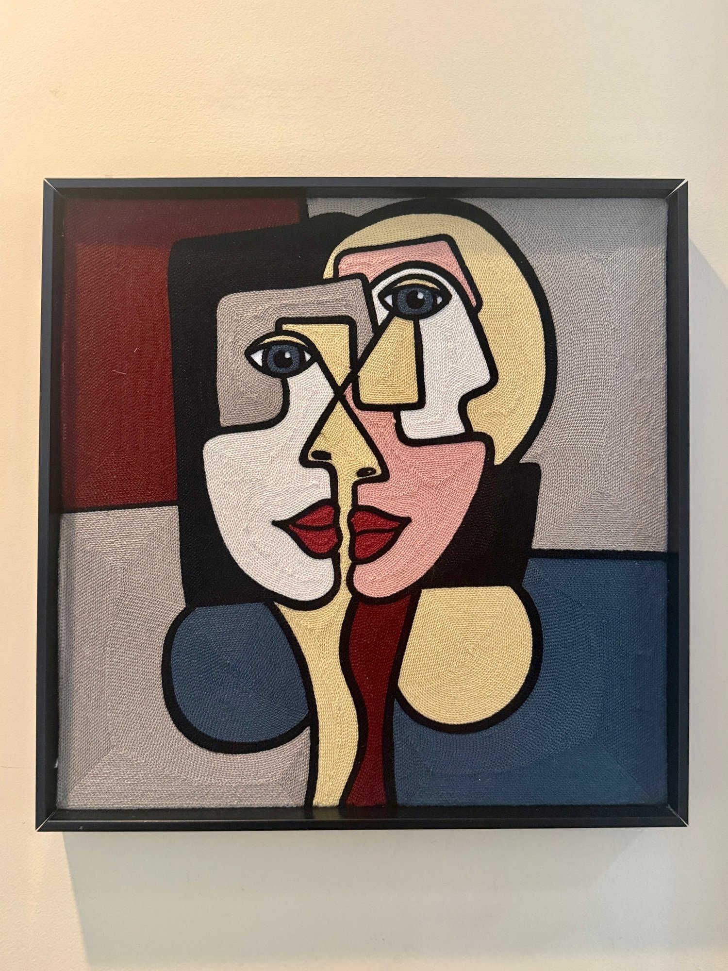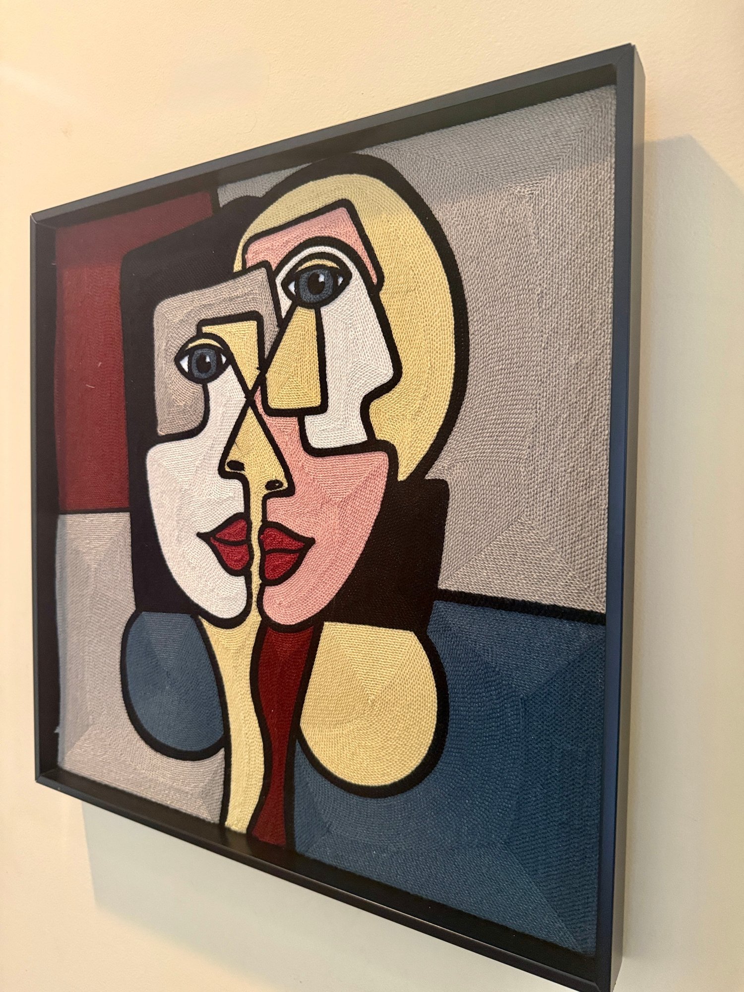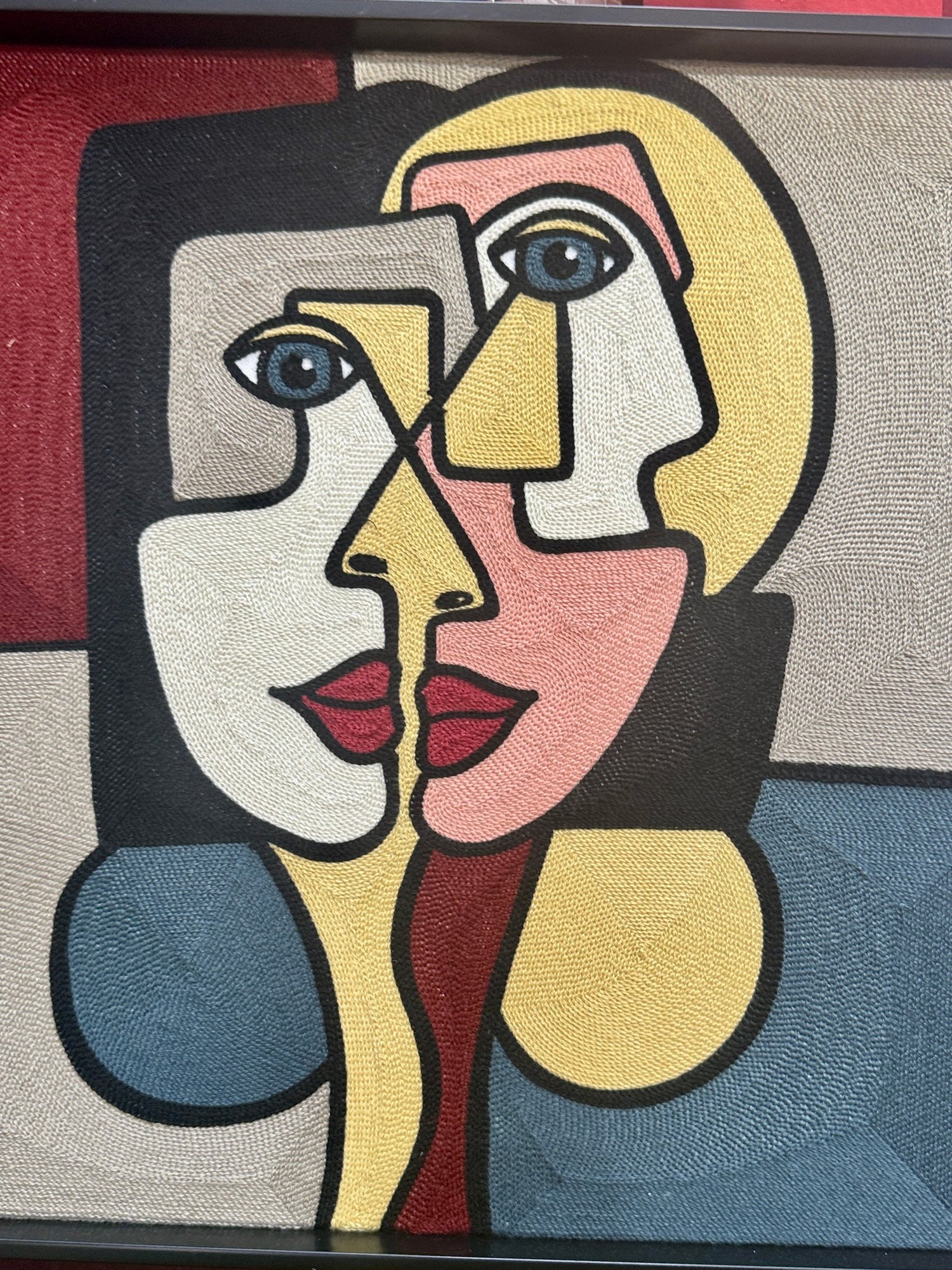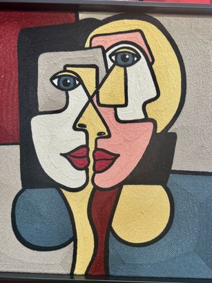 (UPHall) FAB VINTAGE HAND CREATED NEEDLEWORK TEXTILE WITH MODERNIST FACES -18" BY 18"