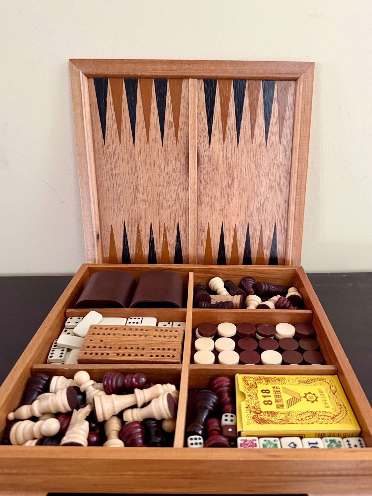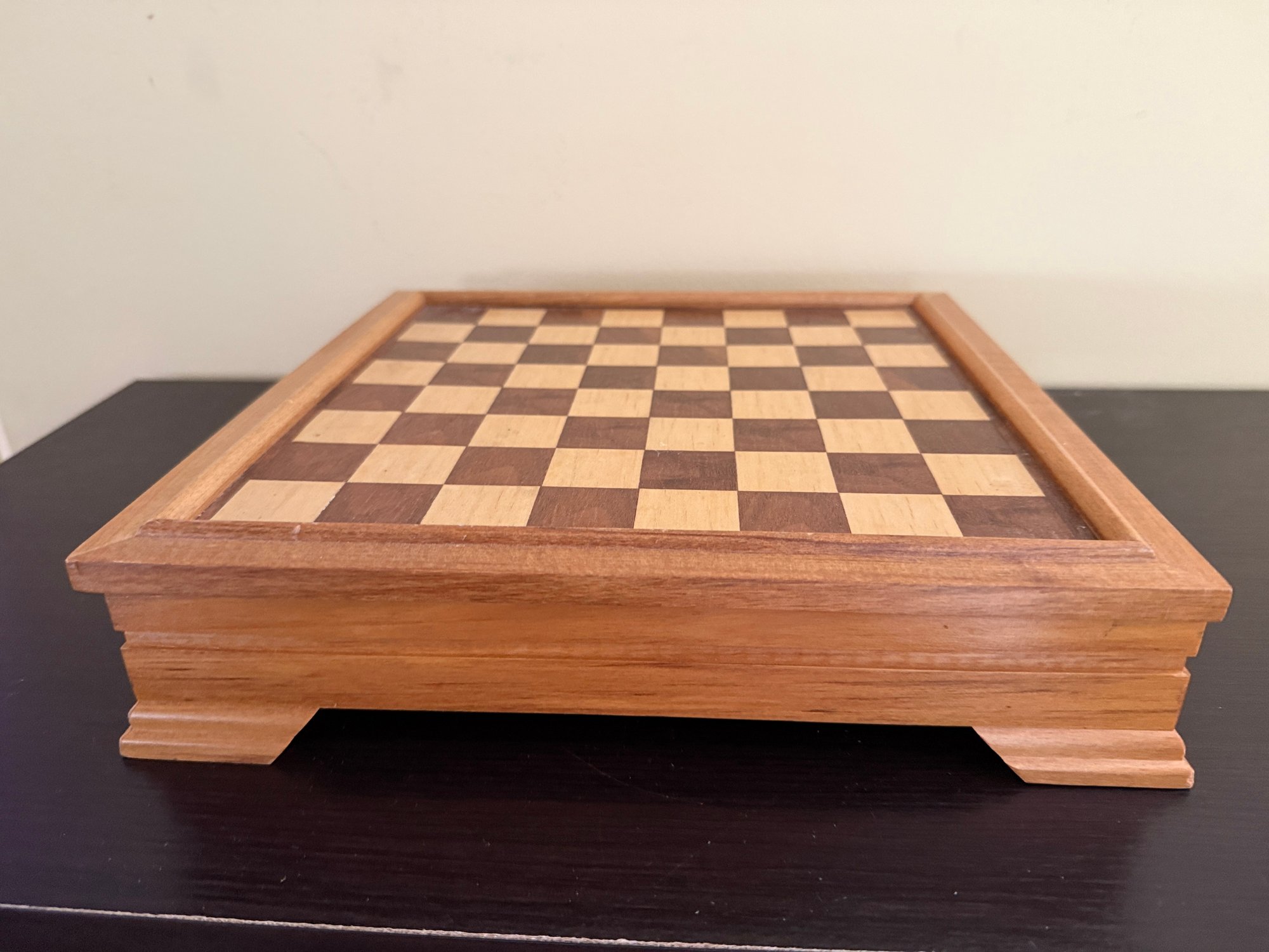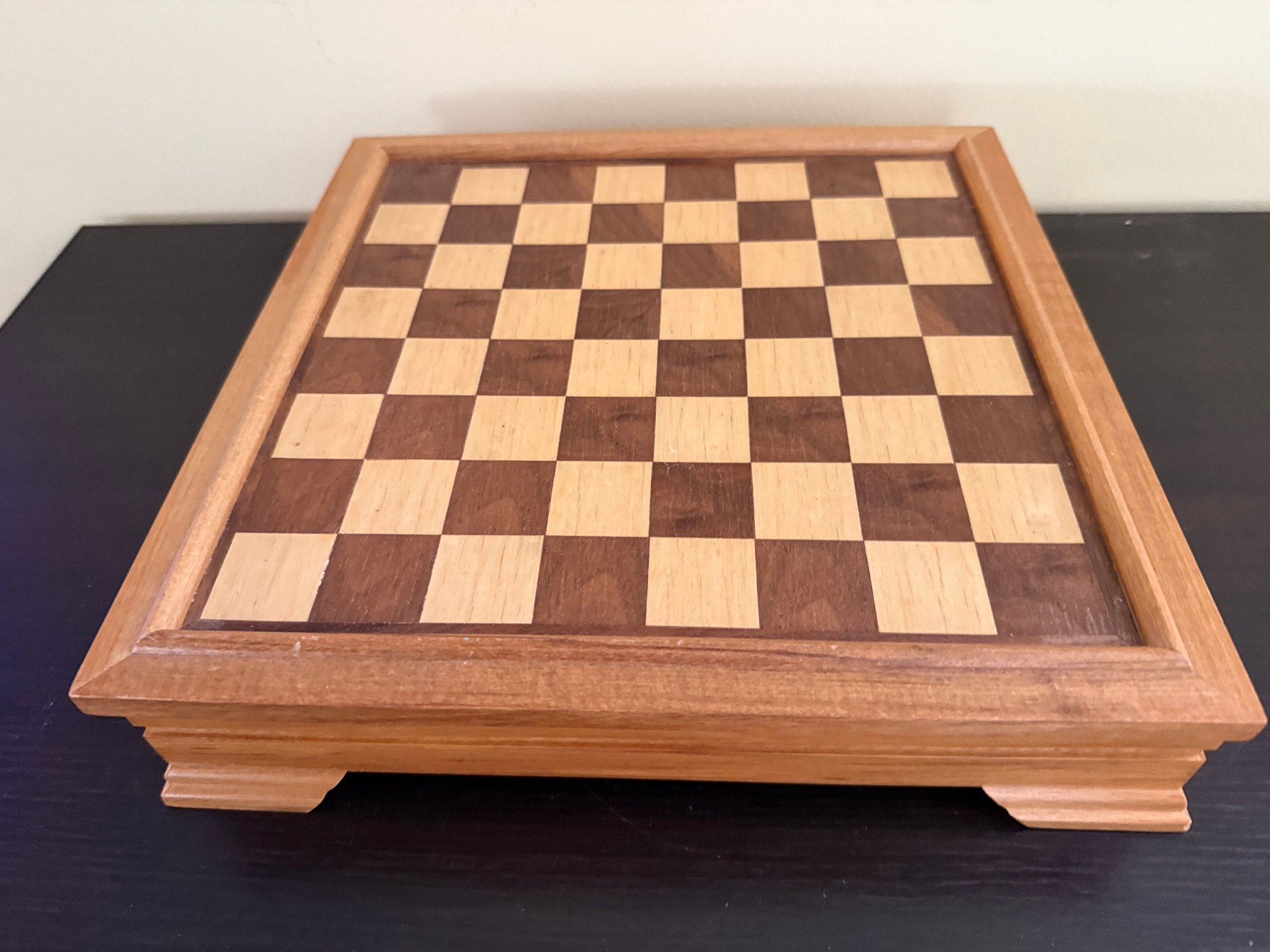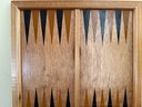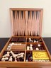 (P) WOOD CHESS / BACKGAMMON / CHECKERS SET WITH STORAGE FOR PIECES -15"
