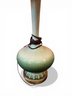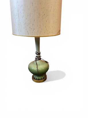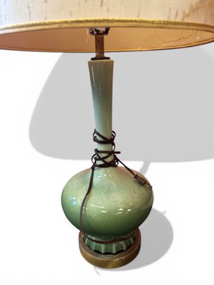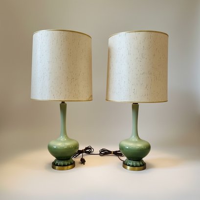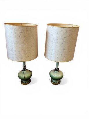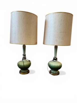 Stylish mid-century modern pair of two light green table lamps. Gourd shaped. There is a stain on one lampshade, which could be turned to the back of the lamp where it would be unseen. The shades are otherwise original, with a great shape and texture, but they can obviously be replaced as well.