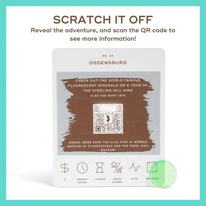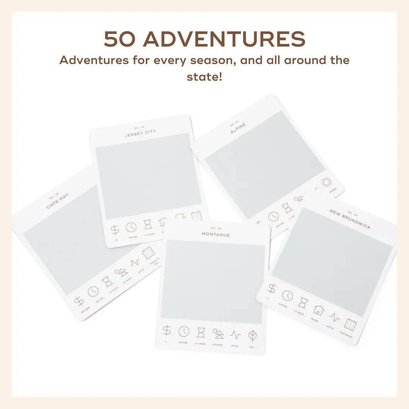 50 scratch off bucket list adventures around the state of New Jersey. Pick a city that you want to explore, check out the icons at the bottom of the card to determine the season, cost, and time of day, and then scratch off the card to reveal your adventure!