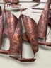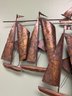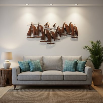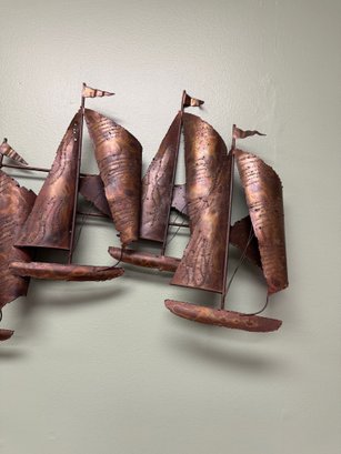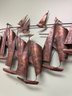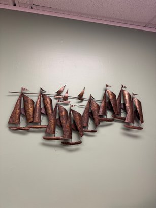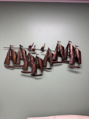 Large MCM vintage metal wall sculpture with nautical theme. This is over four feet wide and several inches deep, with an almost rippling effect that gives a sense of movement. Fits perfectly centered above a sofa.