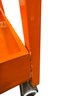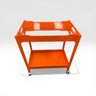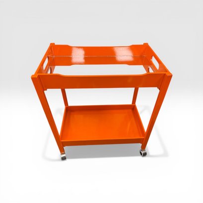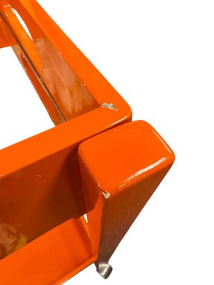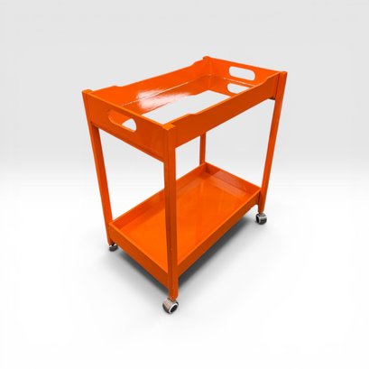 This bright, shiny orange bar cart is so fun and modern — but it does have a pretty decent wobble. A handy person can probably tighten it up, but no guarantees! If it isn’t moved, it’s stable, but try to roll it and it leans. The top shelf is a mirrored surface. Store the bottles beneath, make the drinks on top!