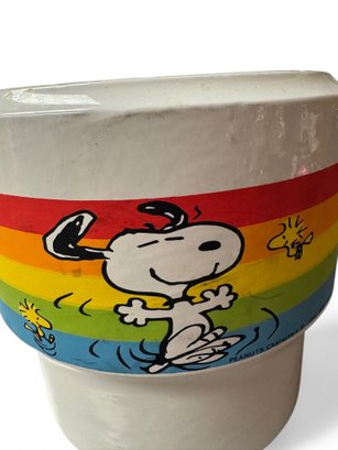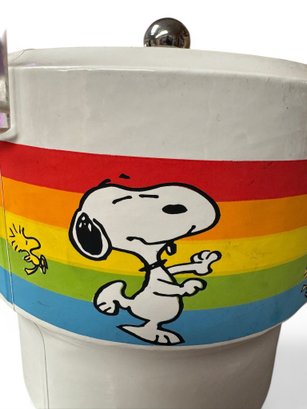 Snoopy!! Super cute retro 70’s Peanuts ice bucket with a clear handle. Rainbow stripes and Woodstock, too. 100% Dopamine booster! Perfect for a fun, retro bar, or any collector of Snoopy merch.