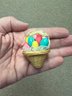Charming vintage Easter pin or brooch, shaped as a basket with colorful Easter eggs and fabric flowers, tied with a super cute bow at the top. Not sure whether it’s ever been worn — there’s a sticker on the back that reads “GW.”