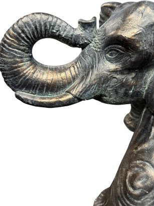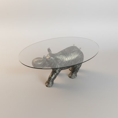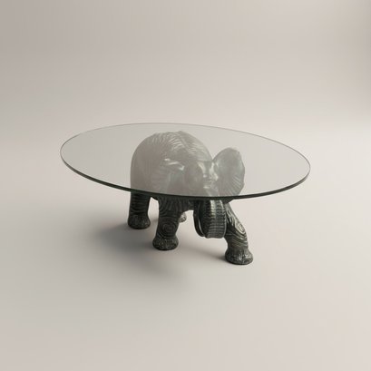 Coffee or occasional table with lucky elephant with its trunk up. Tabletop is thick oval glass, and is removable. Could also use this without the glass if desired. Not sure what it’s made of, but it’s super heavy. Perfect for bohemian, retro, and global decor. Elephant is grey/blue with a beautiful patina.