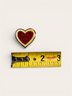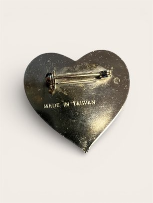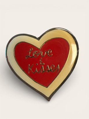 Super sweet little heart-shaped vintage Valentines Day pin that says “Love and Kisses.” Front has 3 concentric hearts — a red heart inside a yellow heart inside a gold heart. Back is stamped Made in Taiwan. Adorable!
