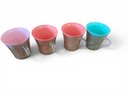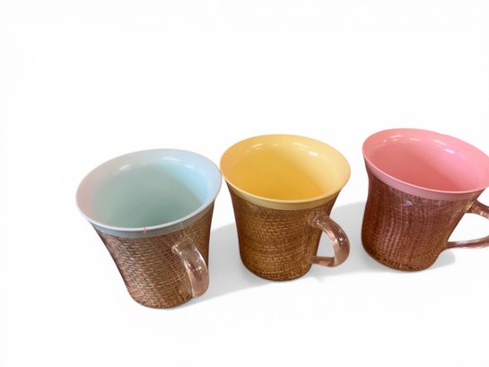 Fun, retro multicolor set of six Raffiaware mugs, perfect for tiki-inspired drinks! Pink mug has a chip.