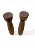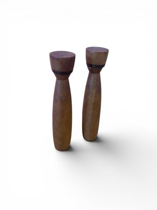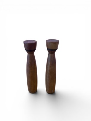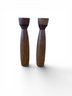 Two matching Mid Century Modern tall wooden salt and pepper shakers