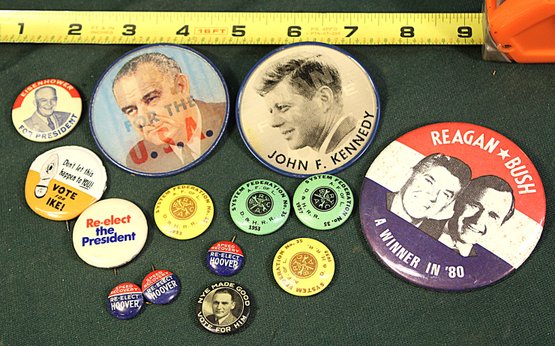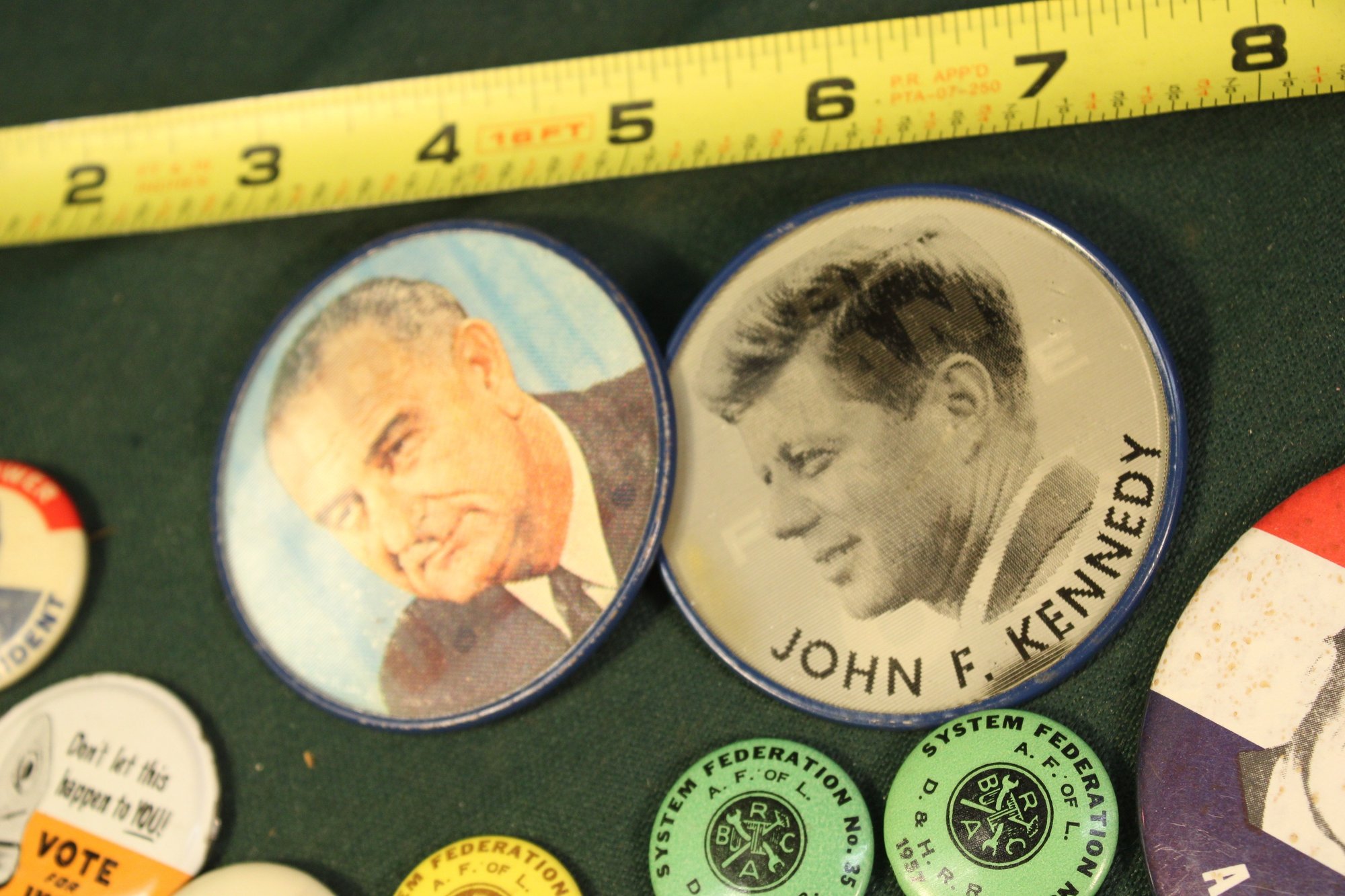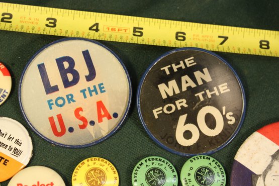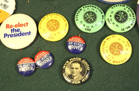 10 Political Pin Back Buttons & 4 Rail Road System Federation Pins (57)