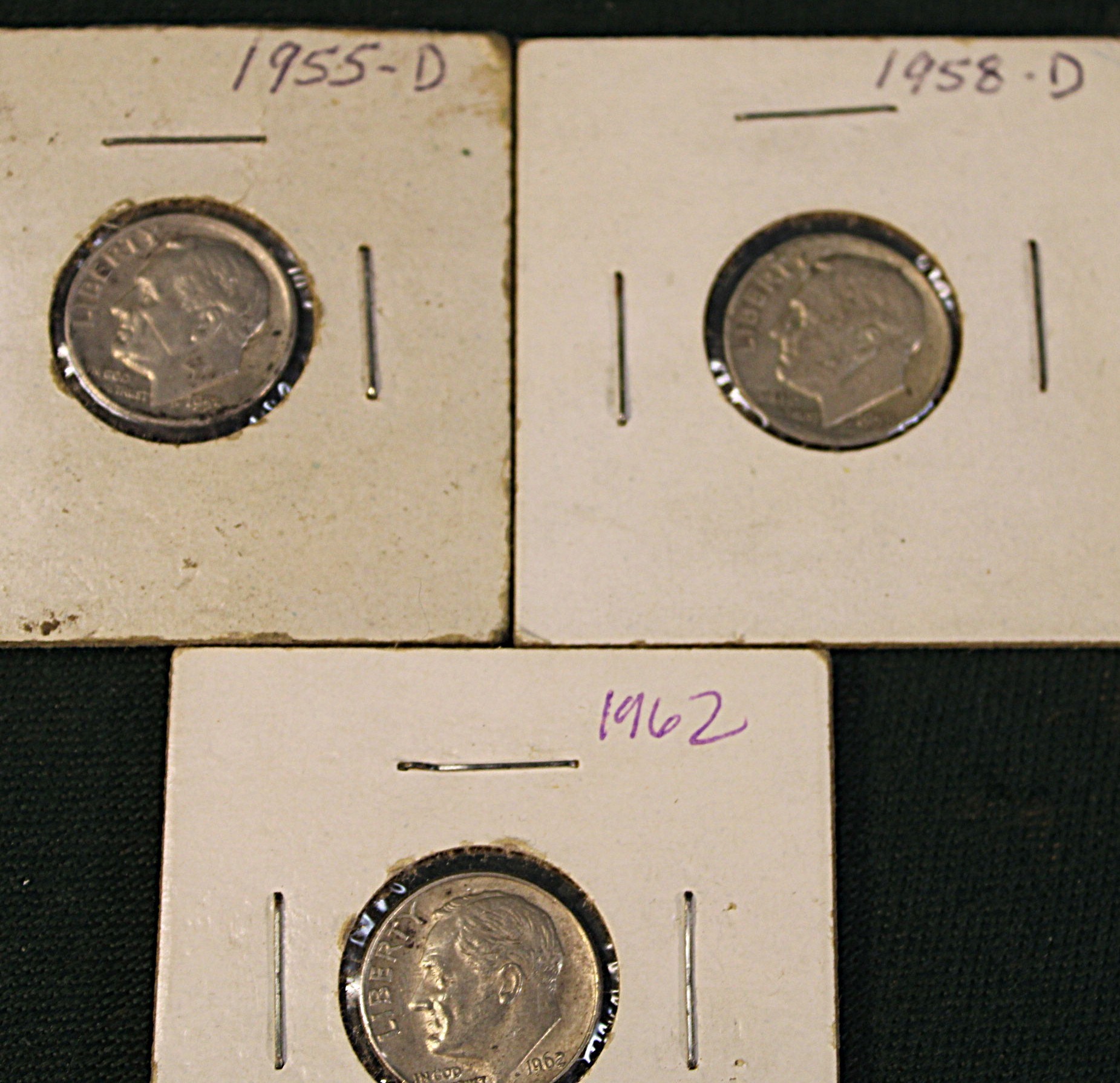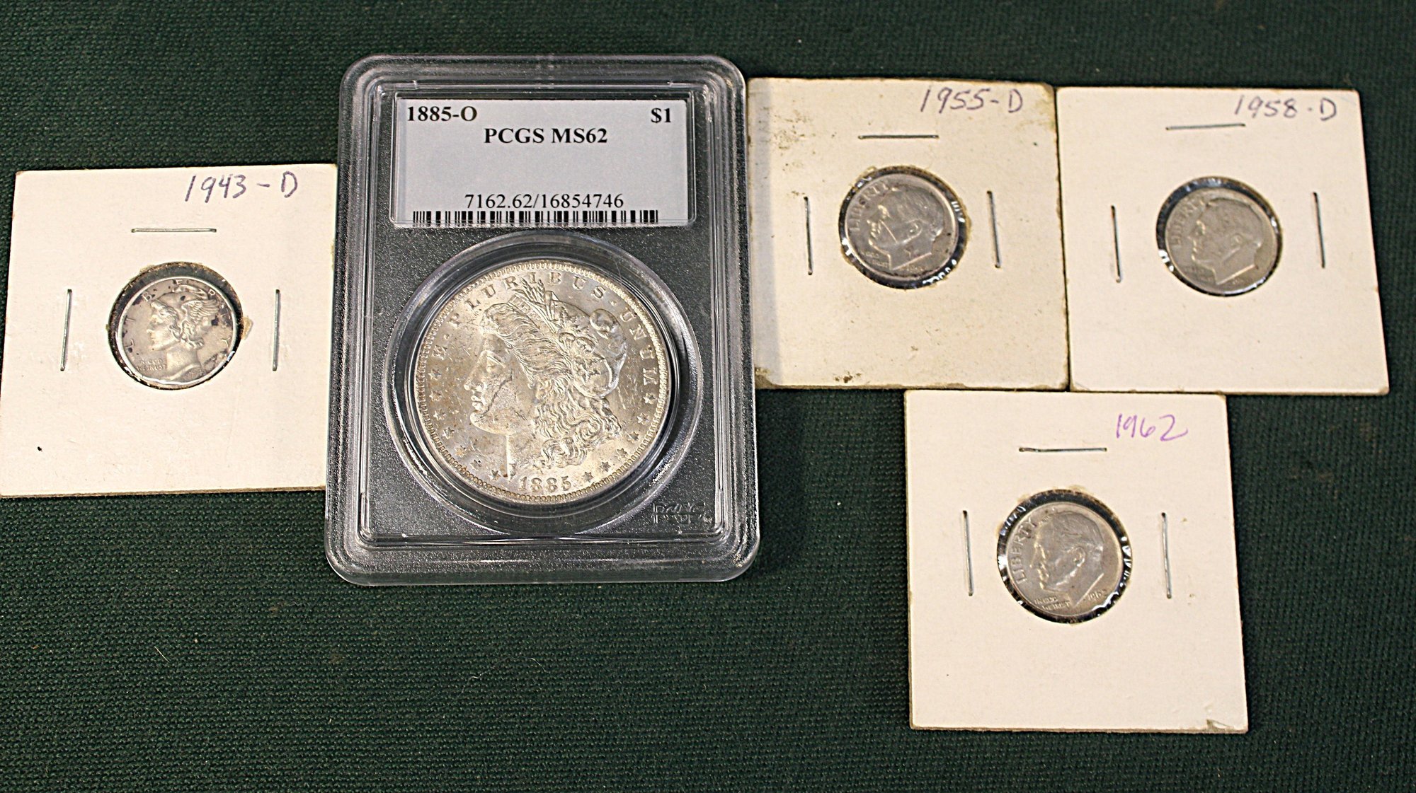 1885-D Slabbed MS62 Morgan Silver Dollar, 1955D, 1958D & 1962D US Roosevelt Dimes & 1943D Mercury Dime (381)