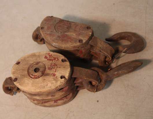 2 Antique Wooden Pulleys With Iron Hooks (One Broken) (312)