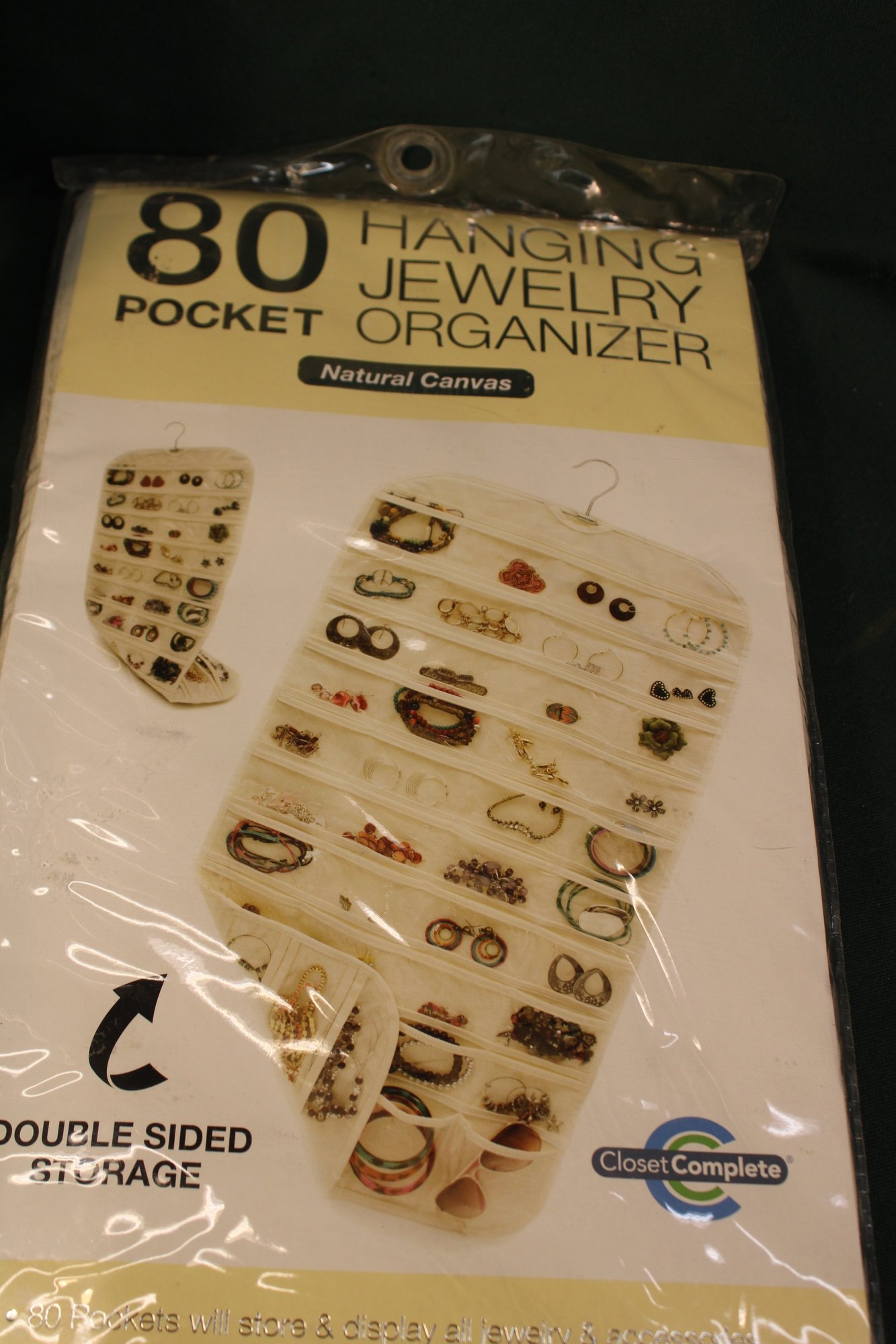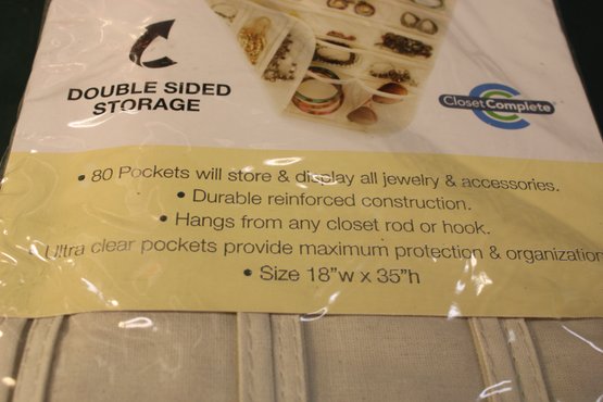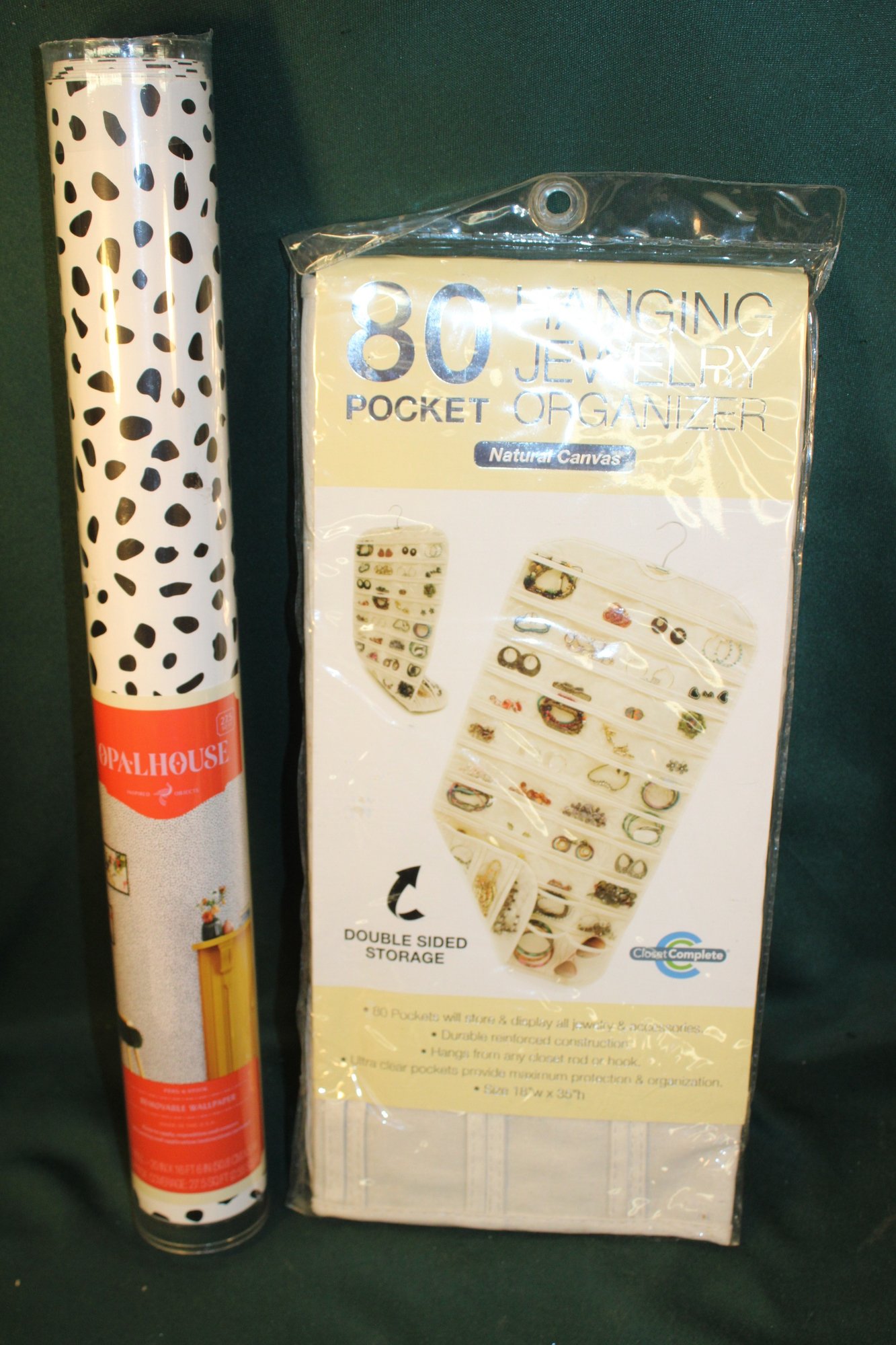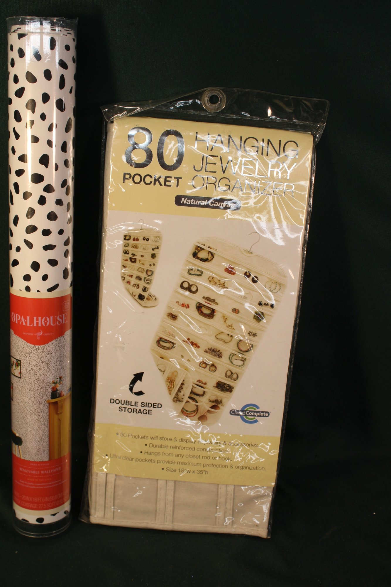80 Pocket Hanging Jewelry Organizer (18x35") & 27.5 Sq Ft Removable Wall Paper, 20"x16'6" (128)