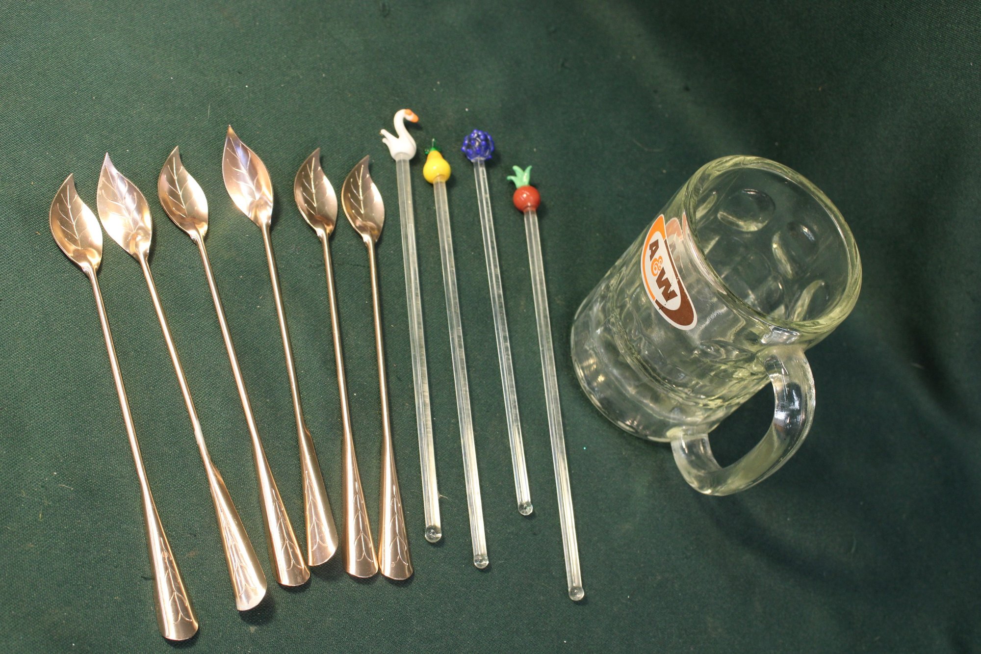 A&W Mug W/4 Glass Swizzle Sticks & 6 Leaf Spoon Stirrers (161)